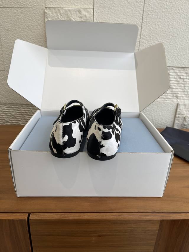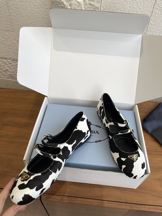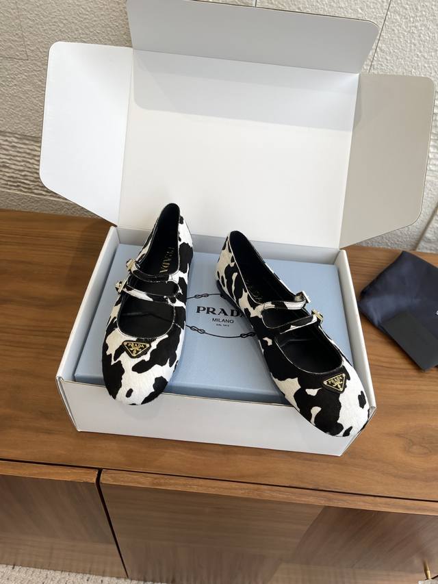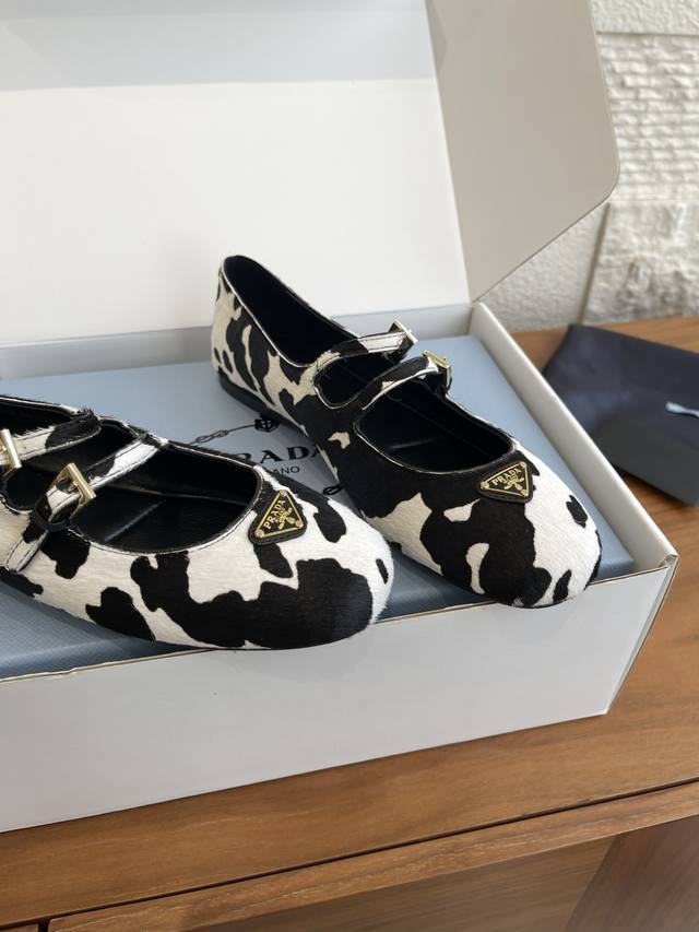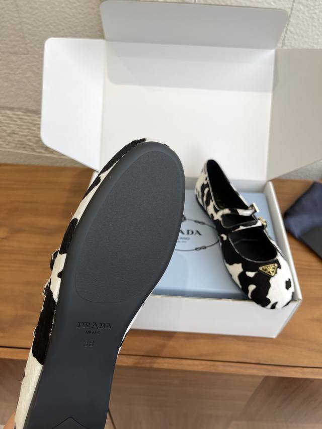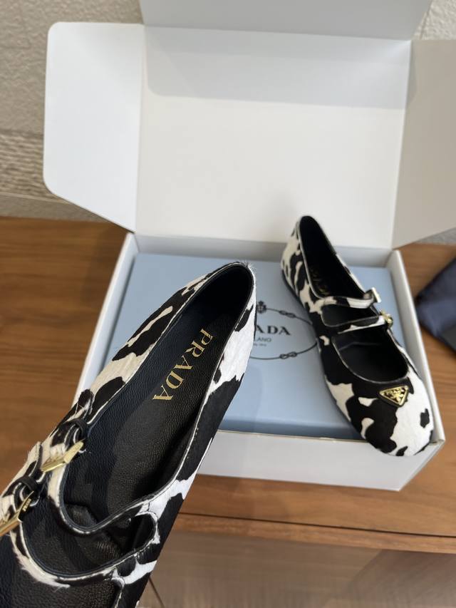Top Version: Comes with exquisite boutique box. Prada 25Ss Autumn/Winter New Round Toe Double-Strap Triangle Buckle Flat Mary Jane Ballet Flats. These leather ballet flats exude elegance and femininity, with animal prints adding a touch of vibrancy. Featuring a round toe design, double straps, and a rubber sole, adorned with an enamel triangular metal logo, they showcase classic lines and exquisite details. The flat sole ensures a light and comfortable feel, 100% comfortable on the feet. Material: Imported horsehair; Lining: Imported sheepskin; Outsole: Original molded rubber outsole; Size: 35-41 (40-41, custom orders are non-refundable ).