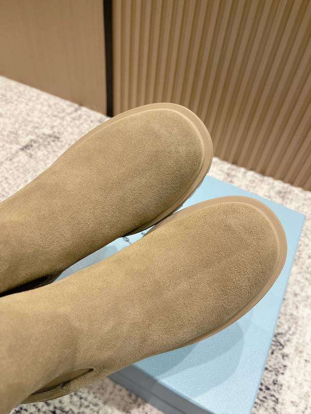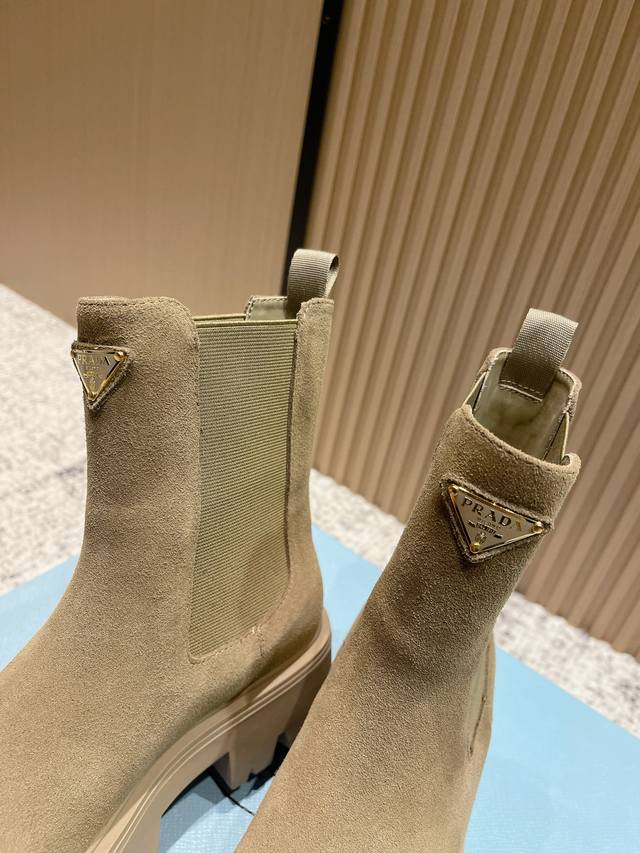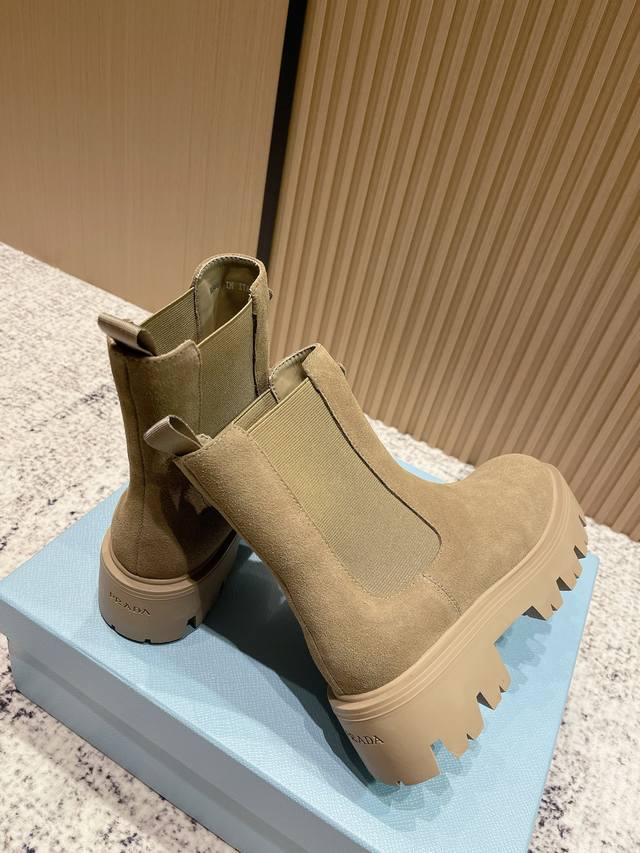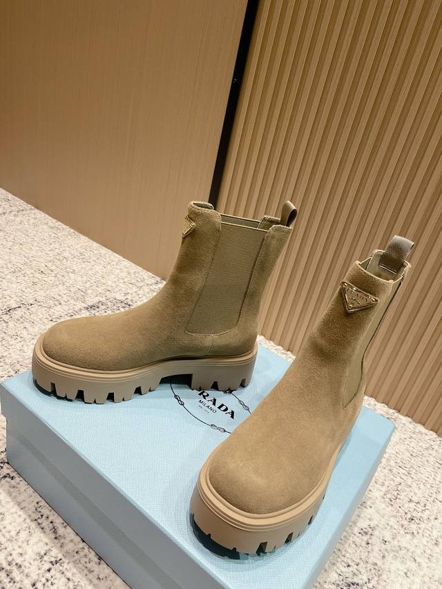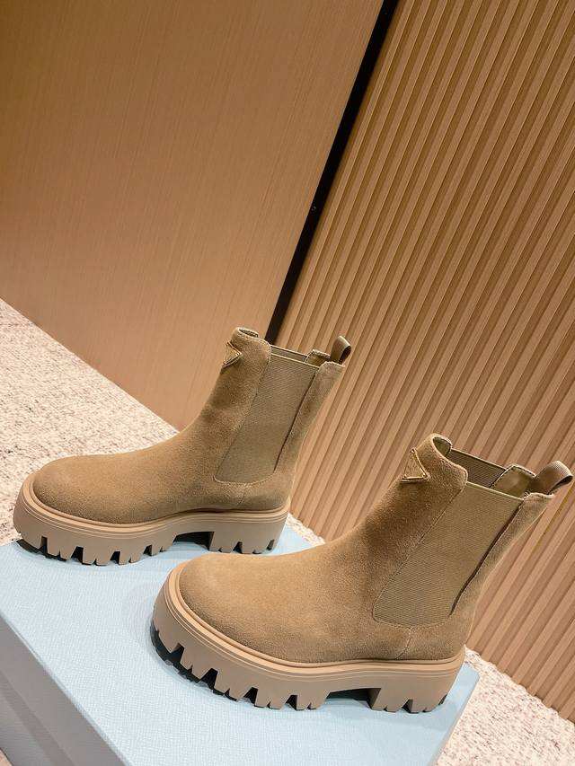 Top Version: Prada 25Fw Latest Platform Ankle Boots, Celebrity Style, Triangle Buckle Slip-on, Thick-soled, Height-increasing, Motorcycle Style Elastic Band Ankle Boots. Classic lines combined with modern elements define this versatile ankle boot. Glossy cowhide leather accentuates the shoe's lines, paired with a thick sole and adorned with the iconic enamel-coated triangle metal logo. This shoe features a distinctive round toe, a thick rubber sole that injects a modern look into the classic loafer, and an enamel-coated triangle metal logo that showcases the brand's style. Vintage glossy leather, typically used in fine footwear, is reinterpreted by Prada for a uniquely modern mixed-and-matched design. Upper: Cowhide with split bead. Insole: Sheepskin. Outsole: Original mold-cast TPU outsole. Sole thickness: 5cm. Sizes: 35-39. 40.41 Custom-made, no returns or exchanges.