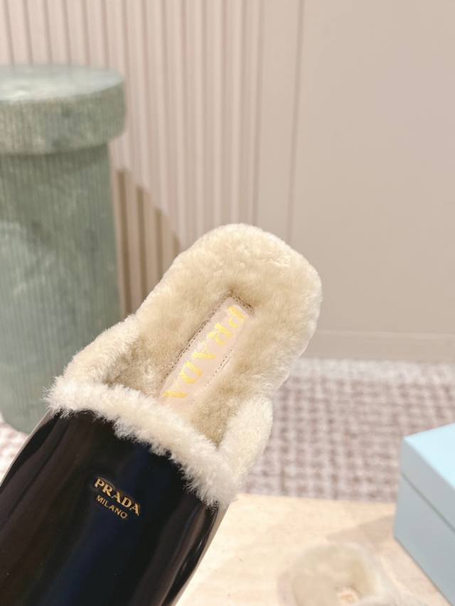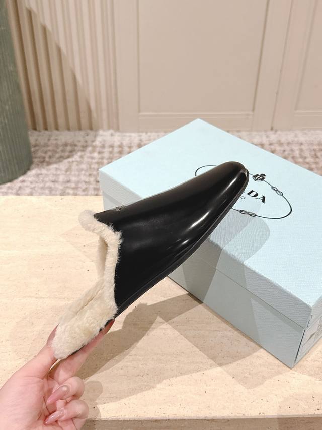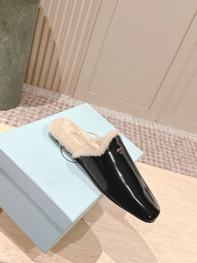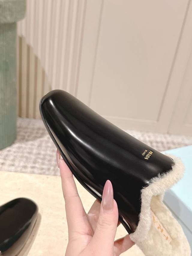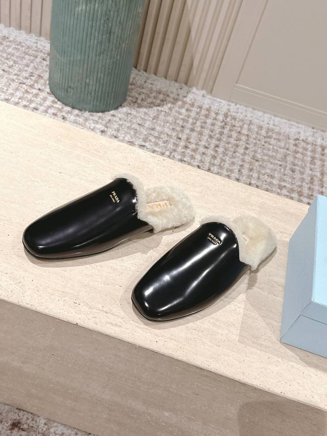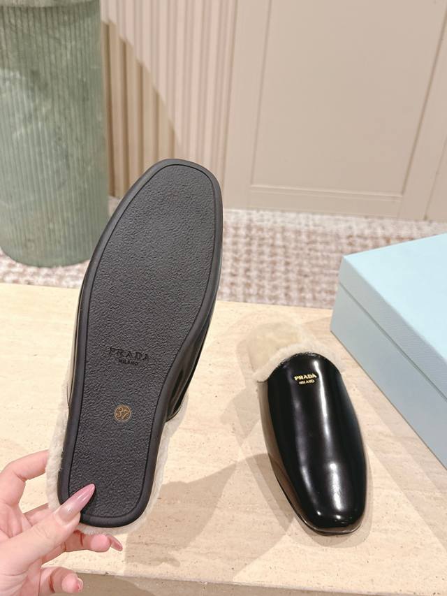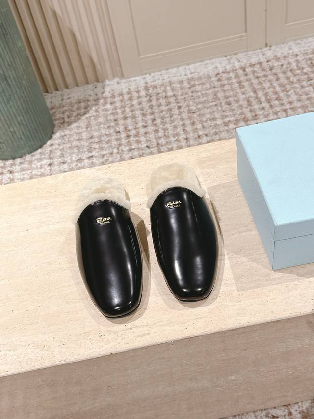 Top Version: Prada 25Ss Autumn/Winter New Plush Mules DDD These shoes blend luxurious texture with comfortable casualness. The upper is made of high-grade suede leather, and the plush design at the opening adds warmth and enhances comfort. The Prada logo on the shoe showcases the brand's style, presenting an overall retro yet fashionable light luxury style. DDD As mules, they are easy to put on and take off; the plush material provides some warmth in autumn and winter, suitable for short-term indoor and outdoor wear, combining aesthetics and practicality. DDD Upper: Open-label cowhide suede DDD Lining: Wool DDD Outsole: Rubber outsole DDD Size: 35-40 DDD