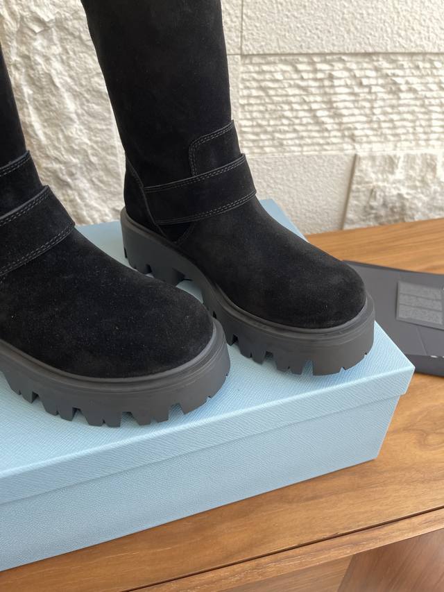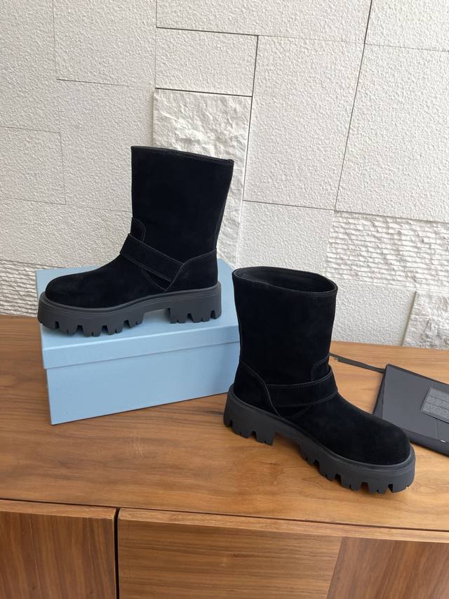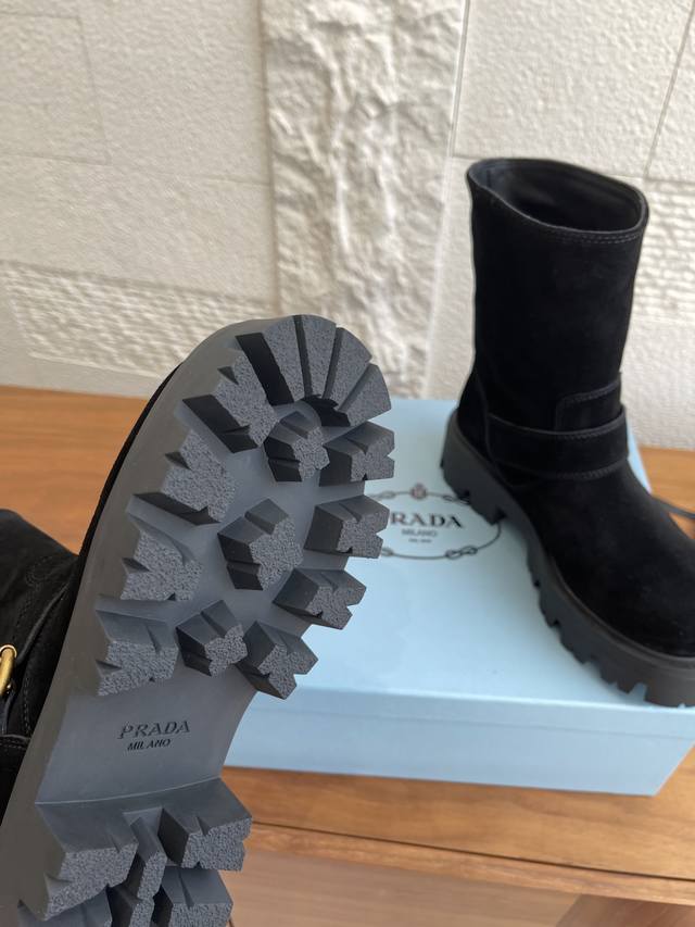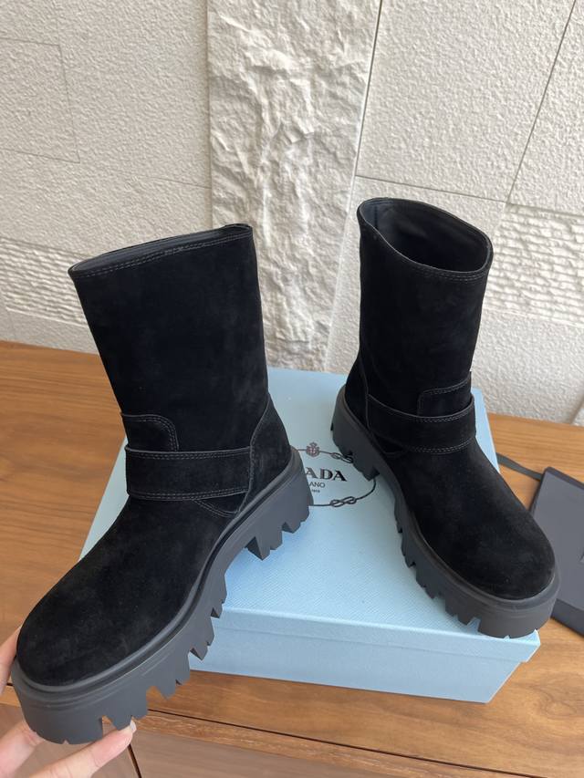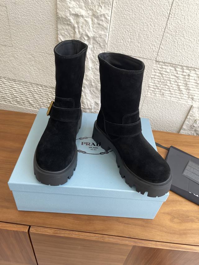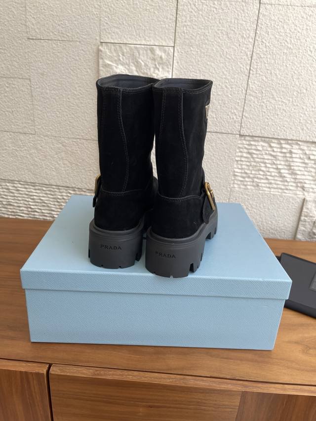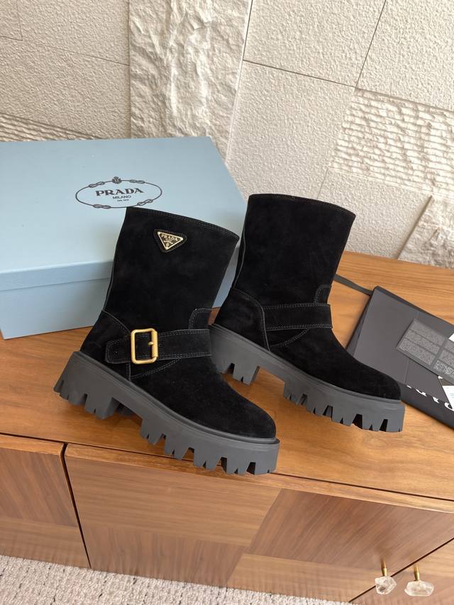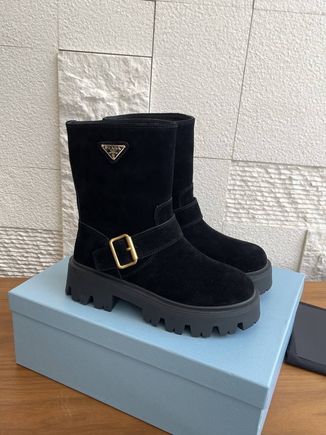 Top Version: Prada 25Ss Fall/Winter New Slip-on Motorcycle Boots, Martin Boots, Ankle Boots. These Prada ankle boots are definitely a hot item this year. Exquisite lines and craftsmanship define this suede ankle boot, adorned with the iconic enamel metal triangle logo. Unique metal buckles add personality to the motorcycle style, paired with a thick rubber sole. Stylish and slimming on the foot, comfortable to wear, a versatile must-have. Material: Imported cow suede. Lining: Imported water-dyed sheepskin. Outsole: Original molded rubber outsole. Size: 35-41. 40 and 41 are custom-made and non-refundable.