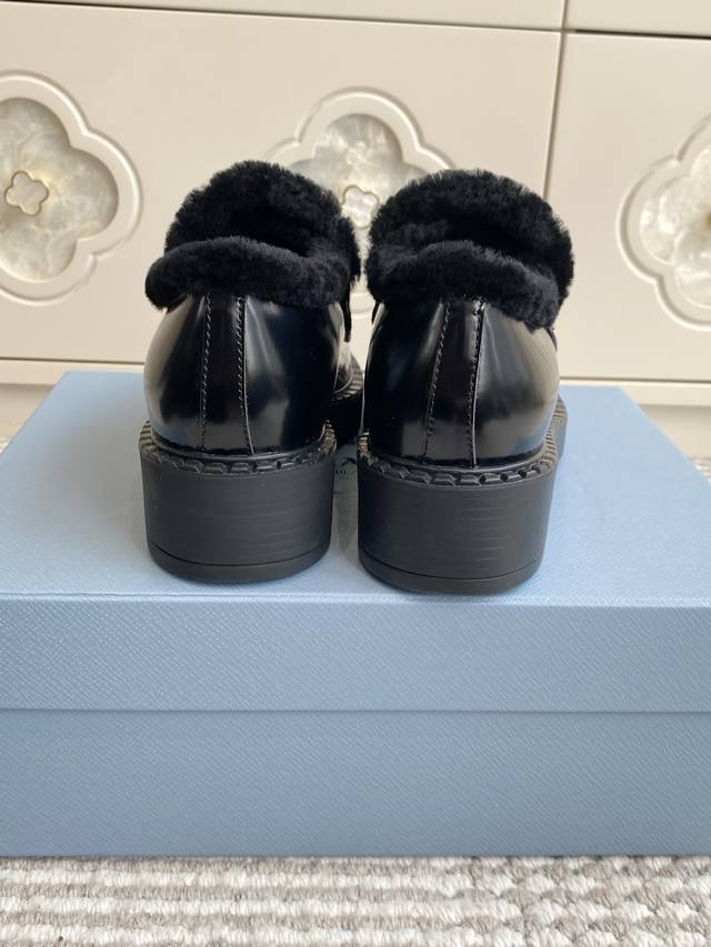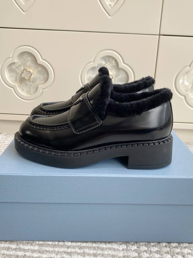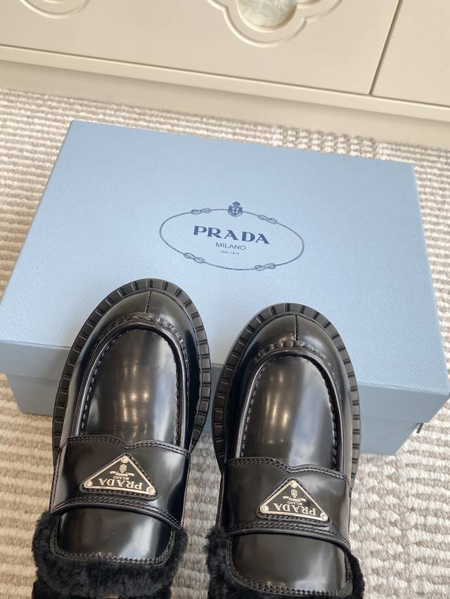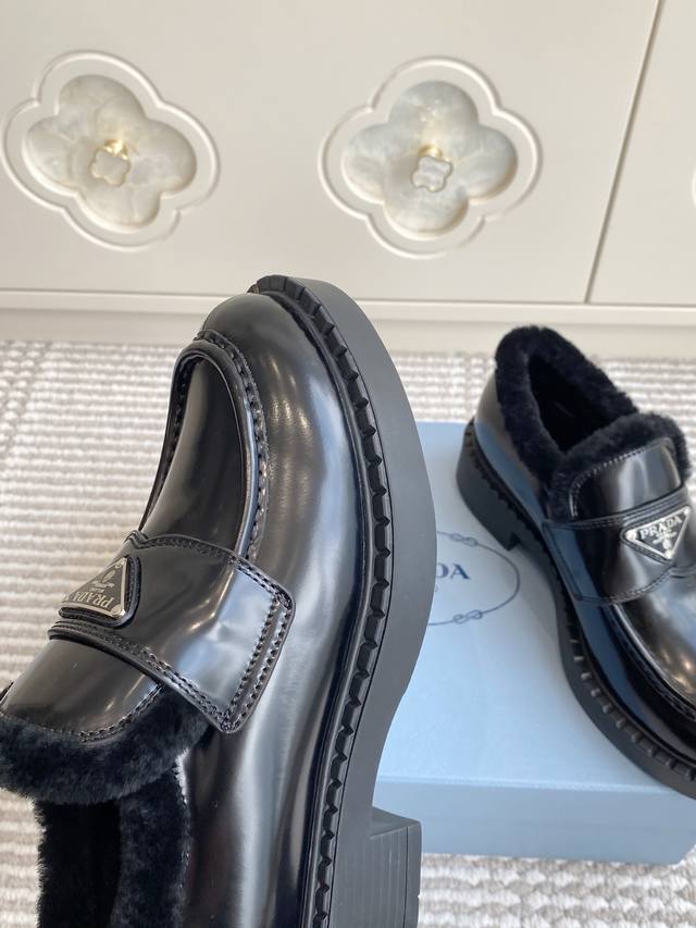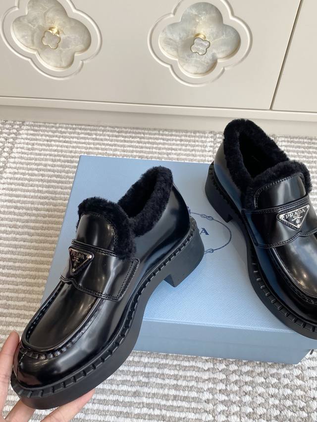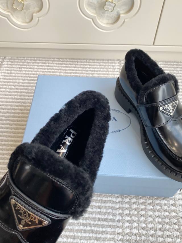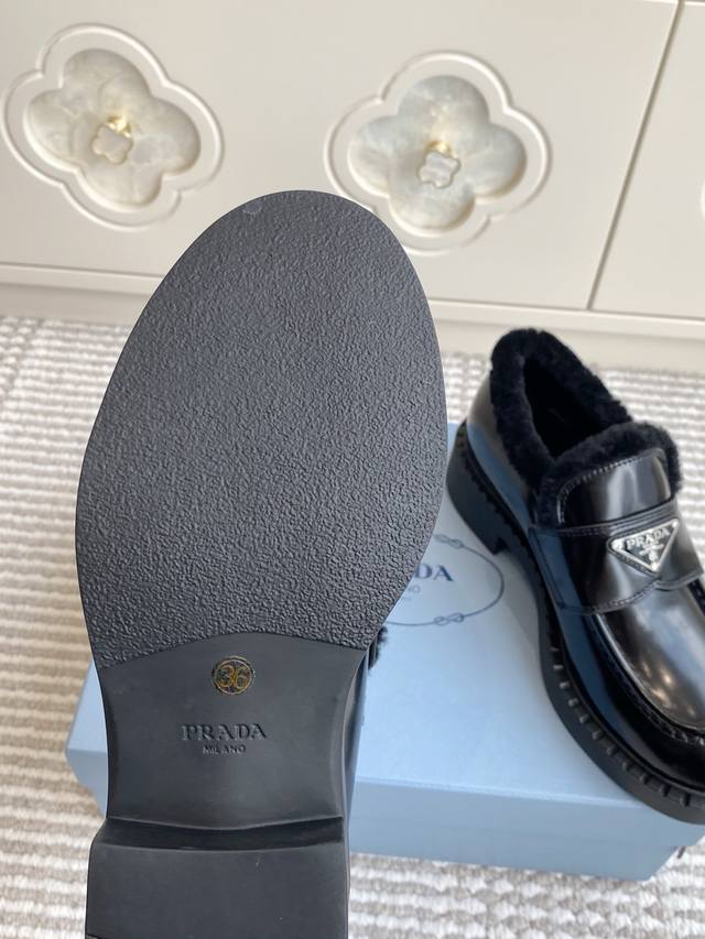 Top-quality Prada 2025 Fall/Winter Triangle Logo Warm Wool Platform Loafers | Top-tier quality. Materials and craftsmanship: Original split-edge cowhide, patent leather, suede, 160% wool, ZP molded outsole. Sizes: 35-39. Sizes 40 and 41 are custom-made and non-refundable.