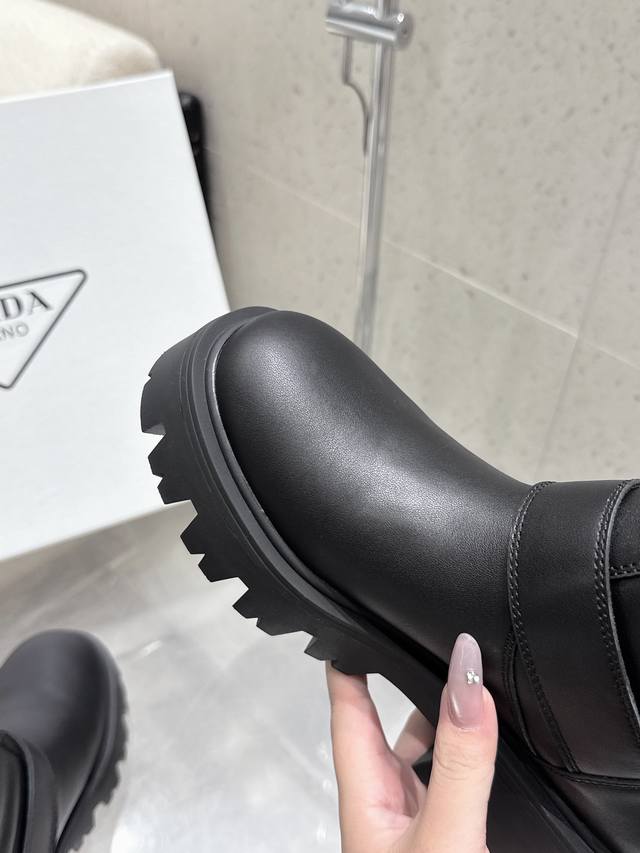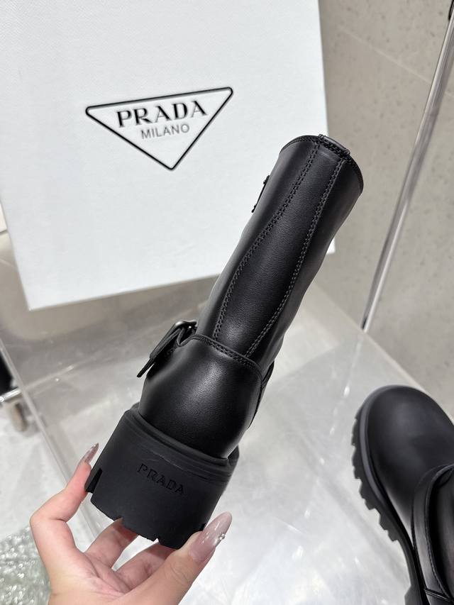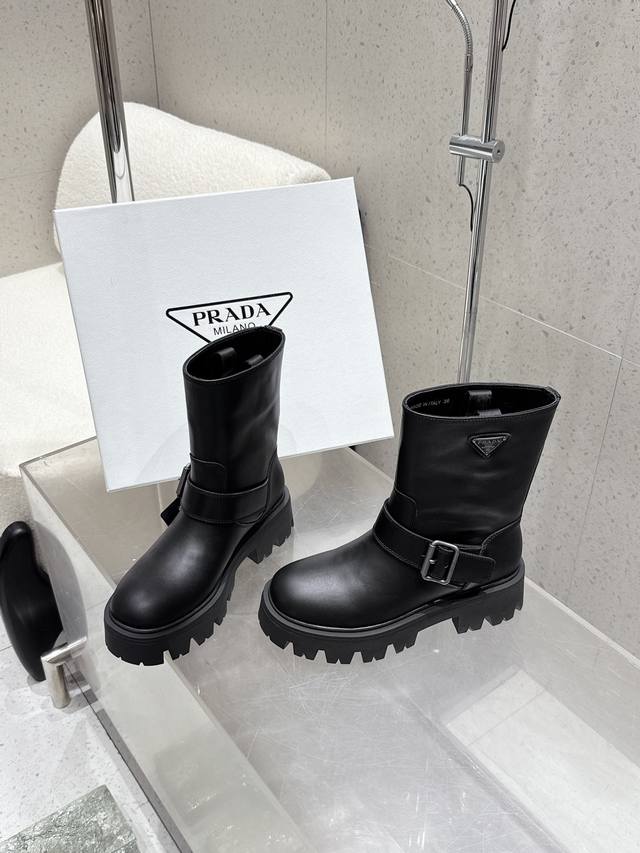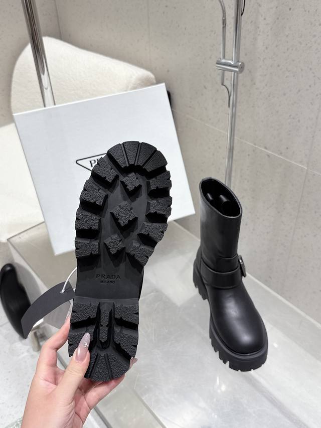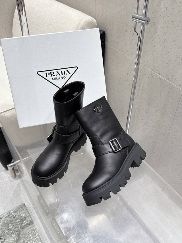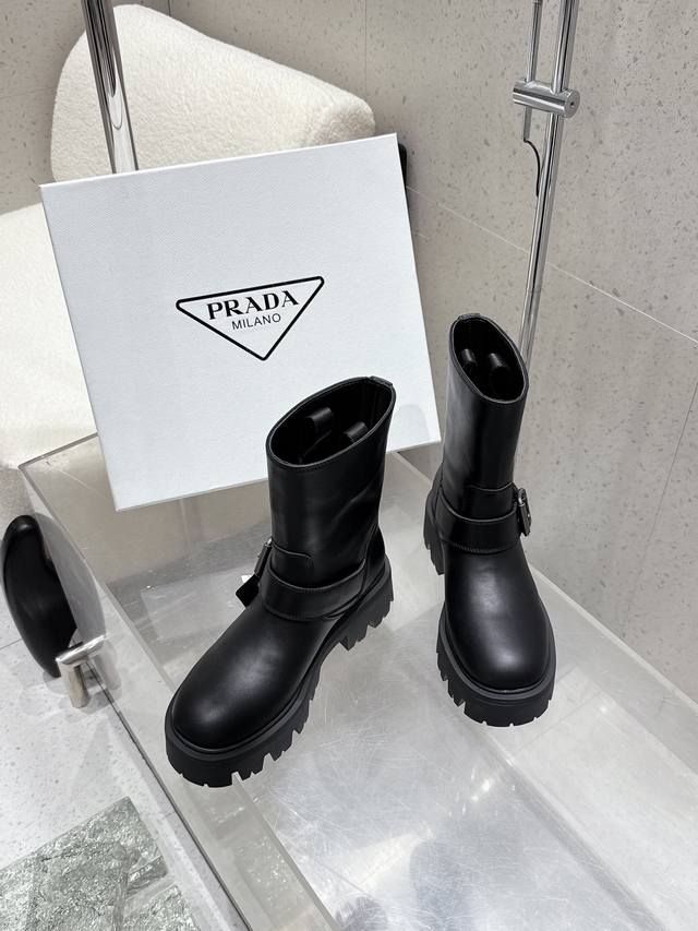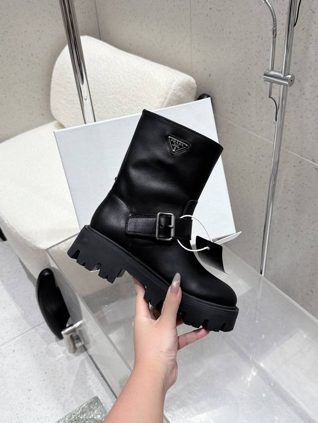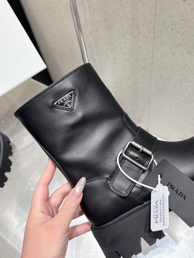 Prada latest triangle logo paired with belt buckle thick-soled mid-calf Martin boots, a very stylish pair.