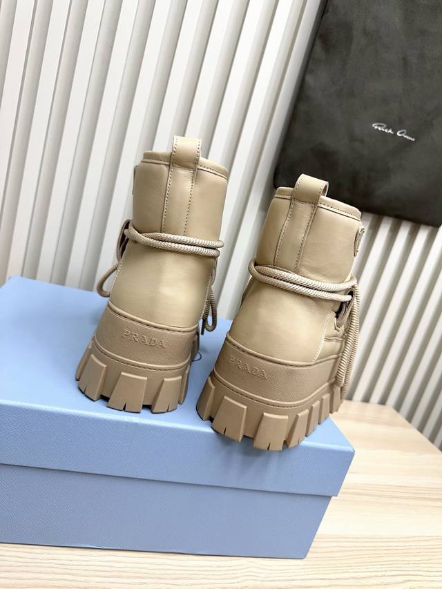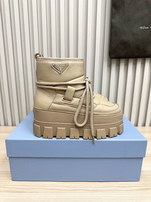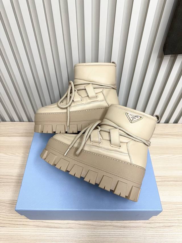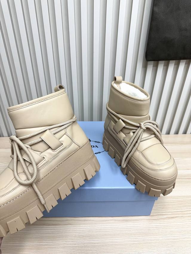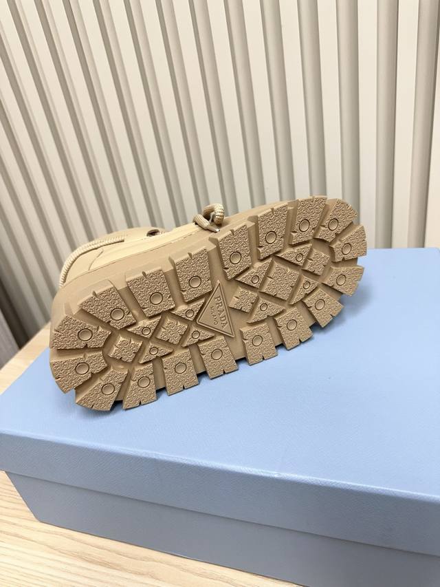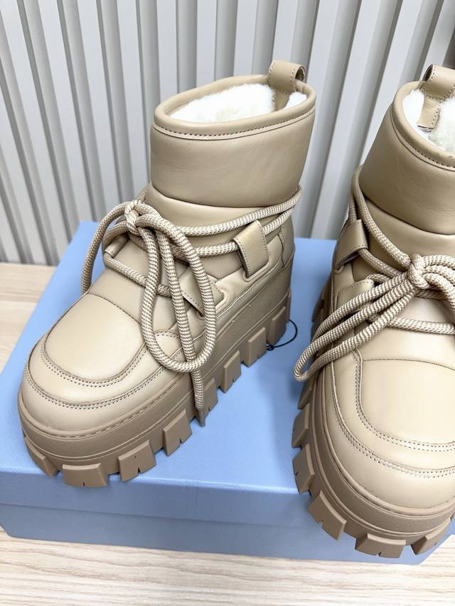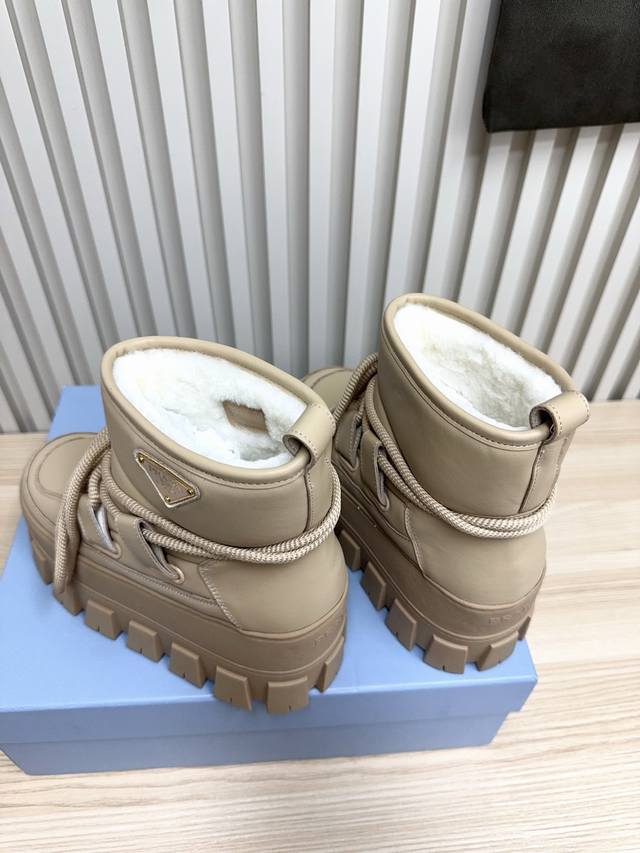 Top-tier factory quality Prada ski boots/snow boots, the latest Fall/Winter 2024 snow boots! The wool collar design echoes the Prada logo, highlighting its high-end and sophisticated style! Made with imported Australian sheepskin lining, providing excellent warmth in winter. Outer material: Two-layer suede cowhide/sheepskin. Lining: Imported Australian sheepskin. Outsole: Original TPU membrane outsole. Size: 35-41, size 41 custom-made.