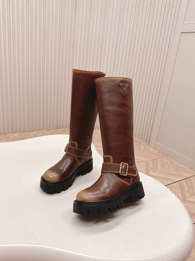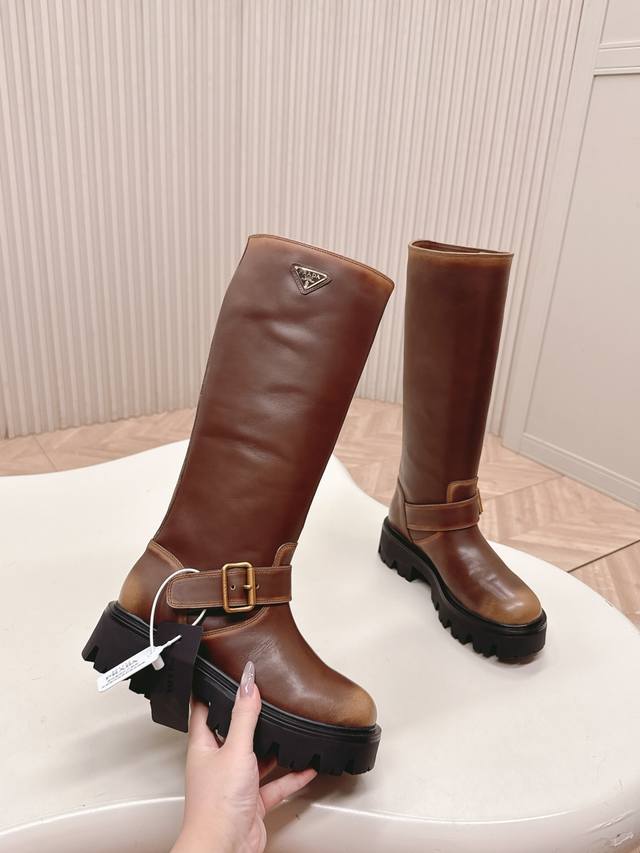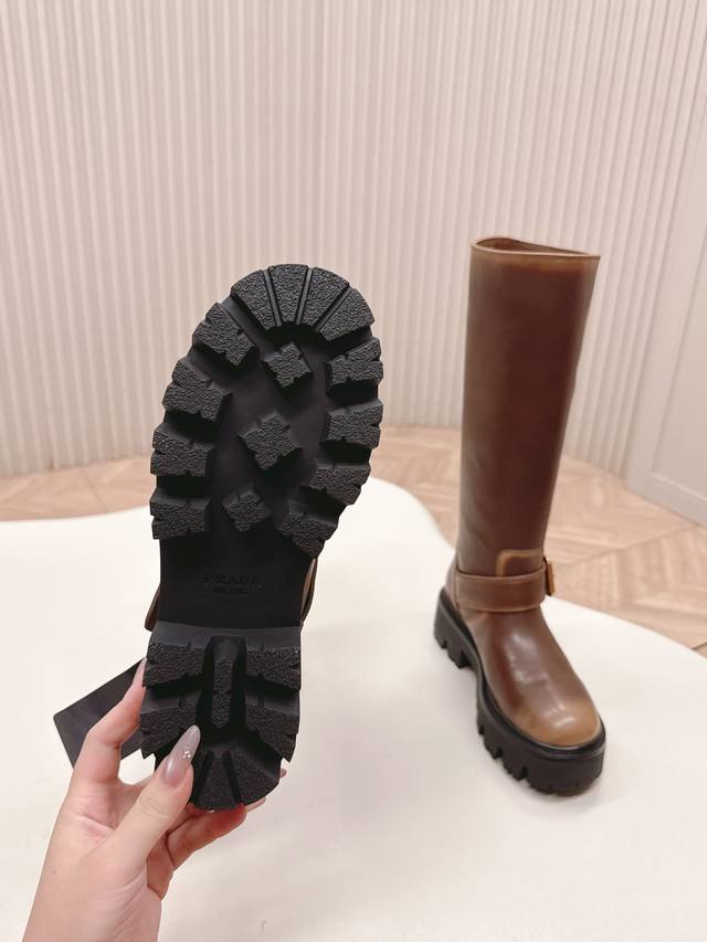 Top-tier leather Prada classic triangle logo slip-on high-top women's riding boots. A must-have for winter, this is definitely a hot item this year!! Super stylish! Prada boots are truly amazing! They look sophisticated and make your legs appear slimmer, perfectly capturing your elegance. The entire series uses various imported materials: rubbed and waxed calfskin, high-gloss suede, water-dyed sheepskin lining, and a lightweight and comfortable foam sole! Sizes: 35-41, 40, 41. Custom orders are non-refundable and non-exchangeable.