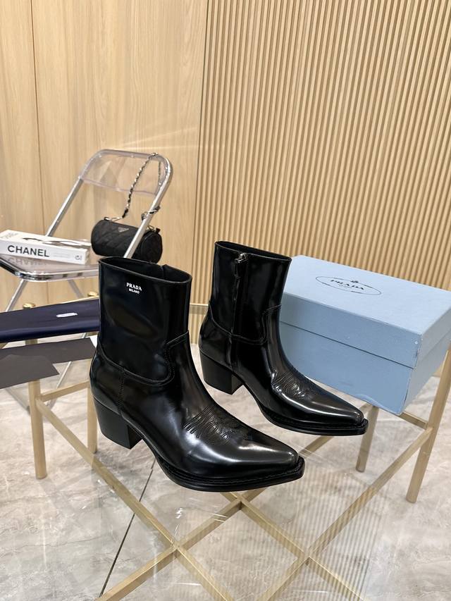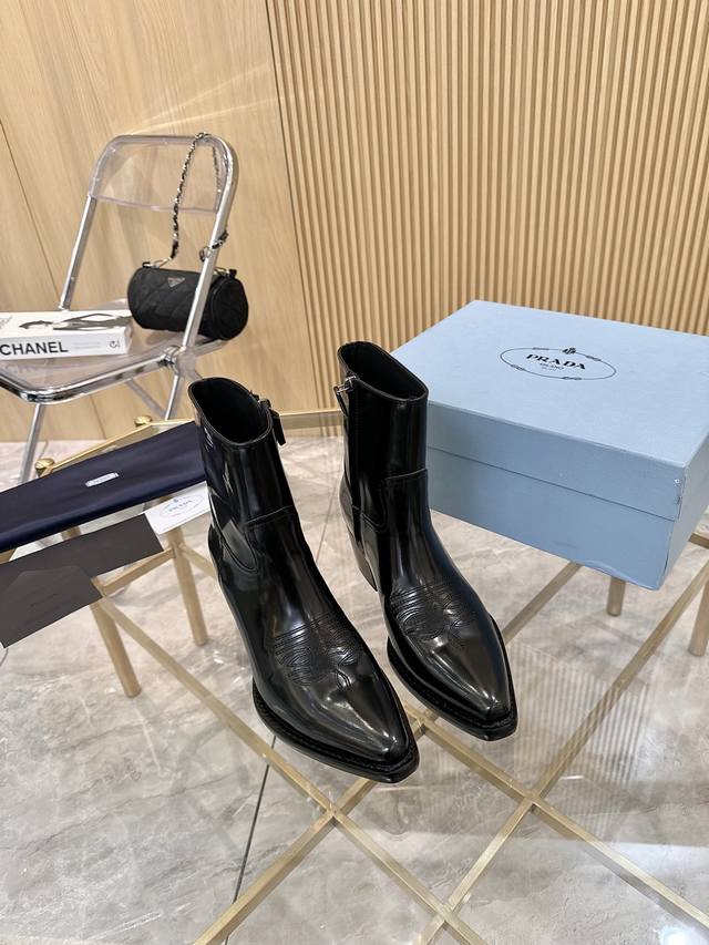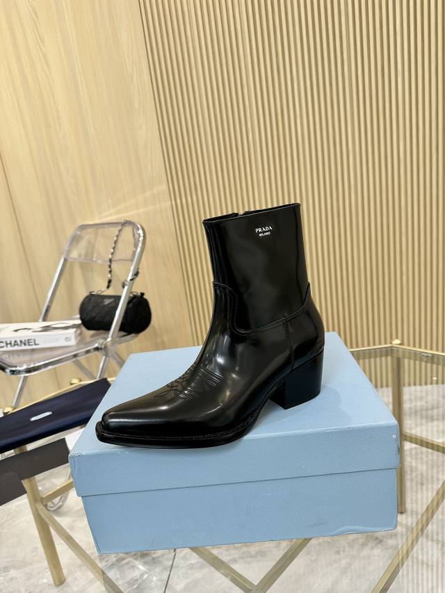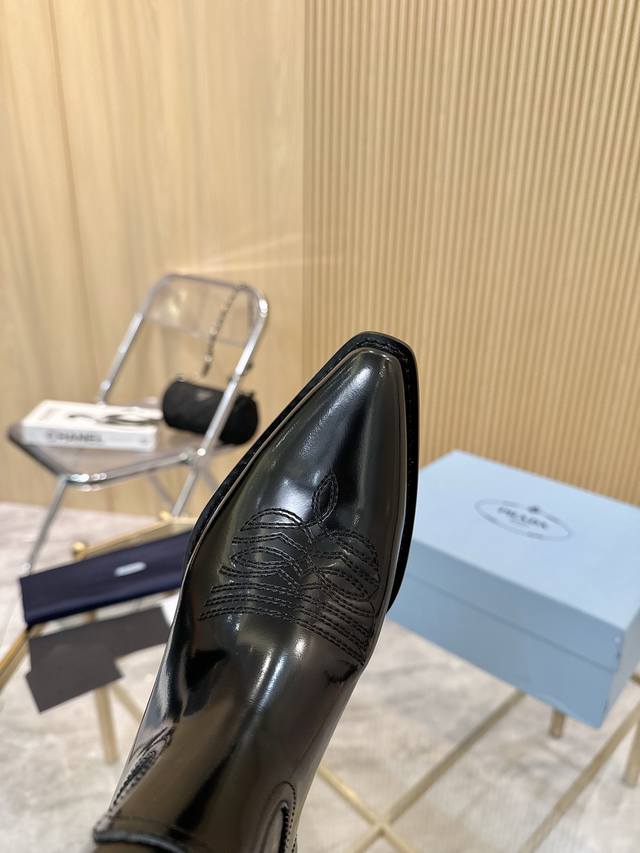Top-tier luxury version of the classic Prada pointed-toe boots. Prada is perfect for important occasions, offering a fresh yet sophisticated look. They look absolutely stunning on the feet, making legs appear slimmer and perfectly capturing a refined style. Pairing these boots with other items creates an elegant and sophisticated look. The shoes are crystal clear and all accessories are exclusively 1:1 custom-made, achieving zero deviation from the original. The entire collection combines exciting and unexpected elements, allowing you to experience the ever-changing style of the Prada girl. Sizes: 35-40, 41, 42 (custom-made).