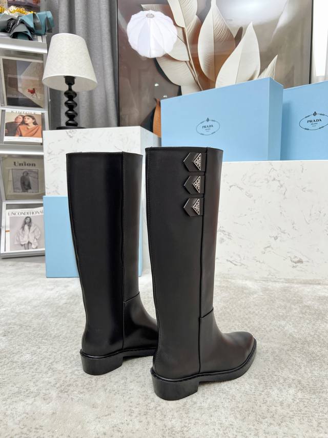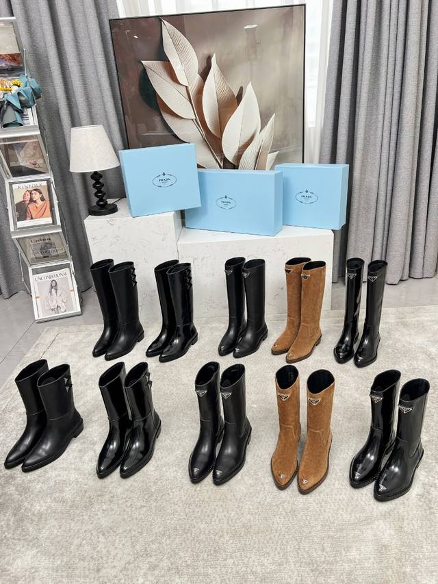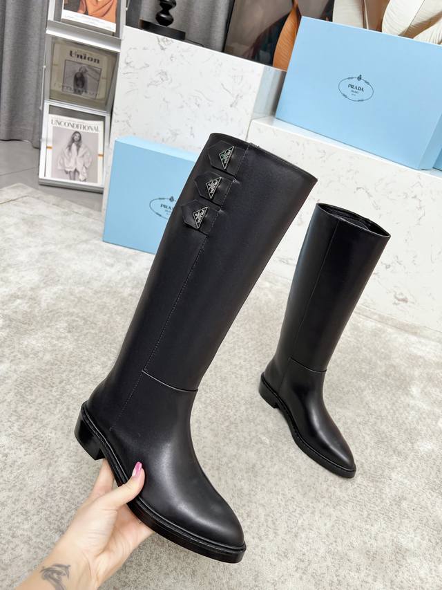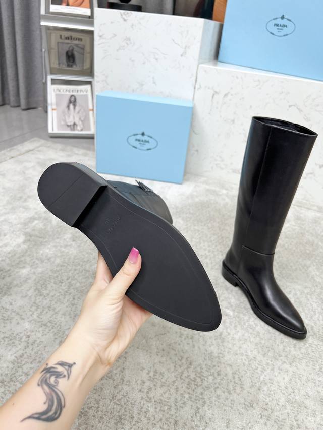 Top-tier luxury version of the classic Prada triangle logo pointed-toe boots. Prada is perfect for important occasions, offering a fresh yet slightly luxurious feel. They look absolutely stunning on the feet, making legs appear slimmer and perfectly capturing the essence of elegance. Pairing these boots with other items creates an elegant and sophisticated look. The shoes are crystal clear, with all accessories and materials exclusively custom-made to a 1:1 replica, achieving zero deviation from the original. The entire collection combines exciting and unexpected elements, allowing you to experience the ever-changing style of the Prada girl. Material: Imported split-edge calfskin suede with a high-gloss finish; Lining: Water-dyed sheepskin; Sole: Italian original rubber non-slip sole; Sizes: 35-40, 41 (custom made).