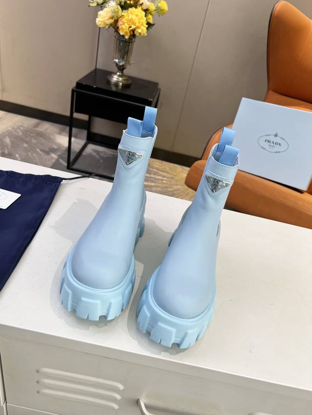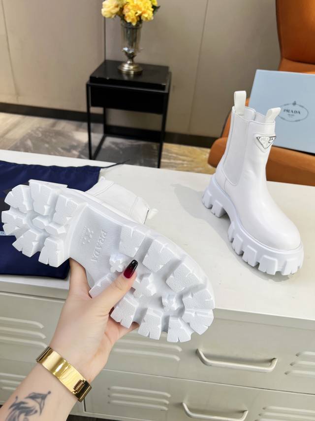 Top-tier Sss releases the Prada ankle boot collection, featuring the Prada early autumn/winter runway runway and influencer-endorsed "Dream City Never Sleeps" style. Perfect for important occasions, these boots offer a fresh yet subtly sophisticated look. They're incredibly flattering and elegant, with a crystal-clear finish. All accessories and materials are exclusively 1:1 custom-made, ensuring zero deviation from the original. The entire collection combines exciting and unexpected elements, allowing you to experience the versatile style of the Prada girl. 1. Upper: Imported calfskin; 2. Lining: Imported sheepskin lining; 3. Outsole: Italian original TPU foam outsole. Available in 5 colors, sizes 35-41.