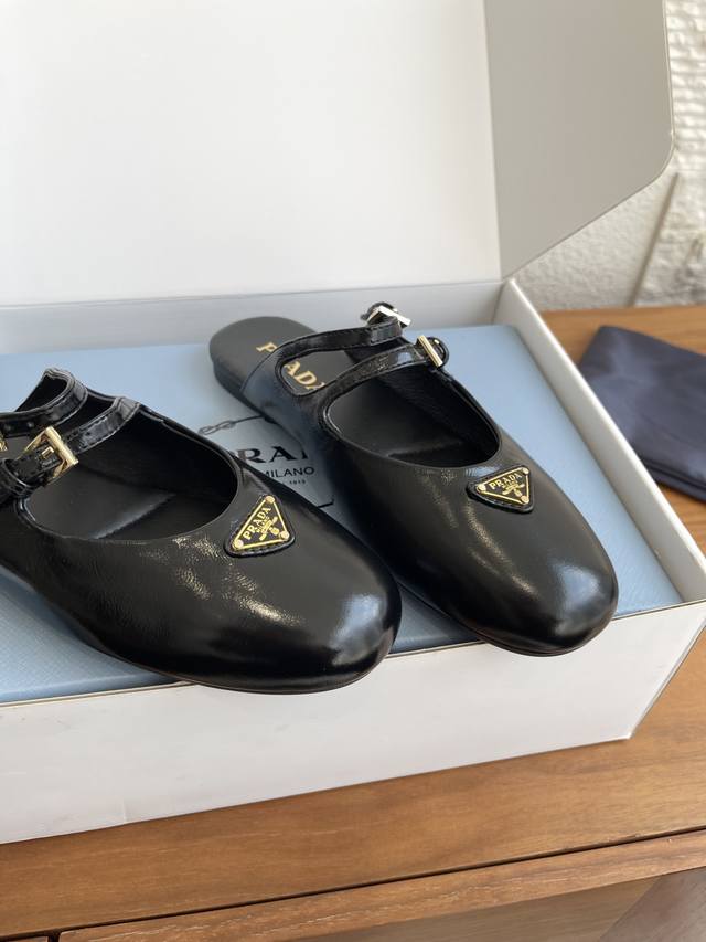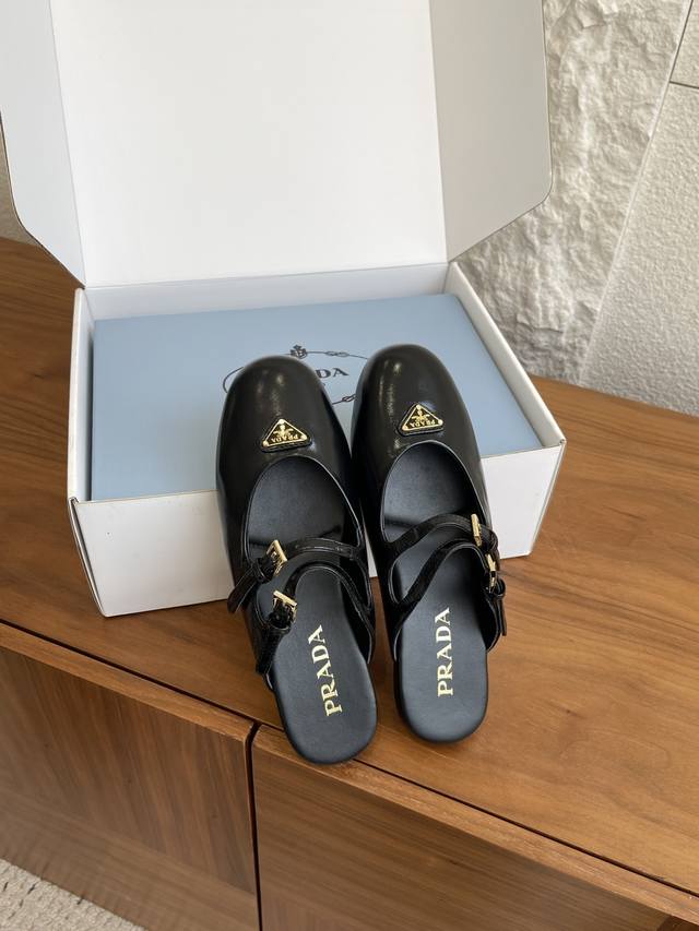 Top-tier version: Comes with exquisite boutique box. Prada 25Ss Autumn/Winter New Round Toe Double Strap Triangle Buckle Half-Mount Mules. These Prada half-mounts are based on the silhouette of ballet flats, with Naplak patent leather adding a touch of sophistication and showcasing elegant and feminine charm. They feature a round toe design, a rubber sole, and an enamel triangular metal logo, highlighting classic lines and exquisite details. The flat sole ensures a light and comfortable walk, 100% comfortable on the feet, providing a stable and relaxed feel. Material: Imported sheepskin patent leather, imported horsehair. Insole: Imported sheepskin. Outsole: Original molded rubber outsole. Size: 35-41, 40-41 (Custom orders are non-refundable).