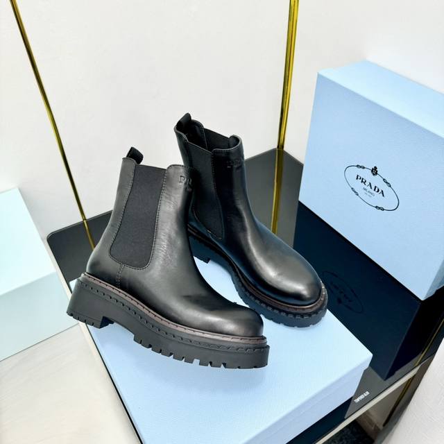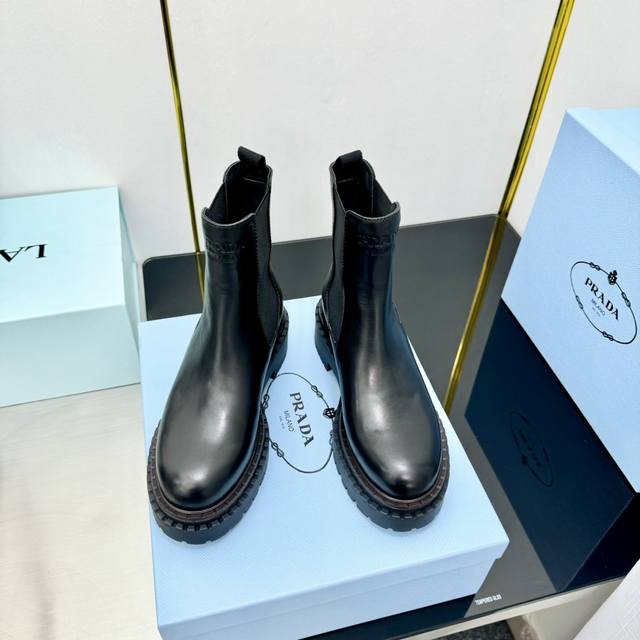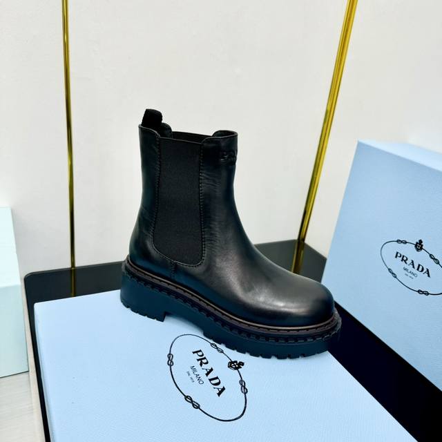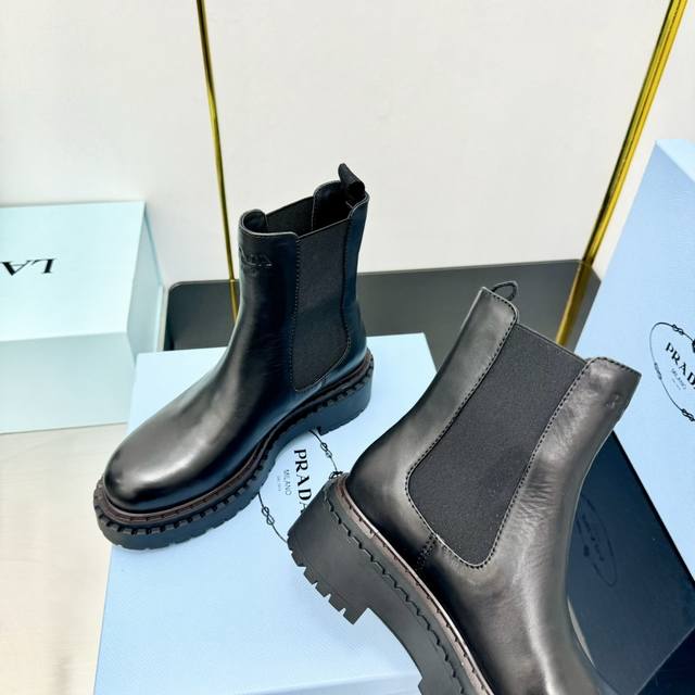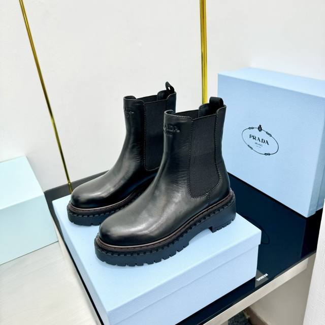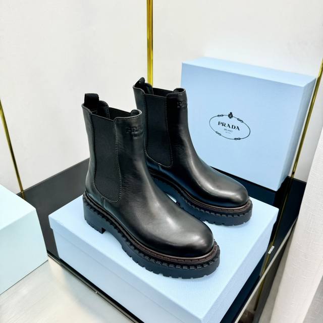 Top-tier version of Liu Wen and Yang Mi's same style height-increasing Chelsea ankle boots. Prada Fall/Winter new runway style brogue platform ankle boots. These look amazing on! They also elongate the legs. Vintage hand-rubbed finish, exuding high-end elegance. Material: Original custom cowhide. Lining: Sheepskin lining. Outsole: Original molded sole. Height: Approximately 4.5cm at the back. Size: 35-39 [40 pieces made to order, no returns or exchanges].