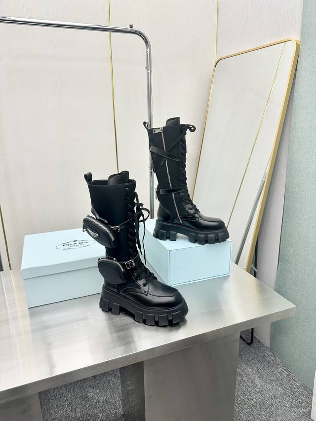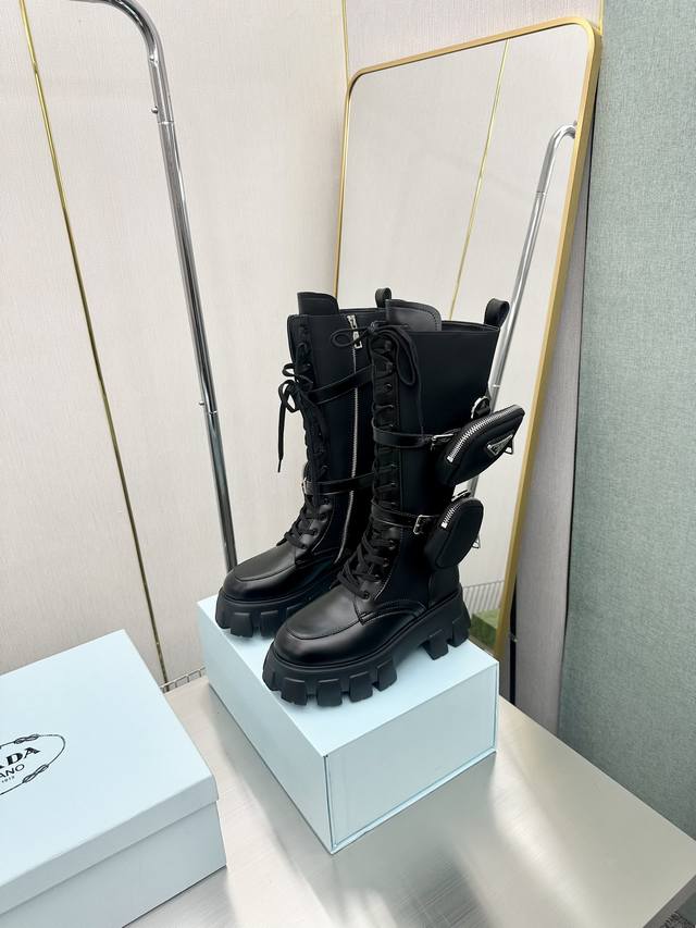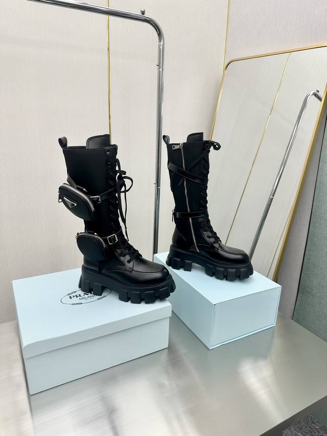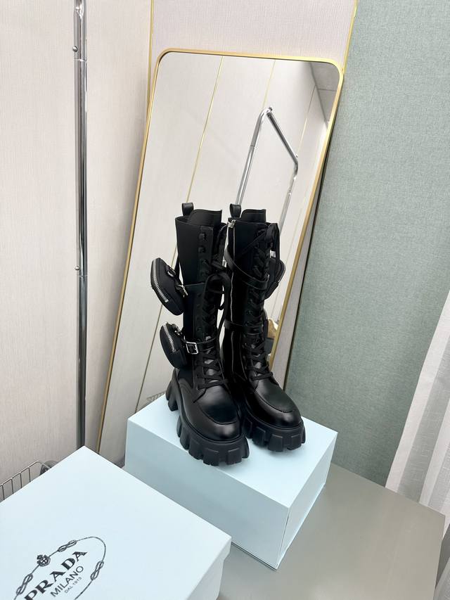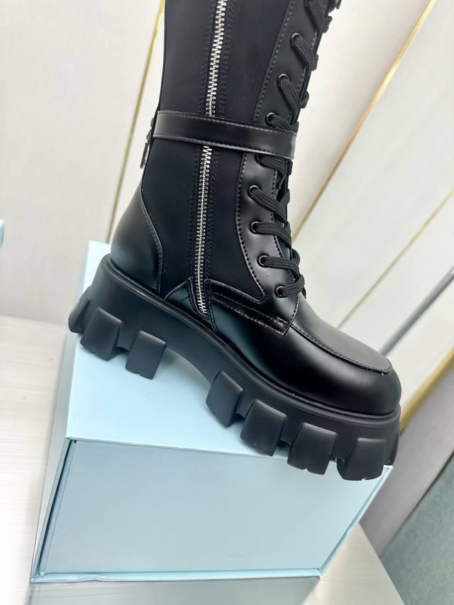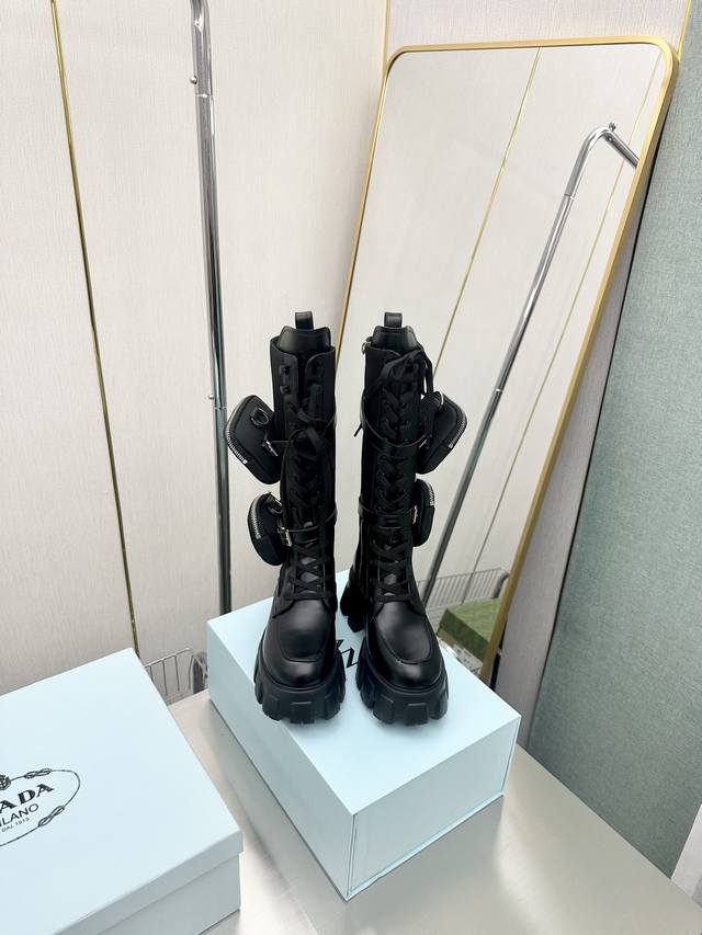 Top-tier version Prad* Prad Autumn/Winter High-Heeled Boots, Classic High-Heeled Chunky Heel Triangle Logo Loafers, Chocolate New Arrival, a must-have for petite figures. Top quality. Upper: Original imported split-edge patent leather. Lining: Leather insole. Outsole: Yuan-version molded rubber sole. Sizes: 35-39. Sizes 40 and 41 are custom-made, no returns or exchanges.
