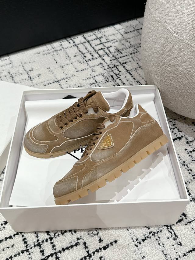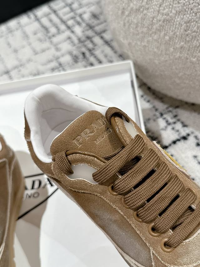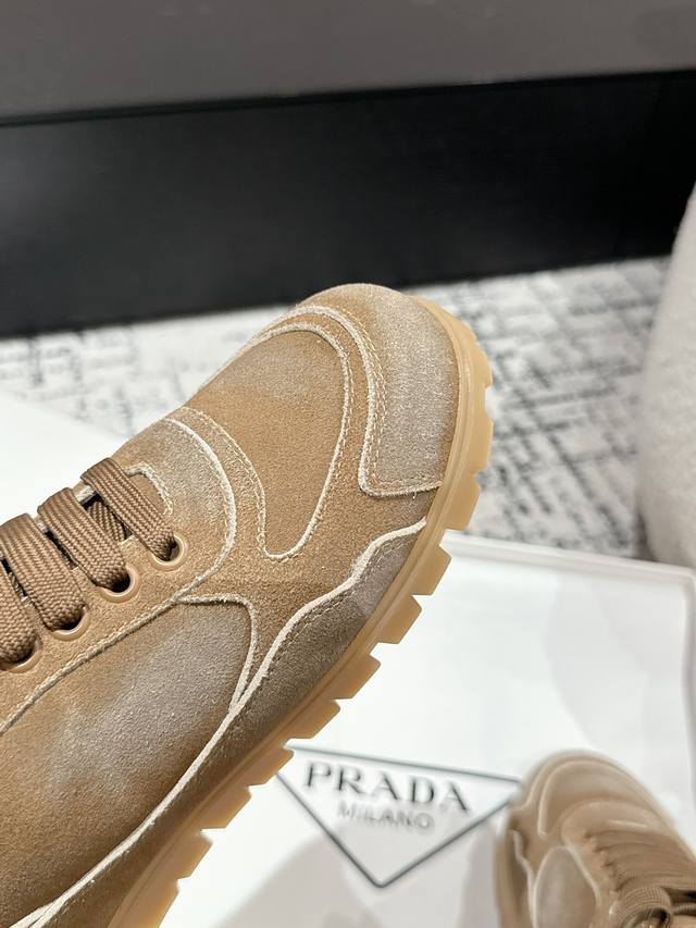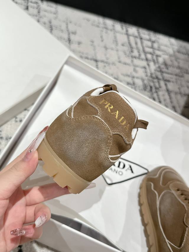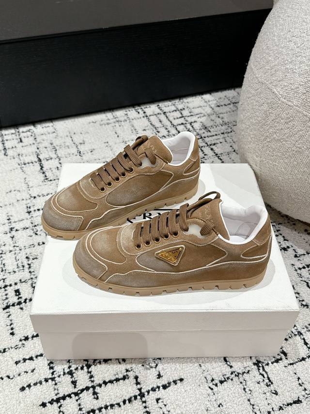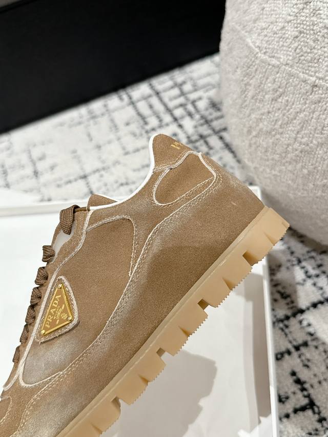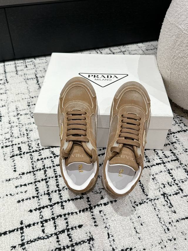 Top-tier version Prada 24 new lace-up German training casual shoes. Original purchase, developed with distressed denim suede to differentiate it from ordinary market versions. Retro distressed finish with triangular buckle for a sophisticated look; easily matched with various outfits; very comfortable to wear. Upper: Imported denim suede. Lining: Sheepskin. Outsole: Mold TPU rubber outsole. Size: Women's 35-40. Size 40 is custom-made and non-refundable.