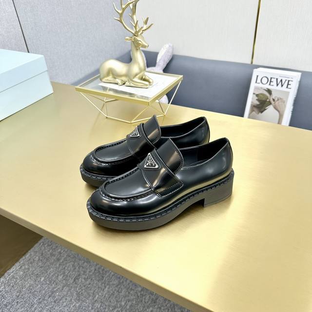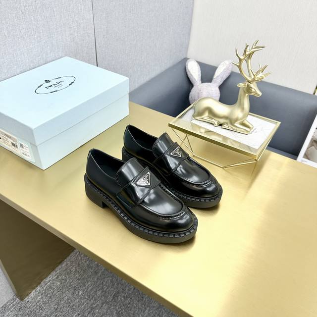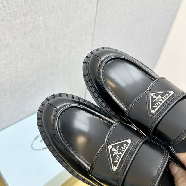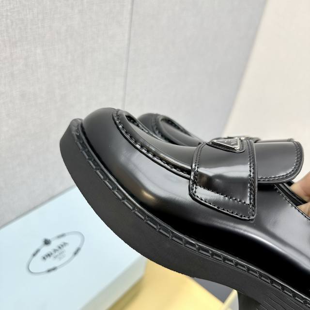 Top-tier version, Prada patent leather lace-up platform loafers. Upper: Enameled metal triangle logo with open bezel. Lining: Cowhide lining. Outsole: Perforated rubber sole with tire tread pattern. Heel height: 5.5cm. Sizes: 35-39. Custom orders of sizes 34, 40, and 41 are non-refundable and non-exchangeable.