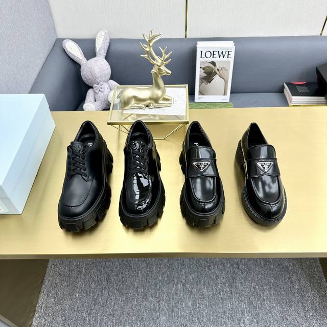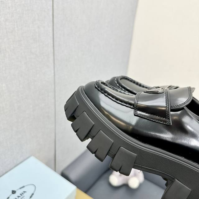 Top-tier version, Prada patent leather lace-up platform loafers. Upper: Enameled metal triangle logo with open bezel. Lining: Cowhide lining. Outsole: Perforated rubber sole with tire tread pattern. Heel height: 5.5cm. Sizes: 35-39. Custom orders of sizes 34, 40, and 41 are non-refundable and non-exchangeable.