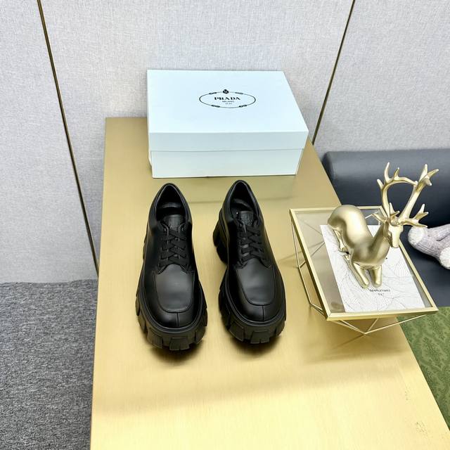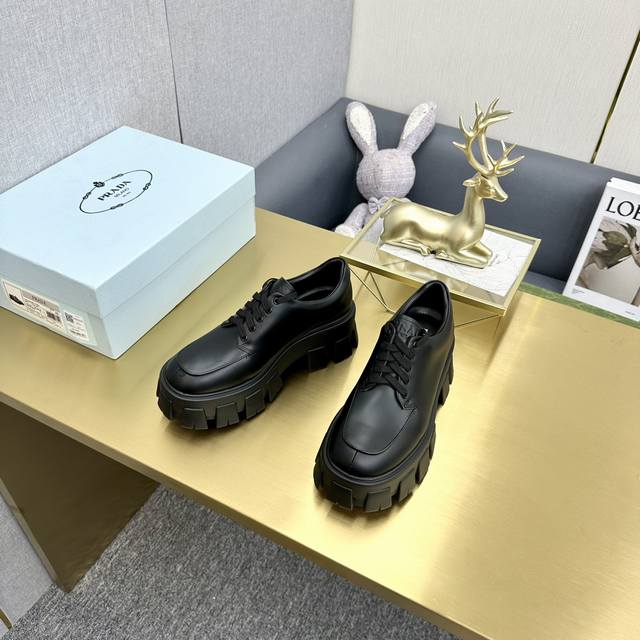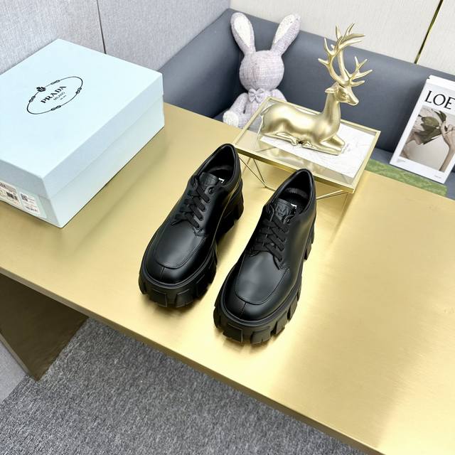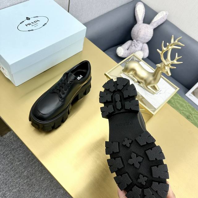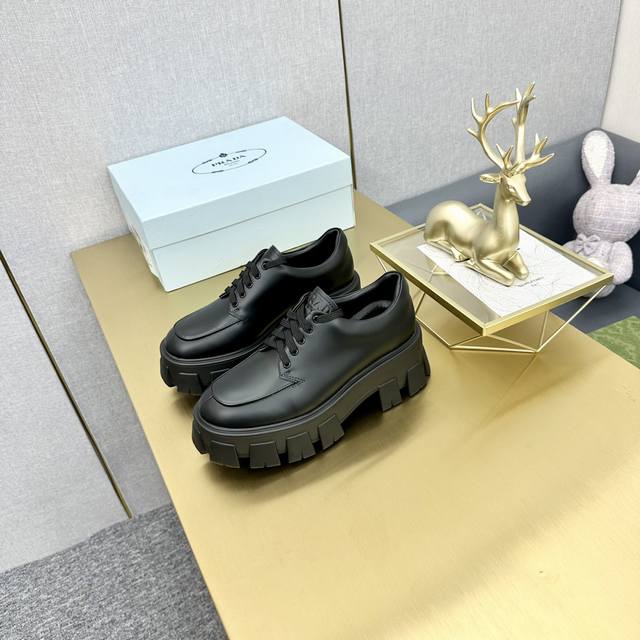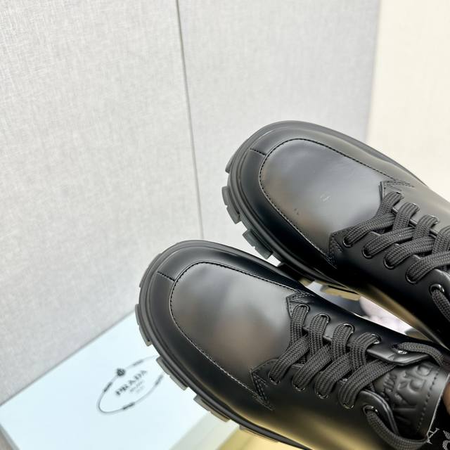 Top-tier version, Prada patent leather lace-up platform loafers. Upper: Enameled metal triangle logo with open bezel. Lining: Cowhide lining. Outsole: Perforated rubber sole with tire tread pattern. Heel height: 5.5cm. Sizes: 35-39. Custom orders of sizes 34, 40, and 41 are non-refundable and non-exchangeable.