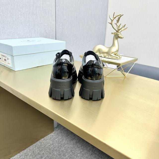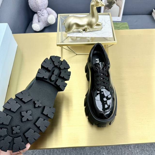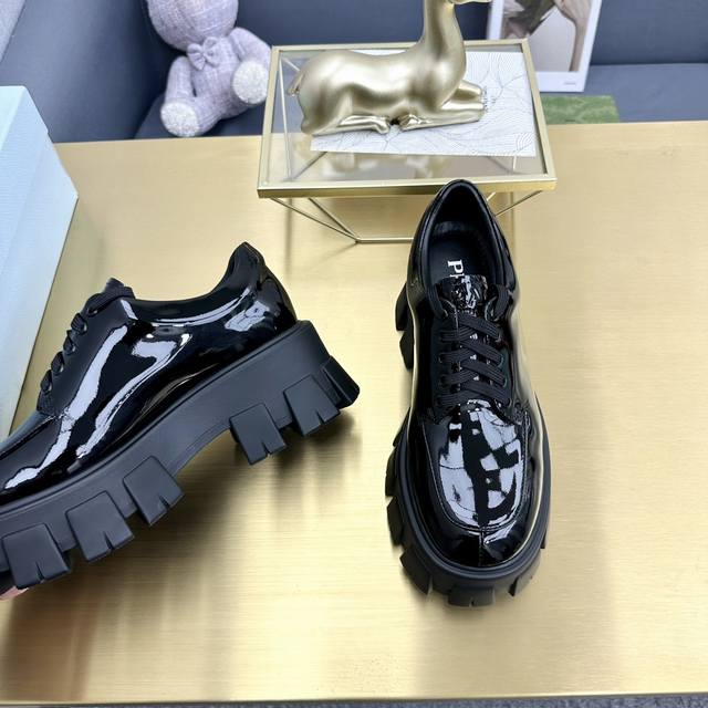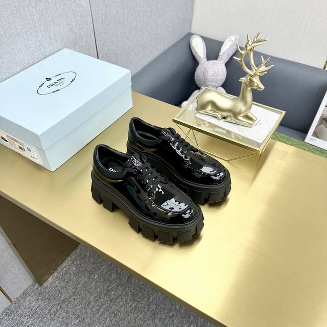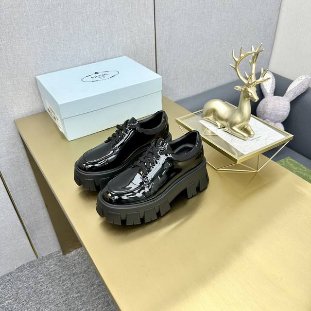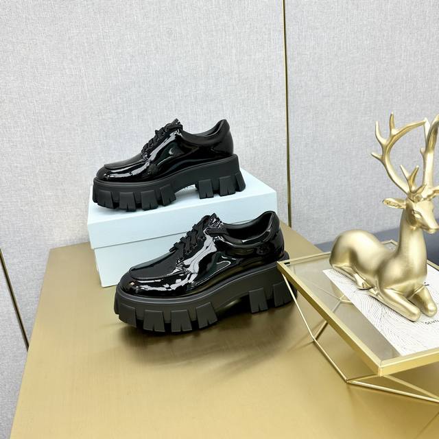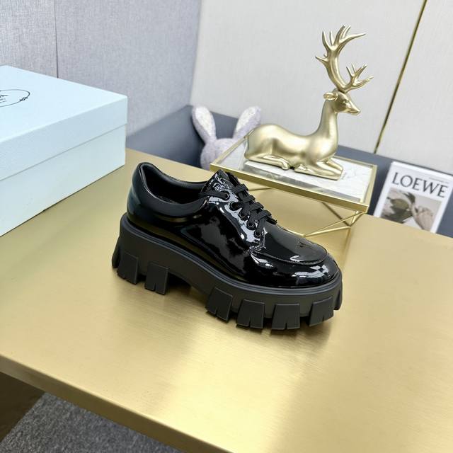 Top-tier version, Prada patent leather lace-up platform loafers. Upper: Enameled metal triangle logo with open bezel. Lining: Cowhide lining. Outsole: Perforated rubber sole with tire tread pattern. Heel height: 5.5cm. Sizes: 35-39. Custom orders of sizes 34, 40, and 41 are non-refundable and non-exchangeable.