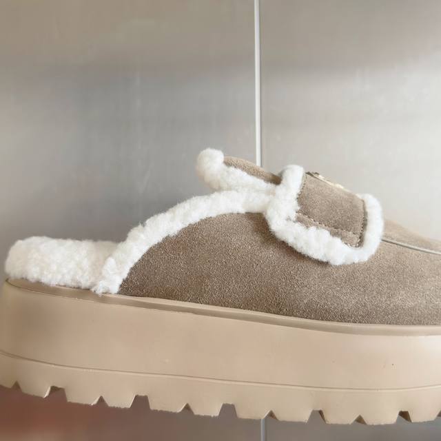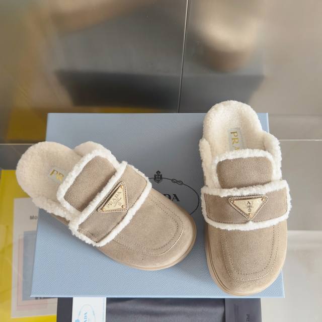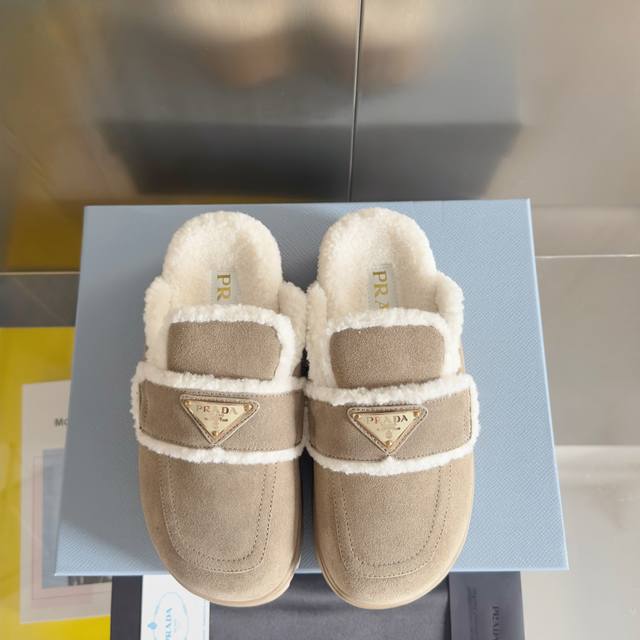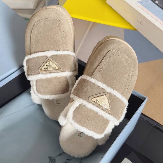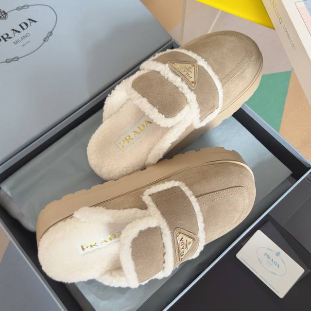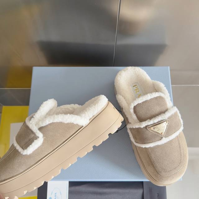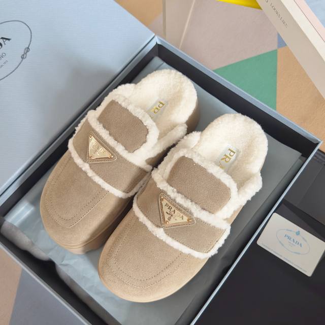 Top-tier version: Women's Prada platform warm wool slip-on loafers. Original purchase and development. These suede leather loafers combine exquisite elegance with practicality. Unique design, featuring a warm sheepskin lining and rubber sole. Comes with exquisite boutique packaging. Material: Original custom imported top-grain cowhide. Lining: Original custom warm wool. Outsole: Original molded foamed rubber. Sole thickness: 5.5cm. Size: Women's 35-40.