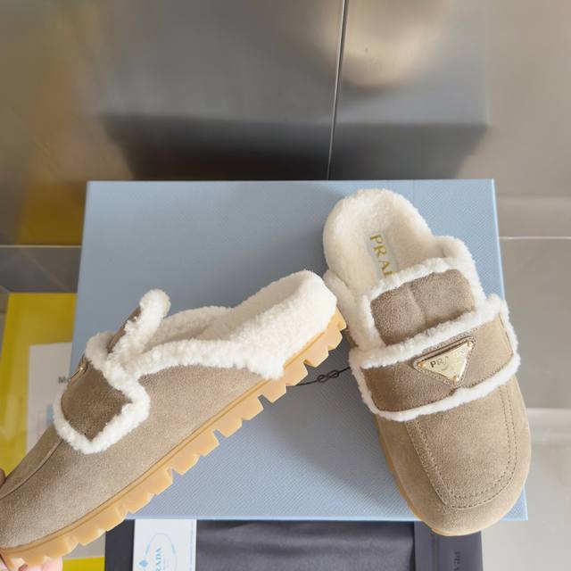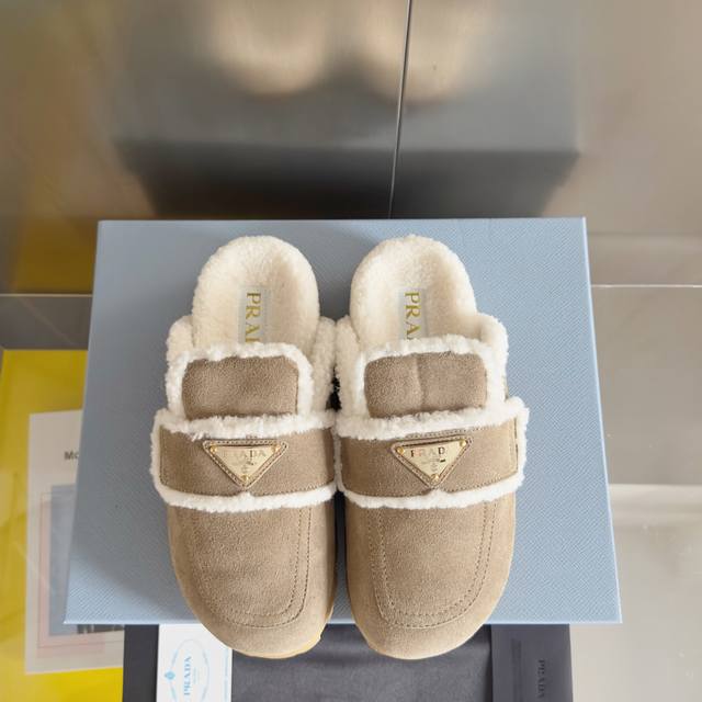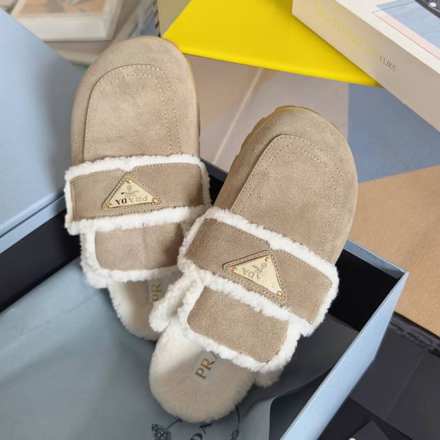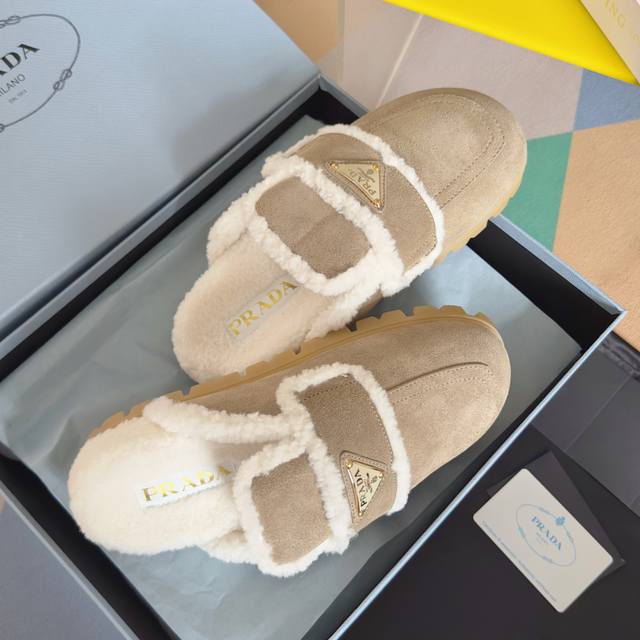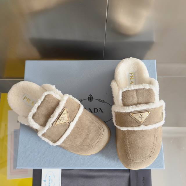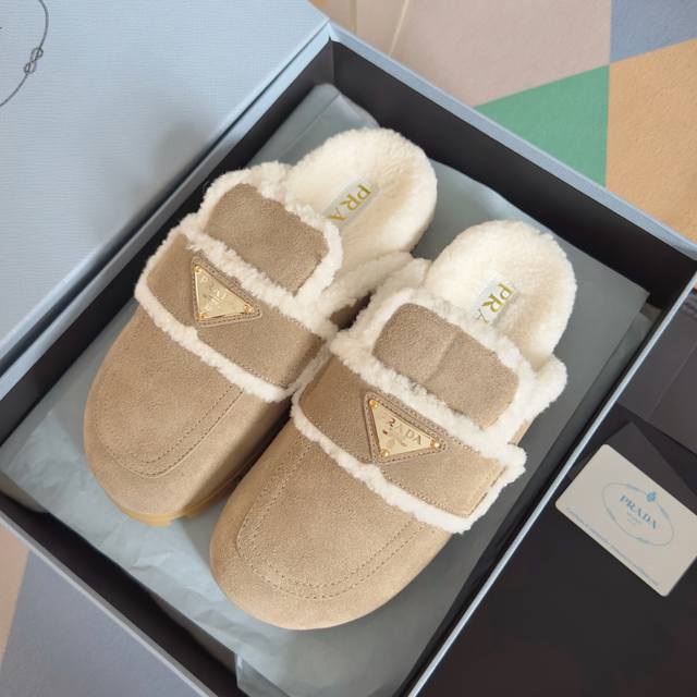 Top-tier version: Women's Prada platform warm wool slip-on loafers. Original purchase and development. These suede leather loafers combine exquisite elegance with practicality. Unique design, featuring a warm sheepskin lining and rubber sole. Comes with exquisite boutique packaging. Material: Original custom imported top-grain cowhide. Lining: Original custom warm wool. Outsole: Original molded foamed rubber. Sole thickness: 3.5cm. Size: Women's 35-40.