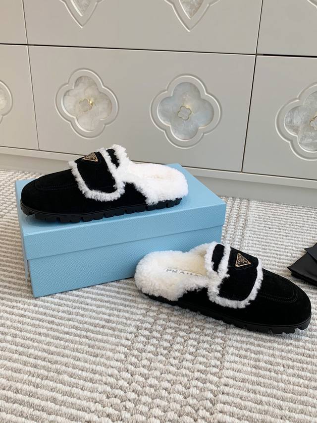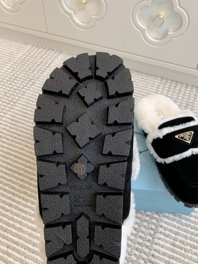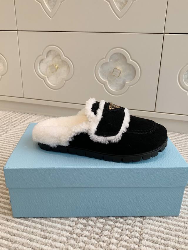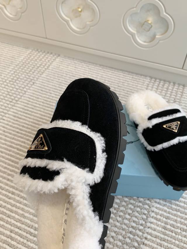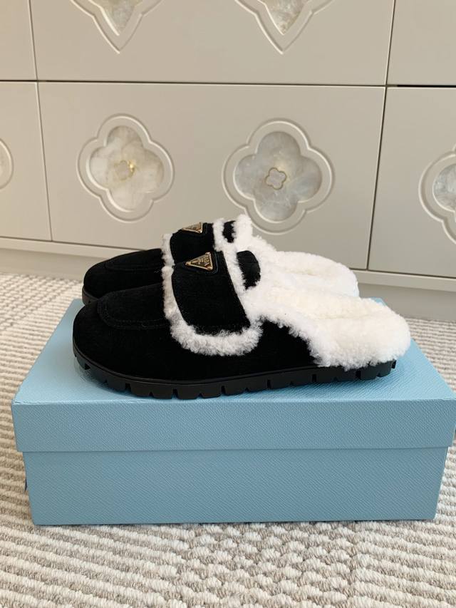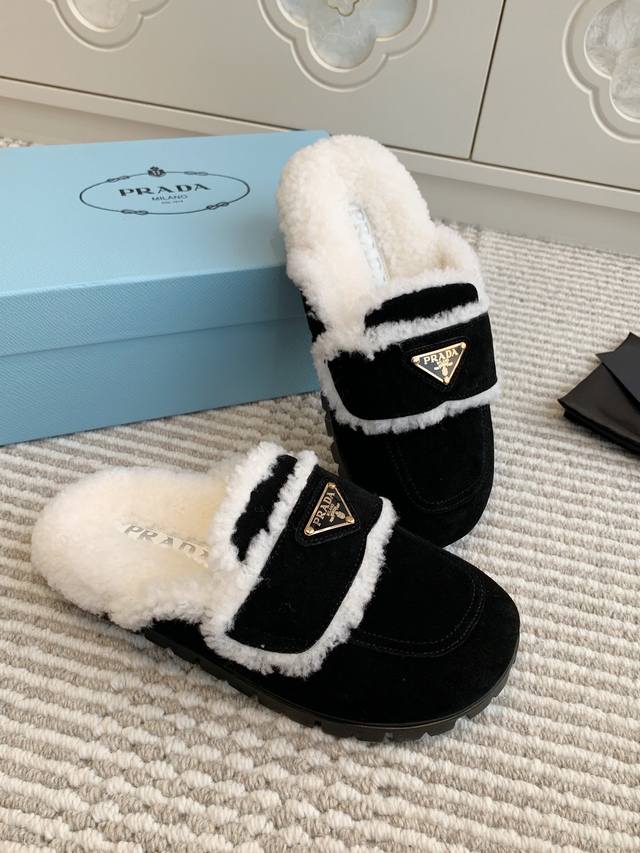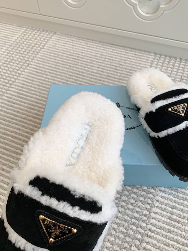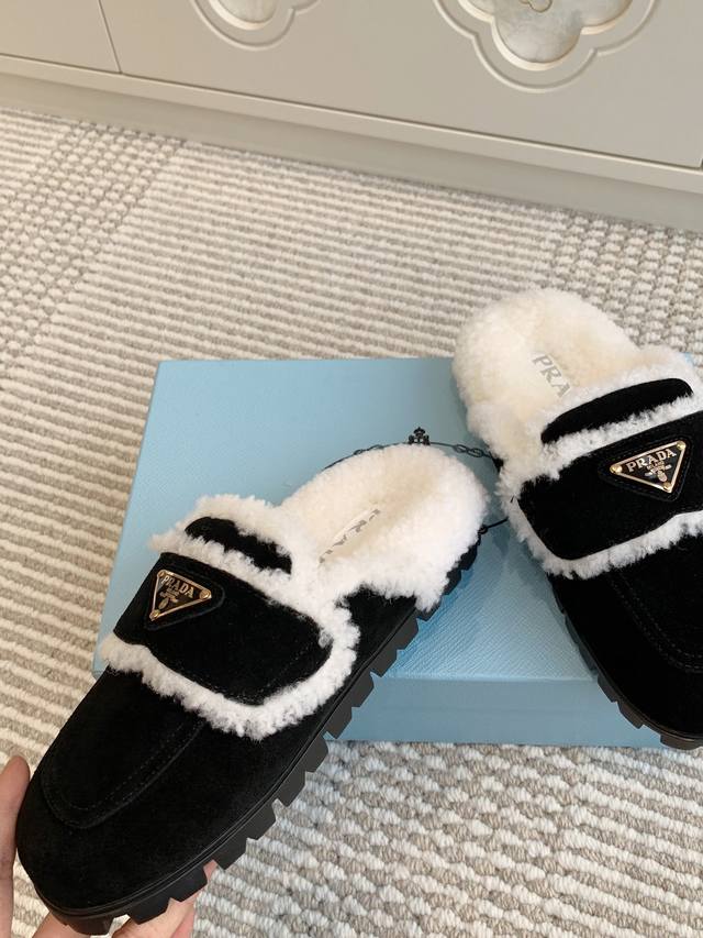 Wholesale Prada New Triangle Logo Autumn/Winter Thick-Soled Mule Slippers with Fur Toe DDD Material and Craftsmanship: DDD Imported Sheepskin Original Custom Imported Sheepskin One-Piece DDD 170% Genuine Wool Warmth Must-Have DDD Zp Mold Open Outsole DDD Size: 35-39 40, 41 Made to order, no returns or exchanges DDD