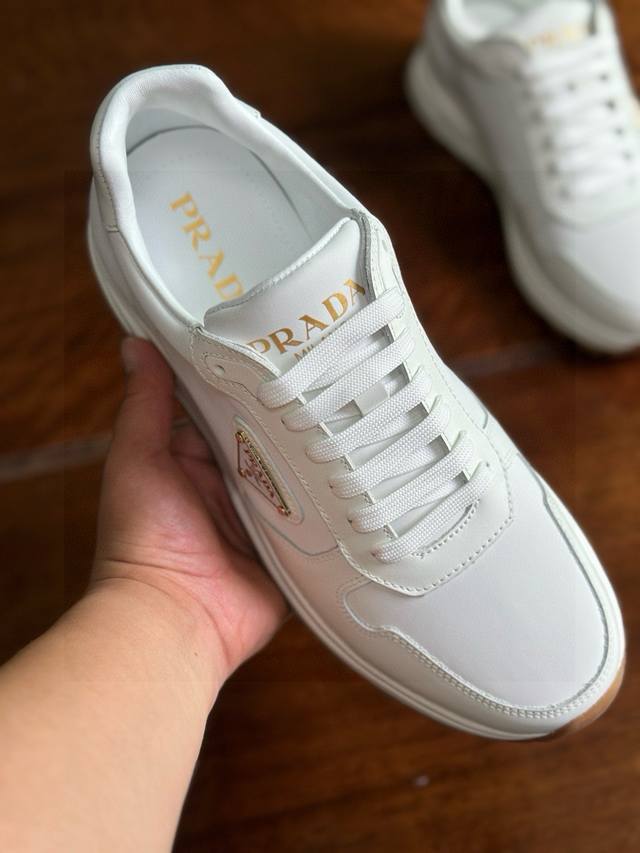 Actual Price: Prada 2025 Spring/Summer New Men's High-End Sneakers. These sneakers are casual and versatile, crafted from imported cowhide leather with an imported sheepskin lining and a lightweight foam outsole for exceptional comfort. The shoes feature soft, clean lines that create a sporty silhouette. The sole is lightweight yet stable, featuring the iconic enamel-coated triangular metal logo, and the tongue is adorned with an embossed screen-printed logo, showcasing a unique charm. Sizes: 38-46, 45, 46 (Custom sizes available).