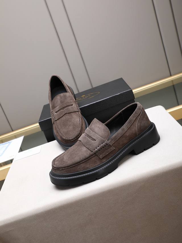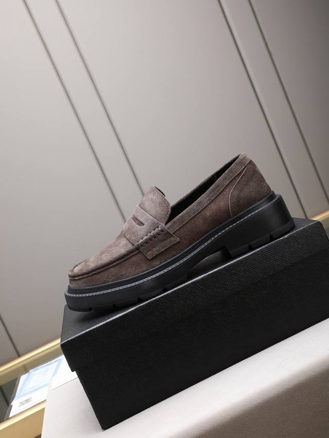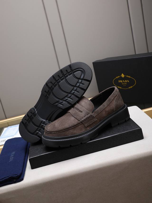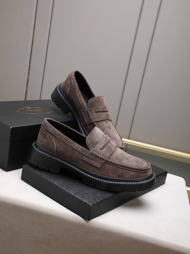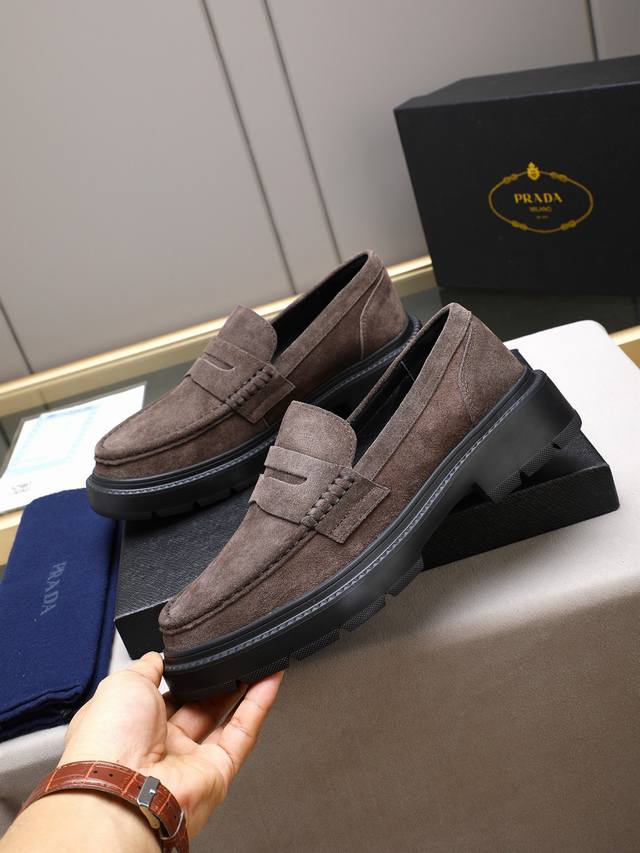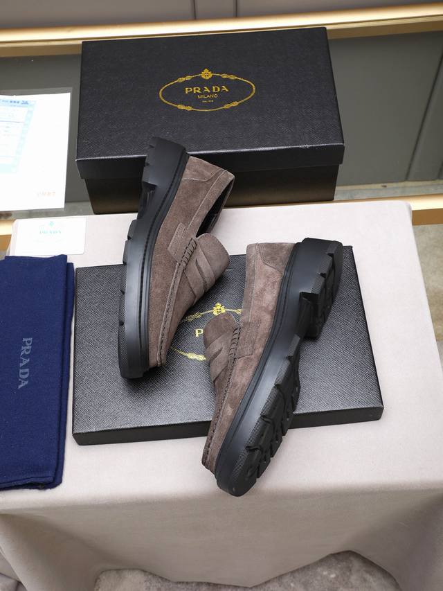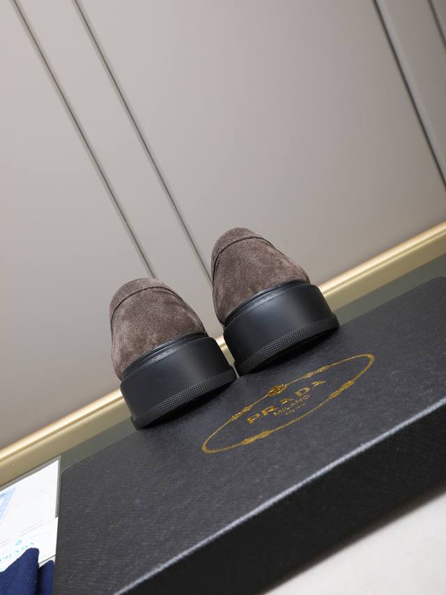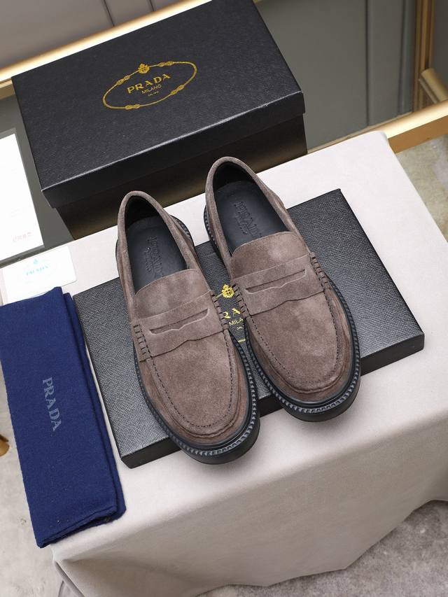Available on Tmall, Taobao, and other major platforms. These Prada men's casual leather loafers are a hot seller. Made of imported top-grain suede cowhide, they blend exquisite craftsmanship with modern charm. Highly durable, resistant to bending and deformation, and long-lasting! Features include water-dyed sheepskin lining, cowhide insole, and a lightweight, wear-resistant foam outsole. Sizes 38-44. Custom orders are not returnable or exchangeable.