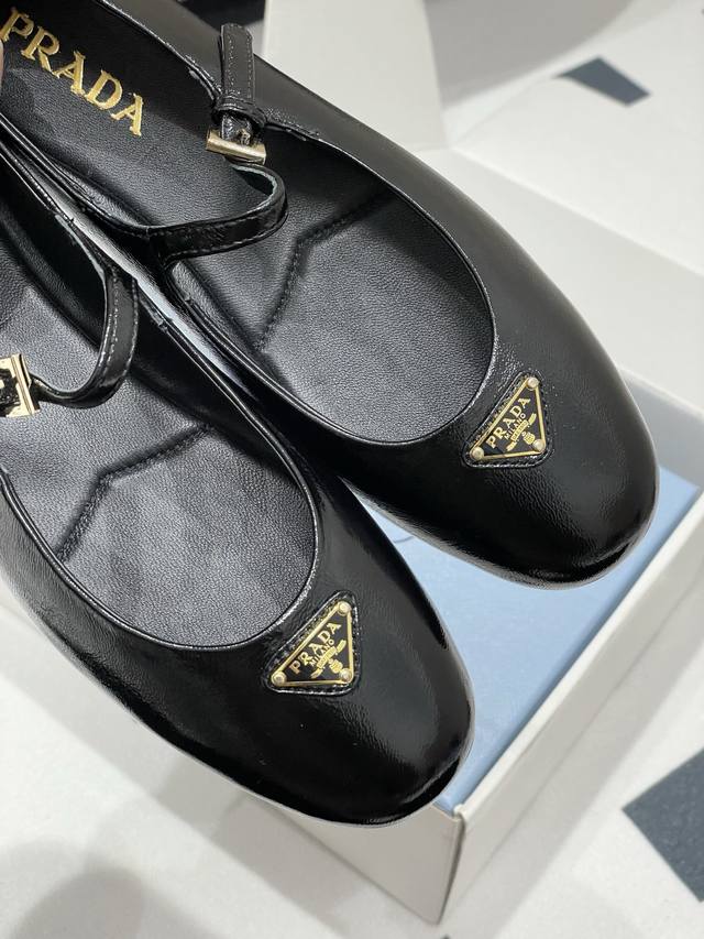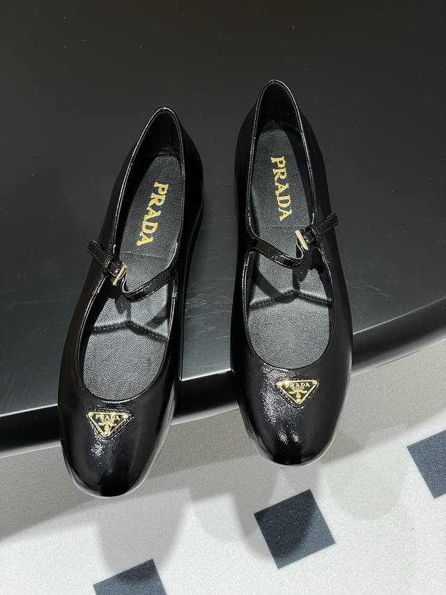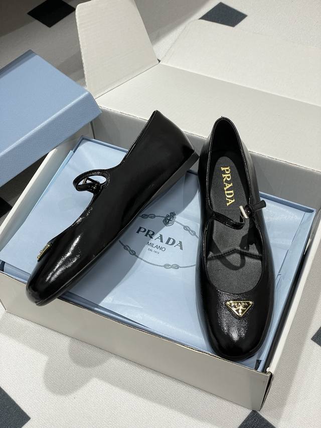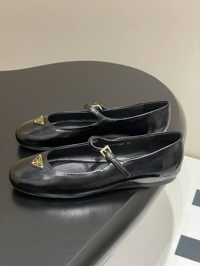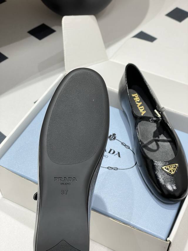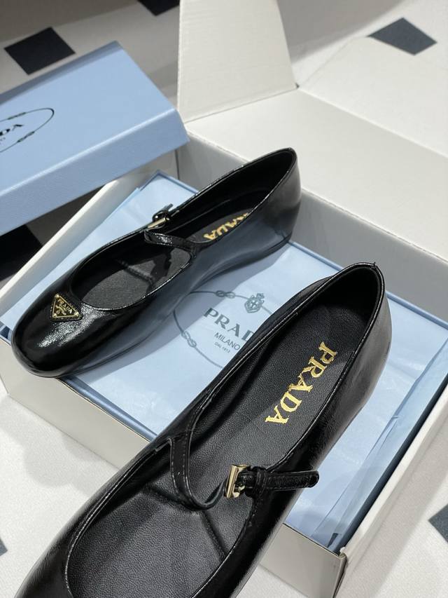 Comes with a box. Prada early spring new style wrinkled patent leather ballet flats, Mary Jane ballet flats. These ballet flats feature a tapered silhouette, with patent sheepskin leather adding a touch of sophistication and showcasing elegant femininity. They feature a round toe design, a rubber sole, and an enamel triangular metal logo, highlighting classic lines and refined details. The upper is adorned with straps and an engraved logo metal buckle. Enameled triangular metal logo. 5mm one-piece sole with a heat-pressed logo. Upper: Original wrinkled patent leather. Lining: Sheepskin lining. Heel height: Flat. Sole: Original rubber sole. Sizes: 35-39. Custom sizes 40 and 41 are non-refundable.