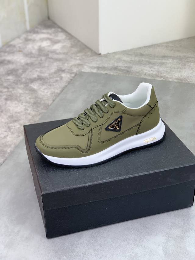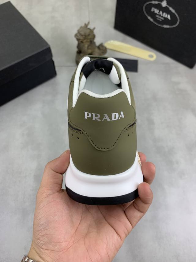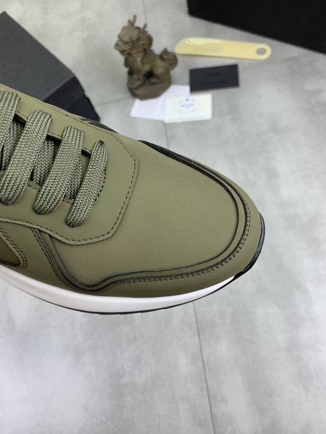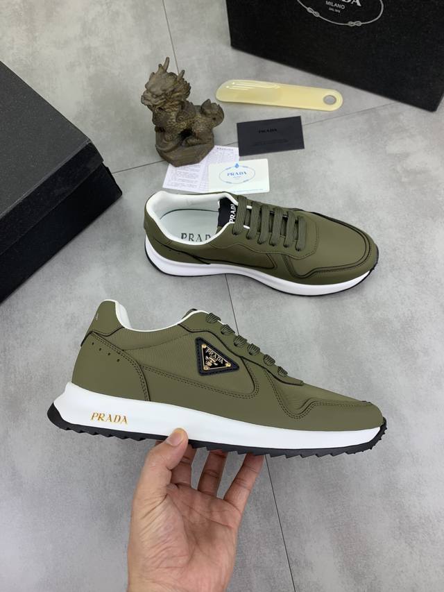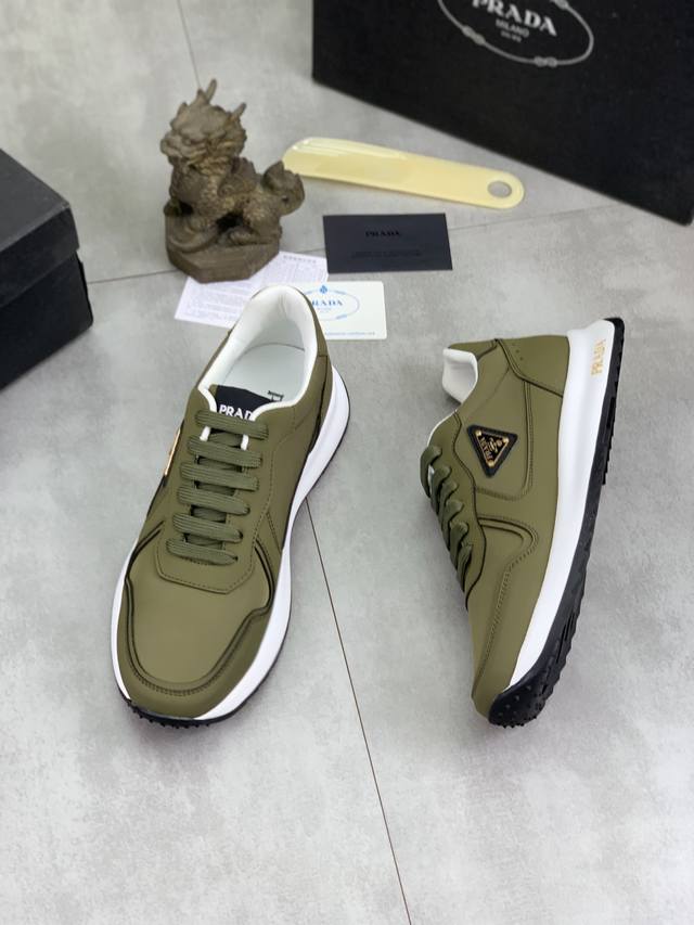 Factory direct price for men's sports shoes, original Prada breathable and comfortable men's shoes, latest classic style, 1:1 replica, Hong Kong synchronized, same as the runway; all made of calfskin with breathable mesh upper, imported soft and comfortable pigskin lining, original rubber outsole, non-slip and wear-resistant; comfortable to wear, stylish, fine workmanship, with a simple and neat last, showing a man's boldness and toughness. Sizes: 38-44 45 46, custom-made, 4 colors available.