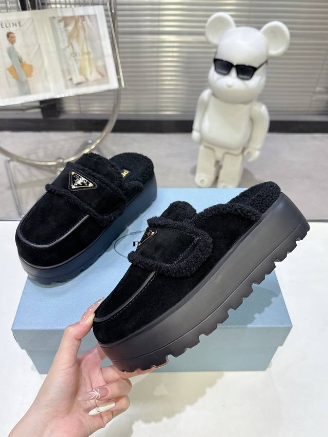 Factory direct price men's shoes and sportswear original Prada early spring slippers, runway item, suitable for winter indoors and early spring outdoors. These sheepskin slippers feature a rubber Ip ultralight foam sole, soft sheepskin quilted pattern echoing the iconic Prada triangle, and an enamel triangular metal logo for added style. Imported high-gloss cow suede, imported knitted wool, genuine wool insole, enamel triangular metal logo, 6cm rubber foam ultralight sole, studded sole pattern, sizes 35-40. Suitable for early spring. Recommended pairings: cotton elastic leggings, wool sweater, lightweight down jacket.