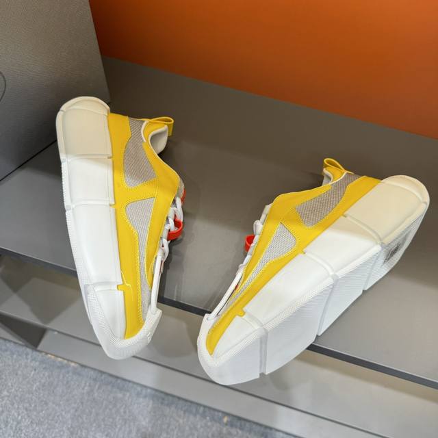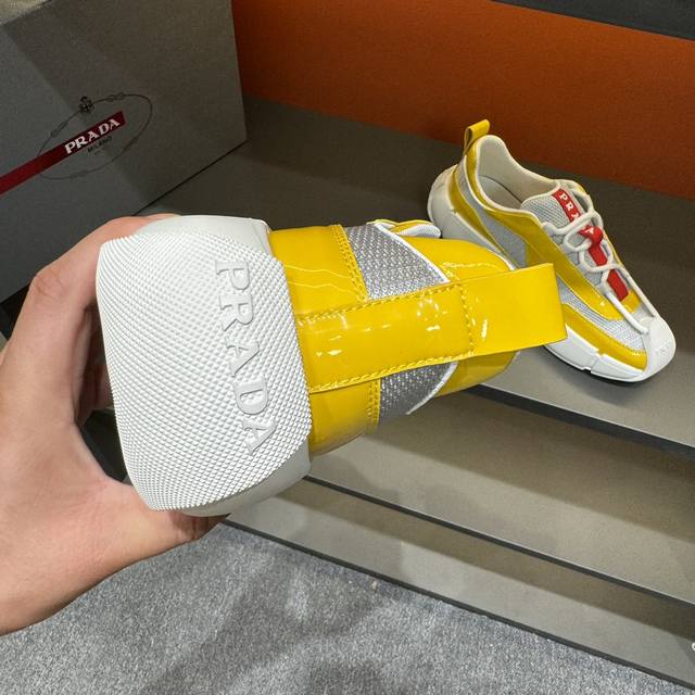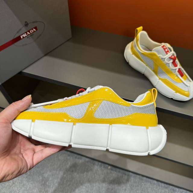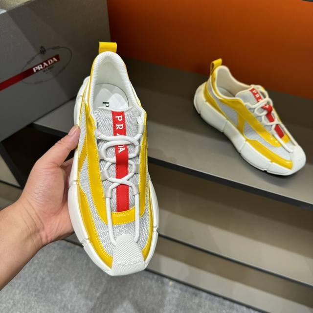 Factory direct price men's shoes, athletic shoes, original quality, sizes 38-45. Prada men's lace-up leather casual athletic shoes. The upper is made of cowhide leather with breathable mesh for a soft and comfortable feel. The tongue features the Prada brand logo. The thick rubber sole echoes the red label on the tongue. Stylish and elegant design with meticulous details. A super fashionable casual athletic shoe with excellent breathability! DDD