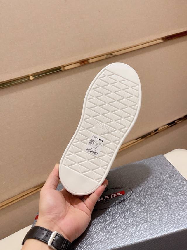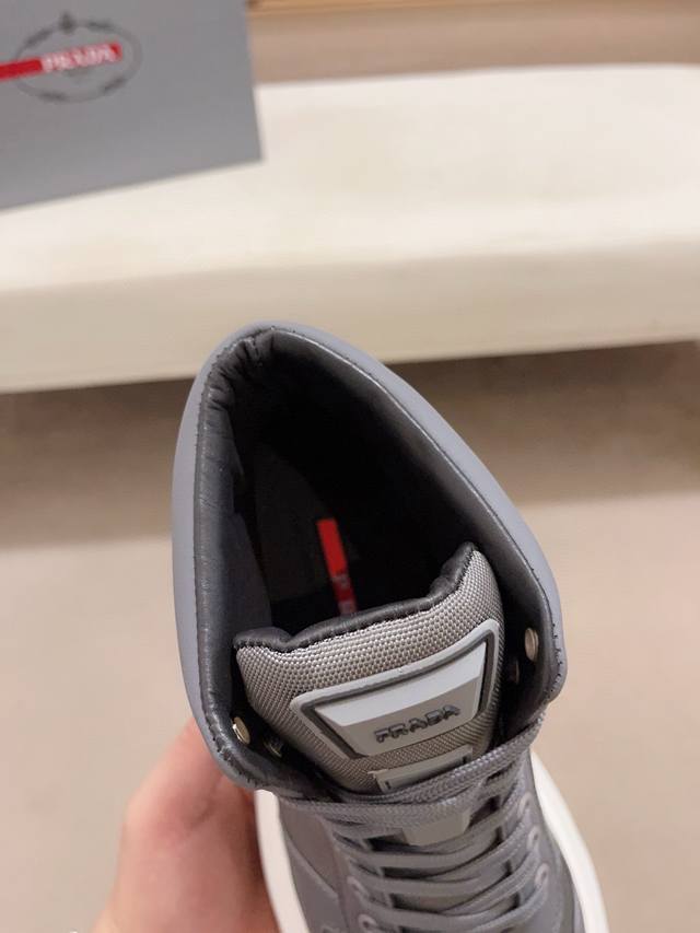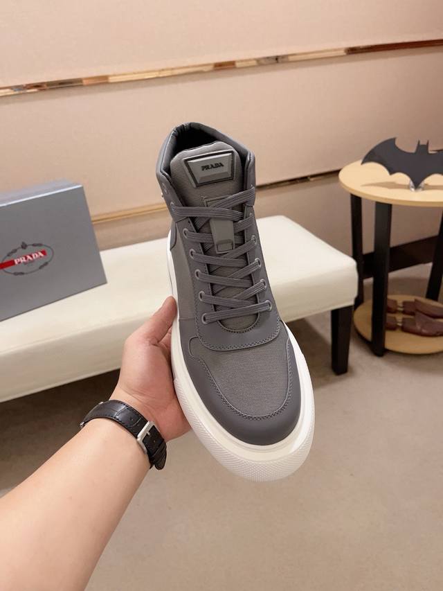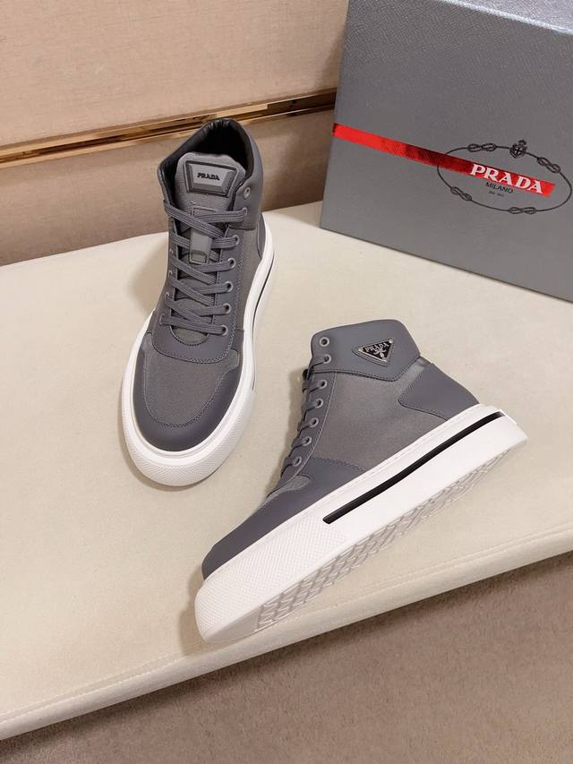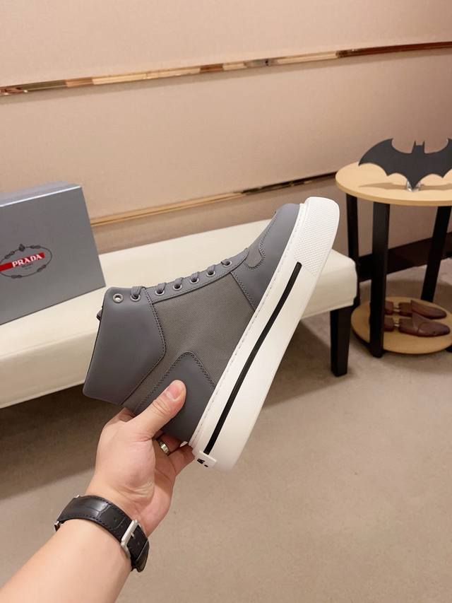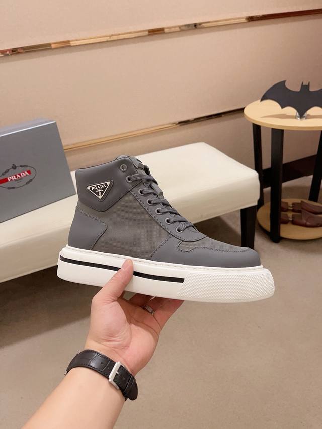 Factory direct price men's sports shoes, original high-quality new Prada high-tops, available simultaneously with boutique launch. New men's shoes, made with high-tech epoxy resin technology. Lining: Full cowhide. High-end air-cushioned molded non-slip rubber outsole. Exquisite lines, simple and stylish, comfortable and high-end, suitable for casual travel. Sizes: 38-44, custom sizes available, no returns or exchanges.