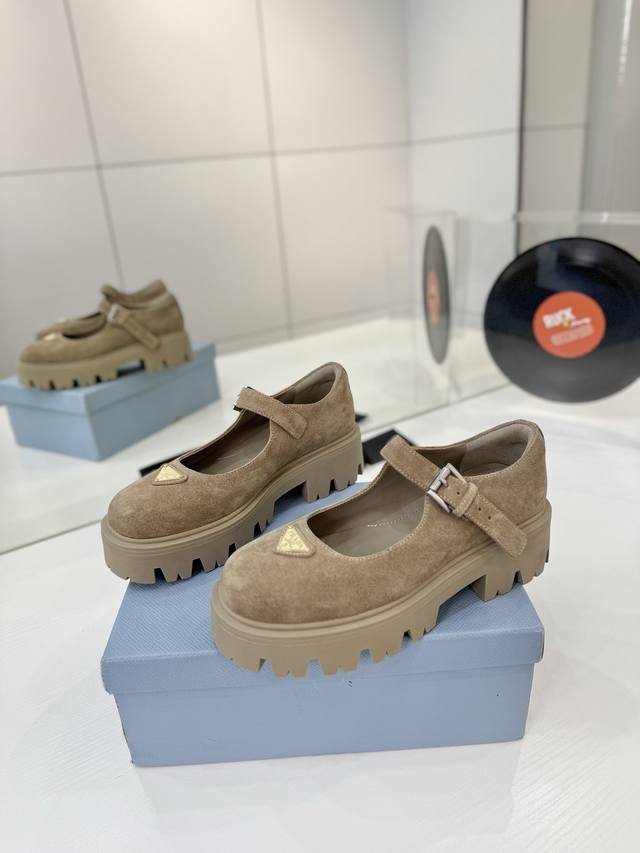 Factory direct price Prada Mary Jane shoes, triangular buckle platform loafers, complete set. These shoes feature a decorative strap and a metal buckle with an enamel triangular logo. The retro-chic platform sole paired with a cowhide upper makes the shoes lightweight and comfortable, and makes legs appear longer. Upper: Two-tone cowhide premium suede. Lining: Cowhide. Outsole: Original molded outsole. Sizes: 35-40, 41 (custom orders, no returns or exchanges).