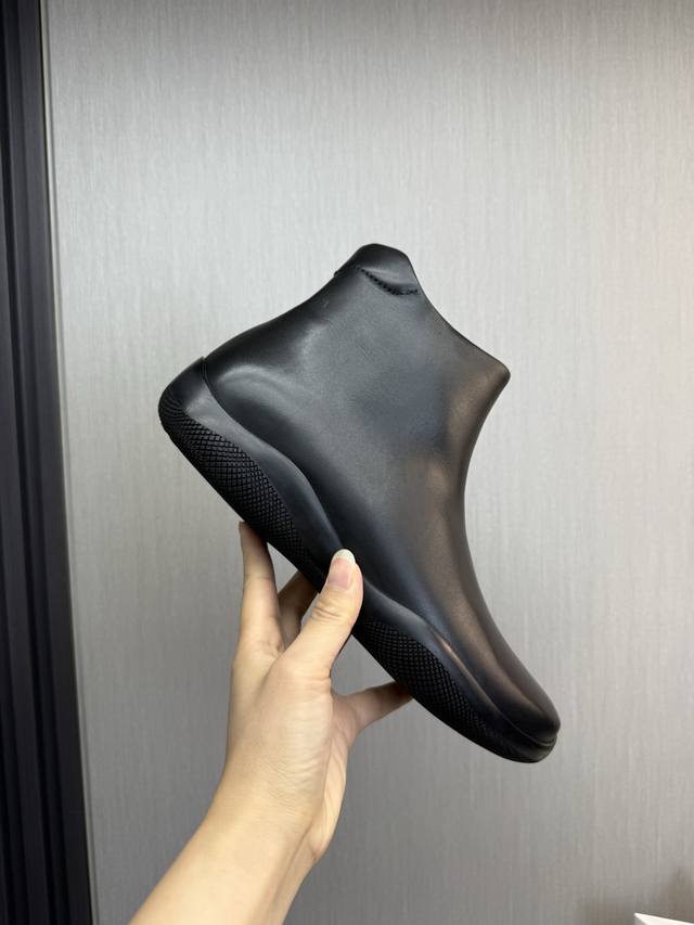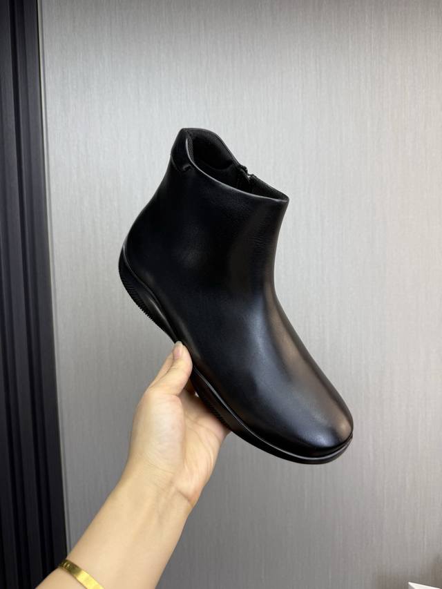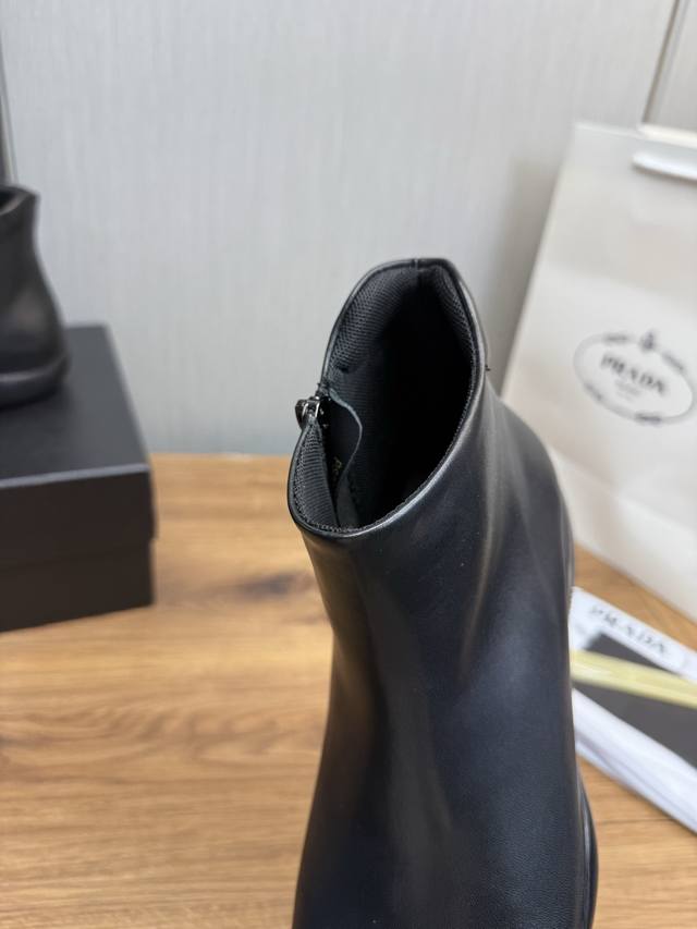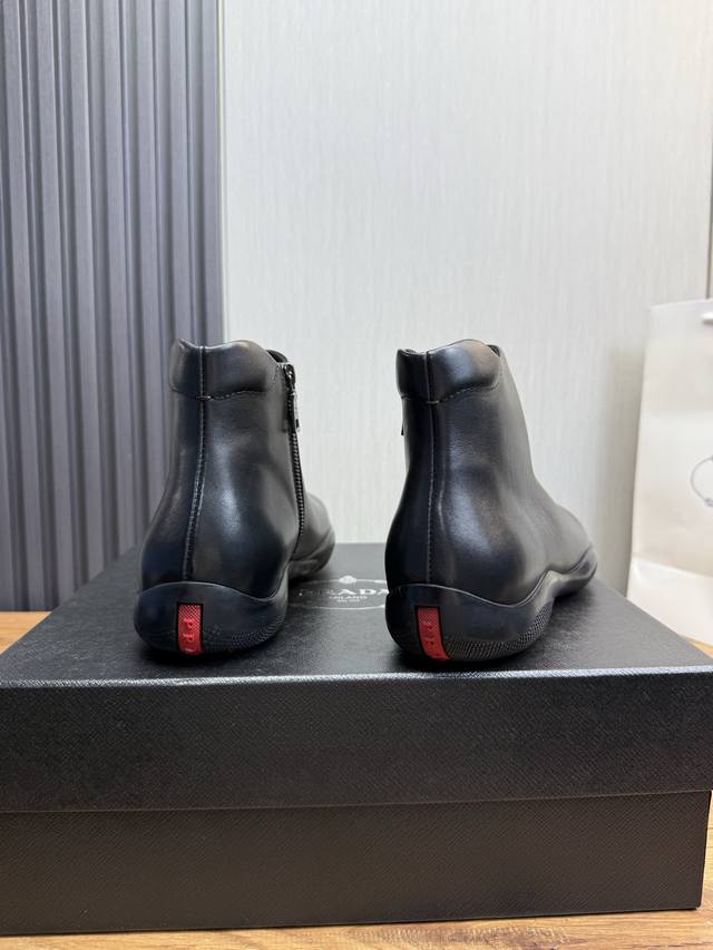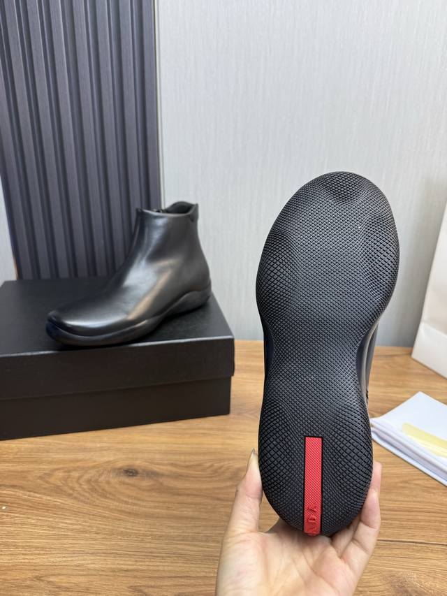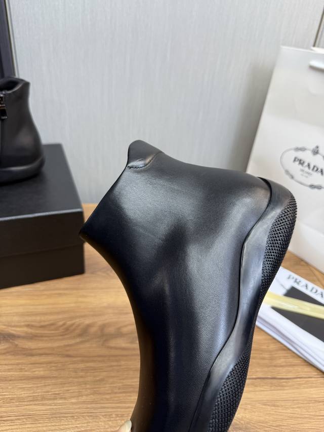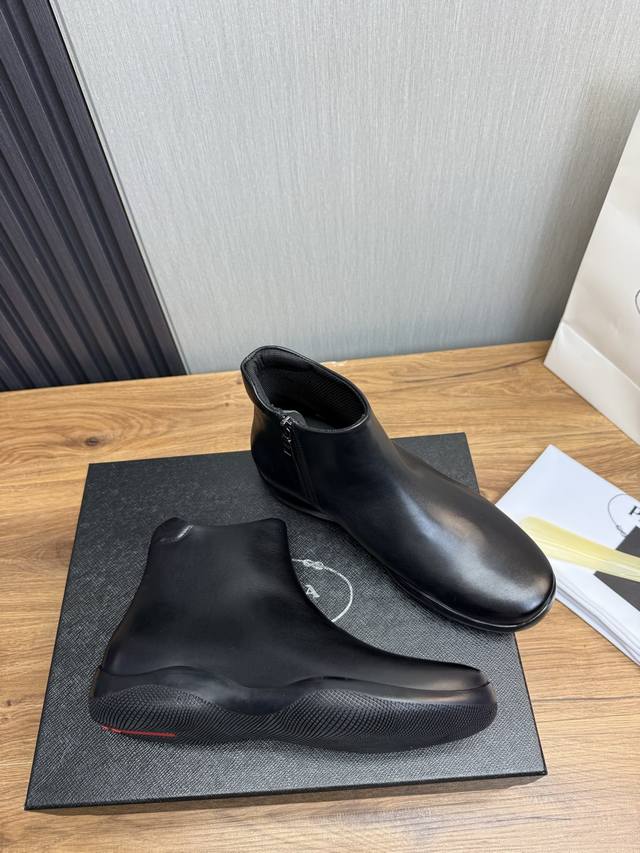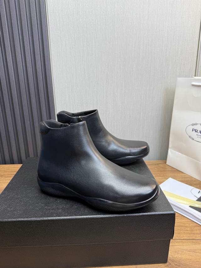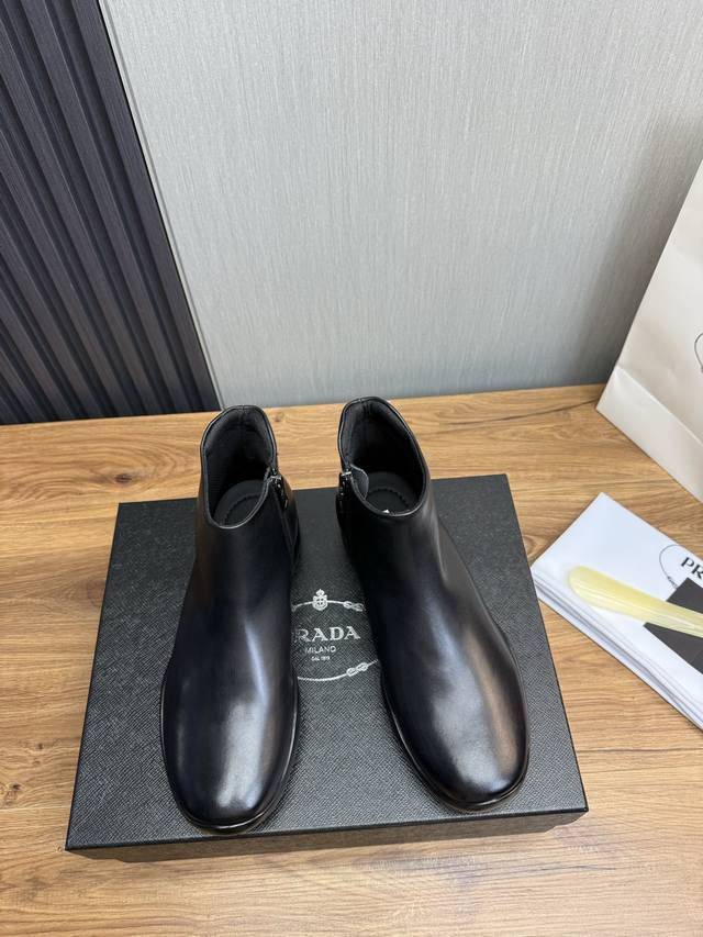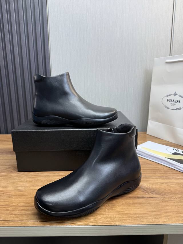 Factory direct price, Prada men's mid-top ankle boots, slip-on design, top-quality Dongguan-made boots. Made with imported cowhide, this boot features a simple and novel design, soft and glossy leather, excellent durability and resistance to deformation. The upper has stylish stitching with adjustable Velcro closures and an engraved logo. The interior is crafted from water-dyed calfskin and features a standard silver logo. The lightweight rubber insole and thick, comfortable, and durable sole provide excellent comfort. Sold in original packaging! Standard leather shoe sizes: 39-44#