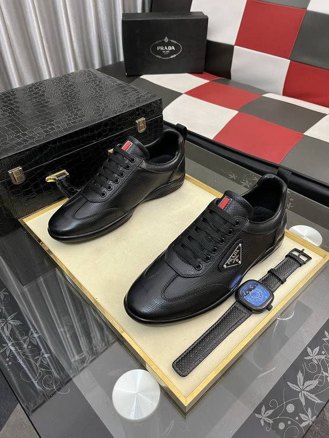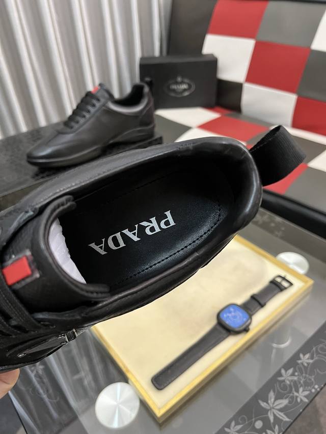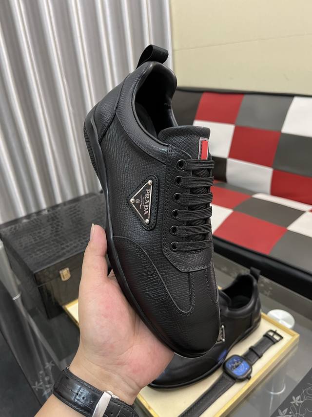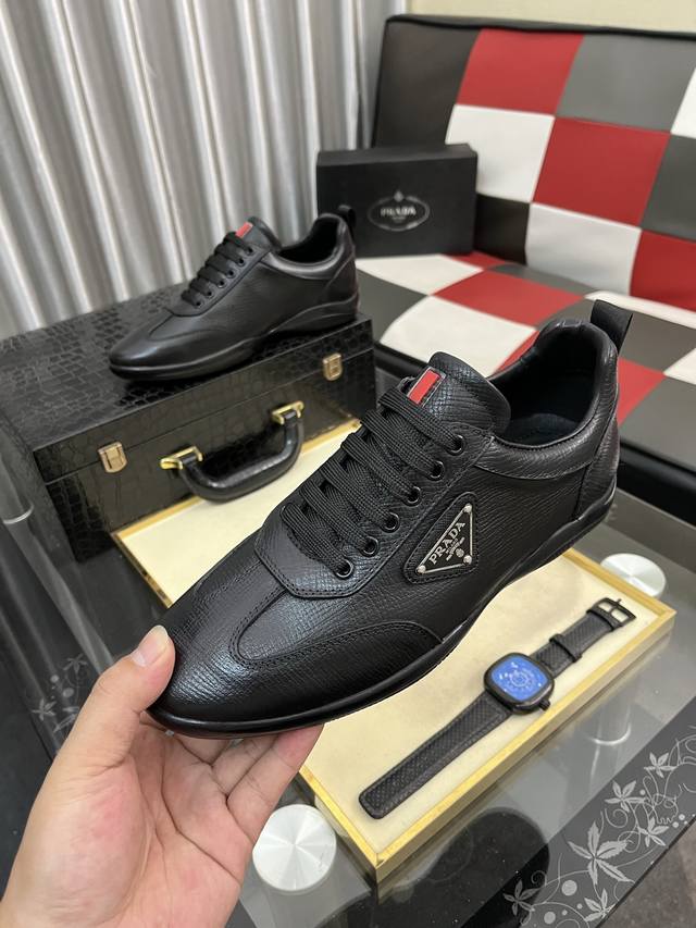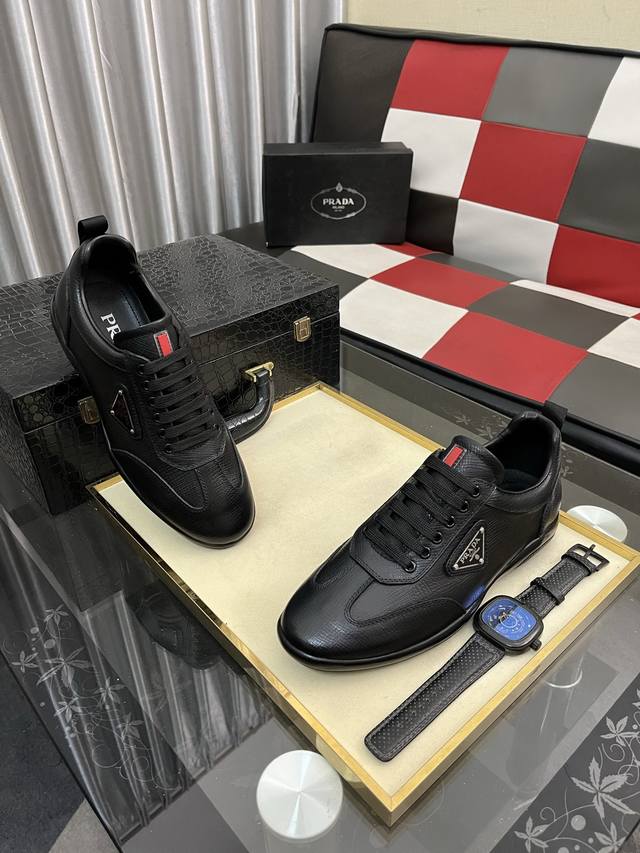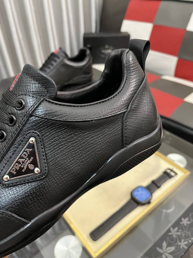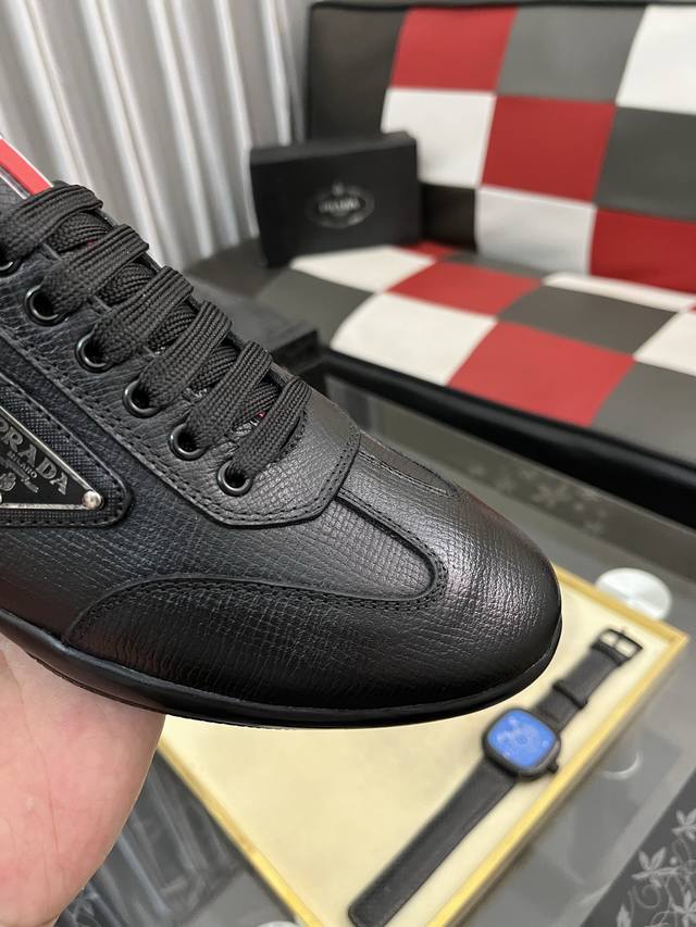 Factory direct price: Prada men's premium boutique, minimalist casual sneakers. These shoes are crafted from leather and nylon, creating an unexpected textural contrast. A unique tonal finish creates a distinctive design, with an enamel metal triangle logo on the upper for a simple yet sophisticated look, complemented by elements inspired by the iconic Symbol pattern. Sizes: 38-443 available.
