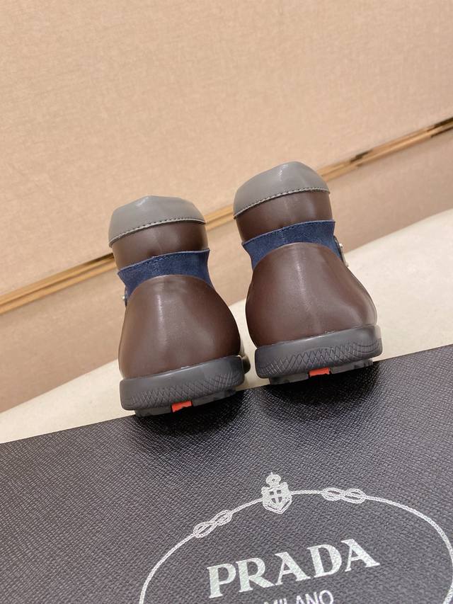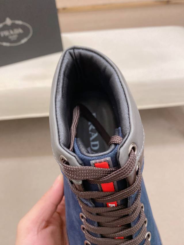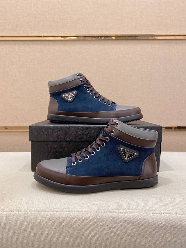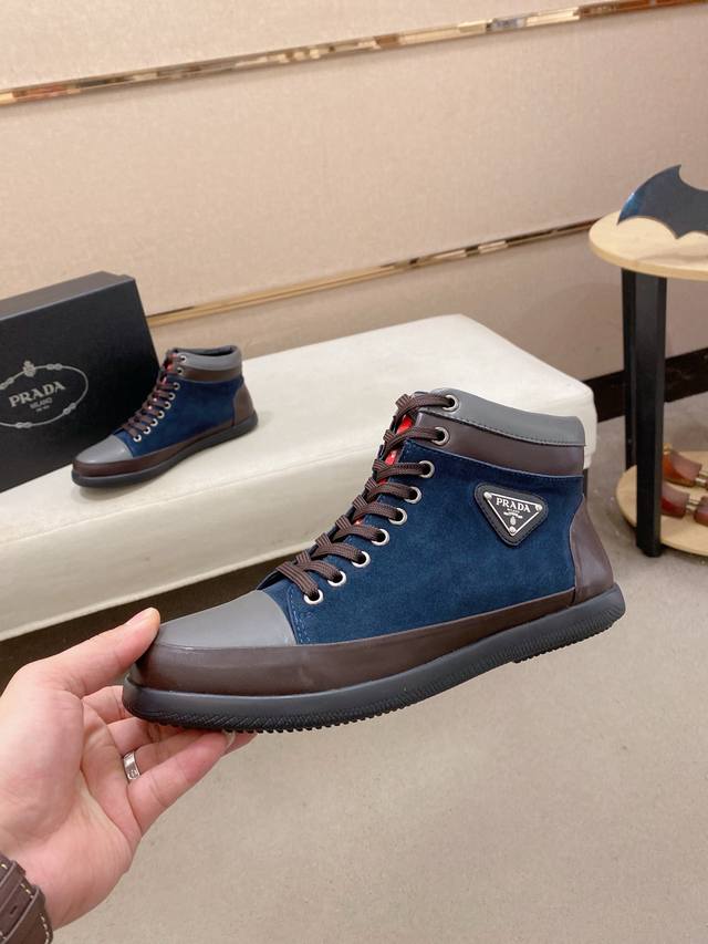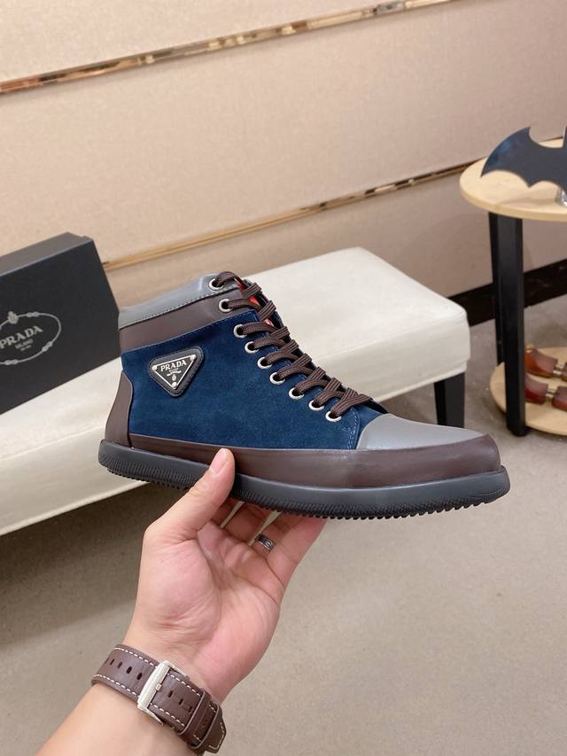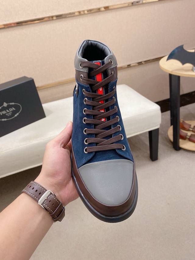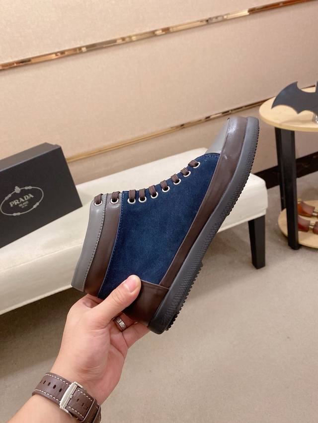 Factory direct price Prada official website latest high-top casual fashion men's shoes, popular style with a simple and stylish design, exclusively for trendy men. Features original brand elements and decorations, fashionable and generous, original cowhide and sheepskin lining, official website specified wear-resistant casual outsole, classic style from boutiques, actual product photos, sizes 38-44.