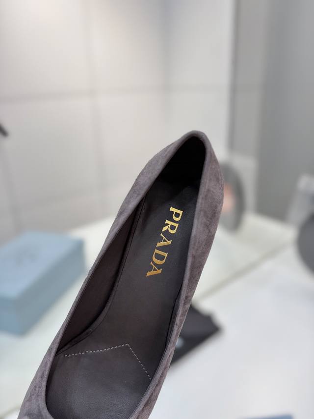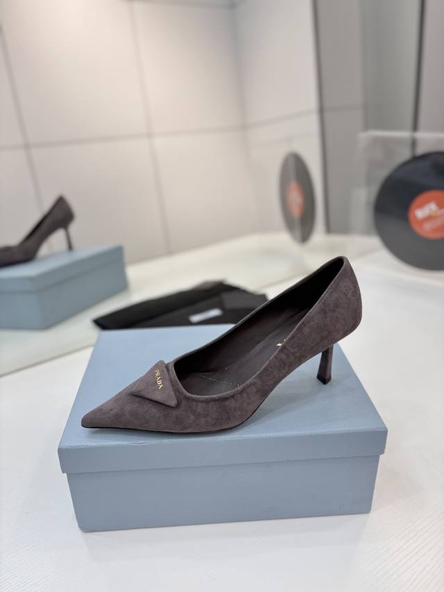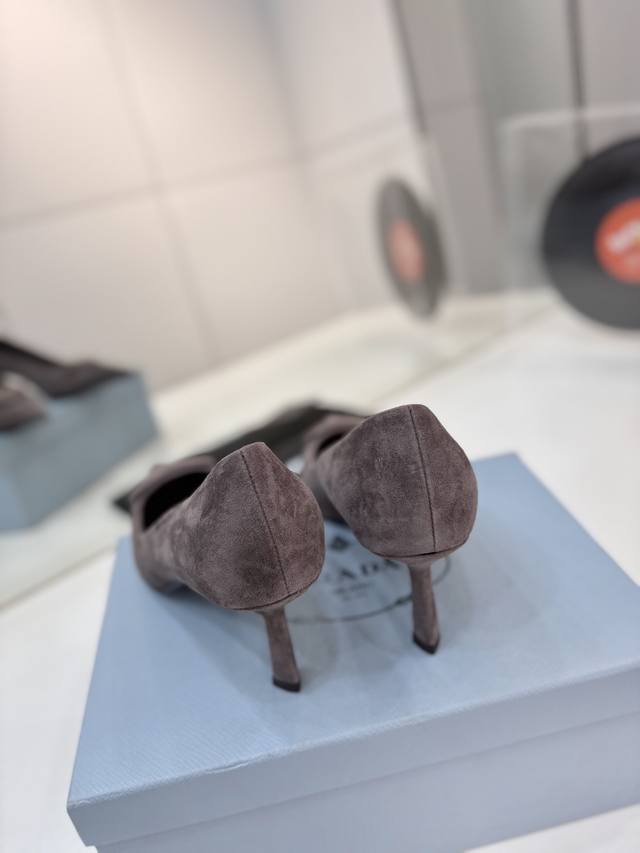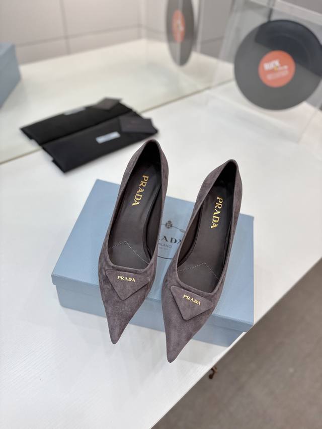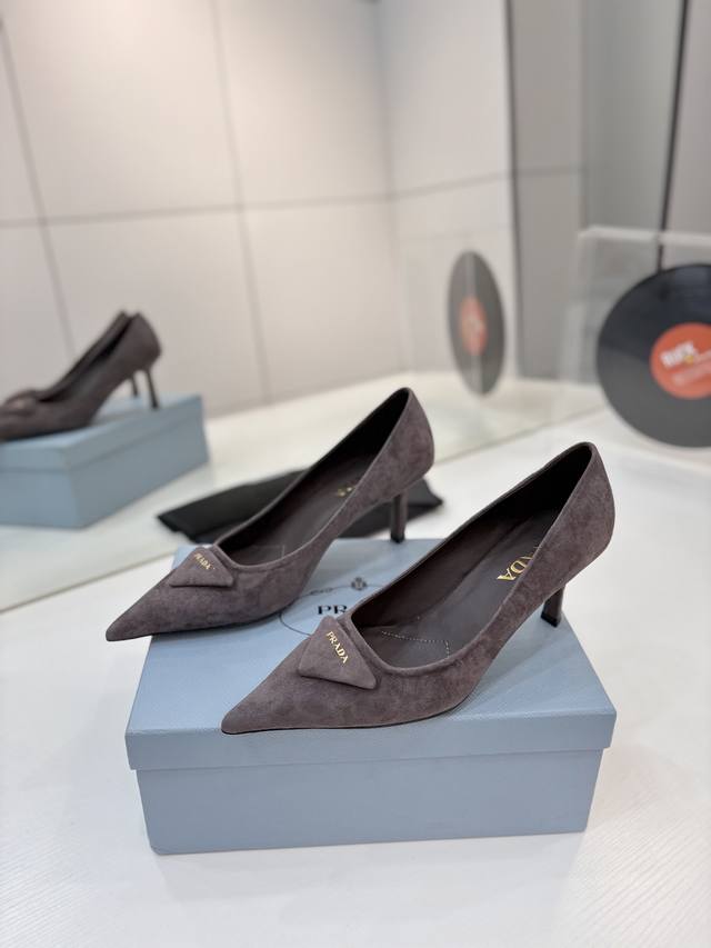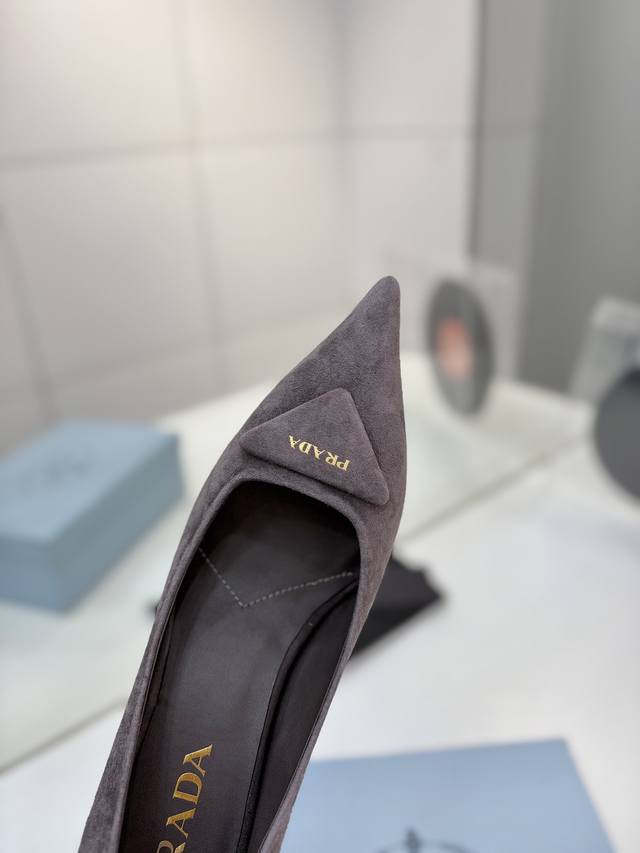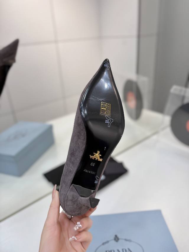 Factory direct price Prada suede sandals with gold logo, runway style pointed toe sandals with triangle buckle, high heels, early spring runway style! Upper: High-quality custom suede material; Lining: Imported water-dyed sheepskin; Outsole: Original Italian genuine leather; Heel height: 7.5cm; Sizes: 35-41, 41 custom-made.