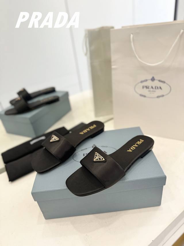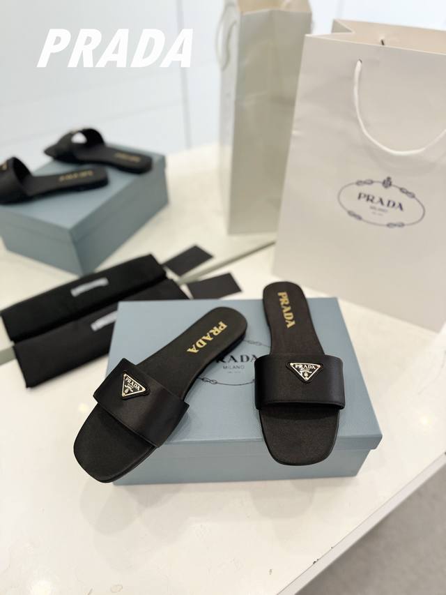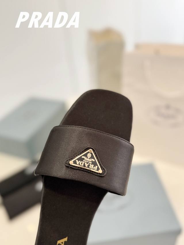 Factory direct price Prada's latest hot-selling triangle logo slippers. This high-quality, cost-effective version uses top-grade cowhide with split edges and imported high-grade silk fabric. The delicate and smooth material is made with a high-definition alloy triangle logo and a high-performance genuine leather outsole. A summer essential that requires minimal care. Comes with standard packaging. Upper: Cowhide with split edges, silk fabric. Outsole: Italian genuine leather. Sizes 35-39. Custom orders are non-refundable.