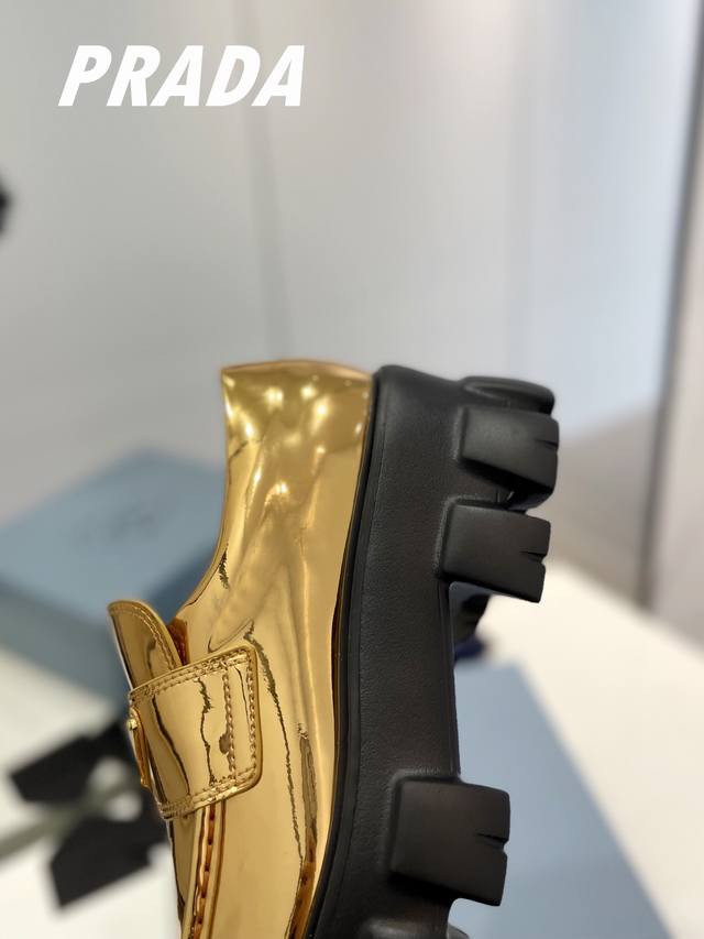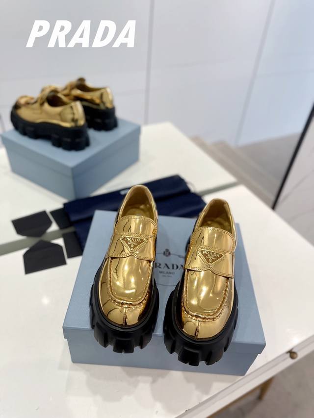 Factory direct price, top-quality Prada classic wheel-style platform sole + classic loafer upper. This Prada platform casual shoe is a foolproof choice, a 1:1 replica. The sole is lightweight and super comfortable. The sole is 5.5cm high. The upper is made of original imported split-edge cowhide. The insole is made of imported water-dyed cowhide. It is decorated with a triangular logo. Top quality. Women's sizes 35-41. Sizes 40 and 41 are custom-made and non-refundable.