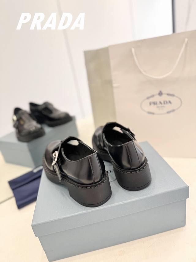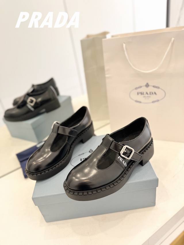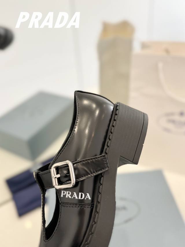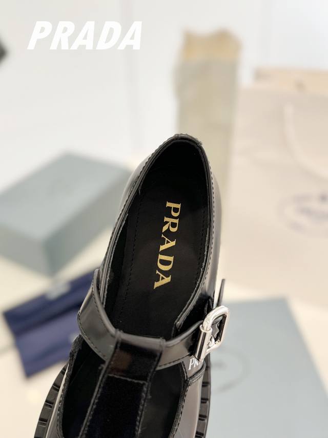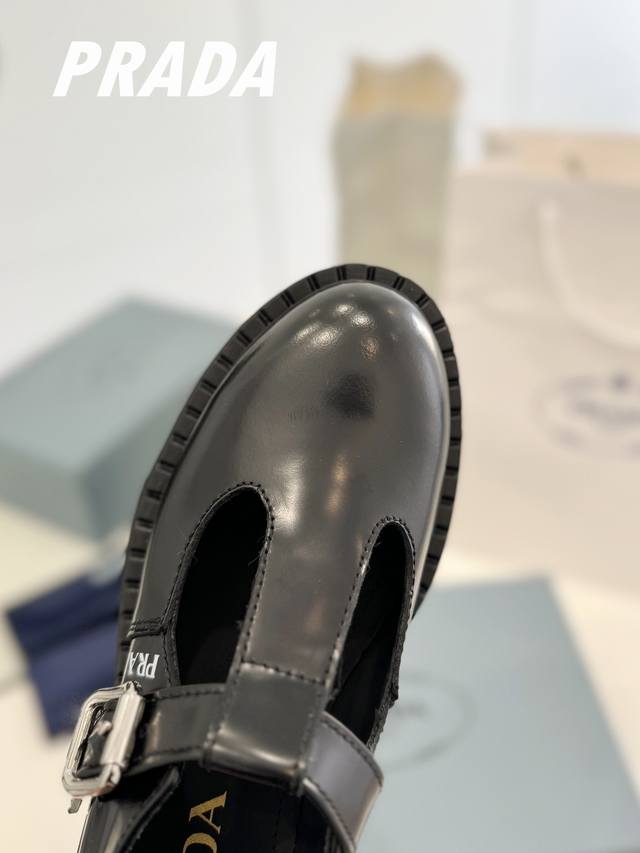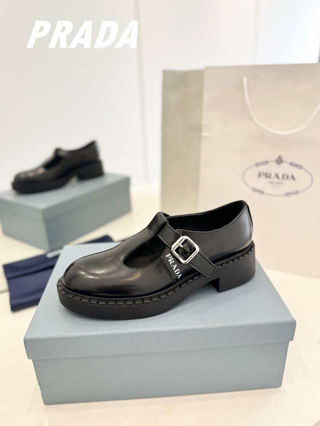 Factory direct price top-tier Prada openwork T-strap upper, Mary Jane British retro design, classic and timeless! Original molded last, perfect 1:1 shape, imported high-end materials present exquisite texture! The upper is made of original imported split-edge cowhide, the lining and insole are made of imported water-dyed cowhide, and it features a custom-made A-grade high-density TPU outsole. Luxurious packaging! Unique quality! Sizes: 35-41. Sizes 40 and 41 are custom-made and non-refundable.