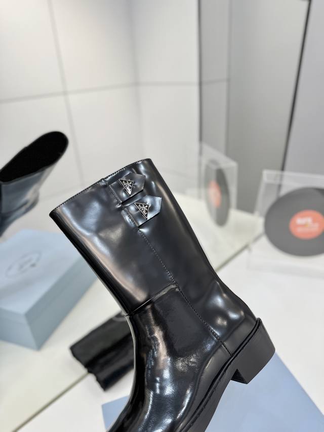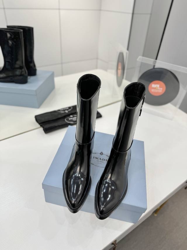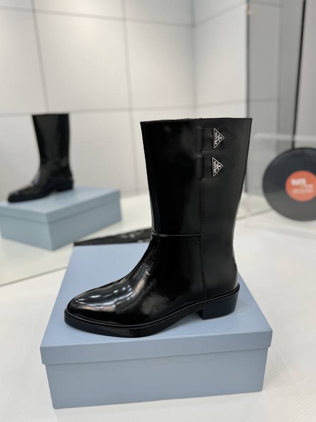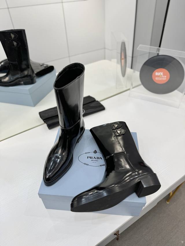 Factory price, new autumn/winter Prada pointed toe double buckle slip-on boots. These leather boots capture a minimalist aesthetic, interpreting the essence of contemporary design and creating a full, three-dimensional silhouette. The flowing lines and metal engraved logo highlight a distinctive personality. Upper: Split-edge cowhide, high-gloss suede. Lining/Insole: Sheepskin. Heel height: 3.5cm. Sole: Rubber outsole. Sizes: 35-41. Sizes 40 and 41 are custom-made and non-refundable.