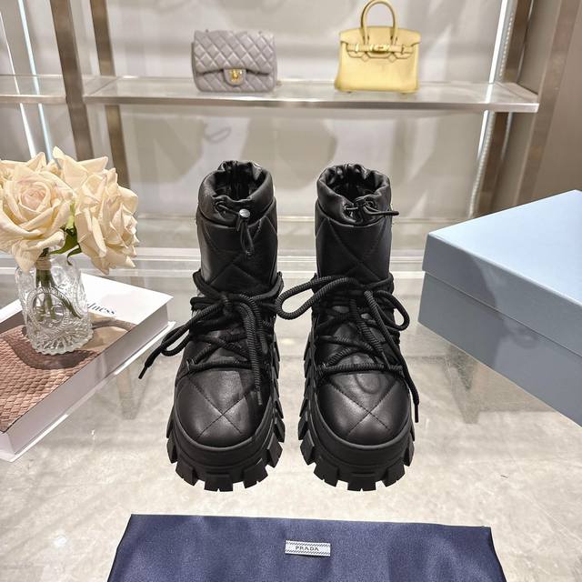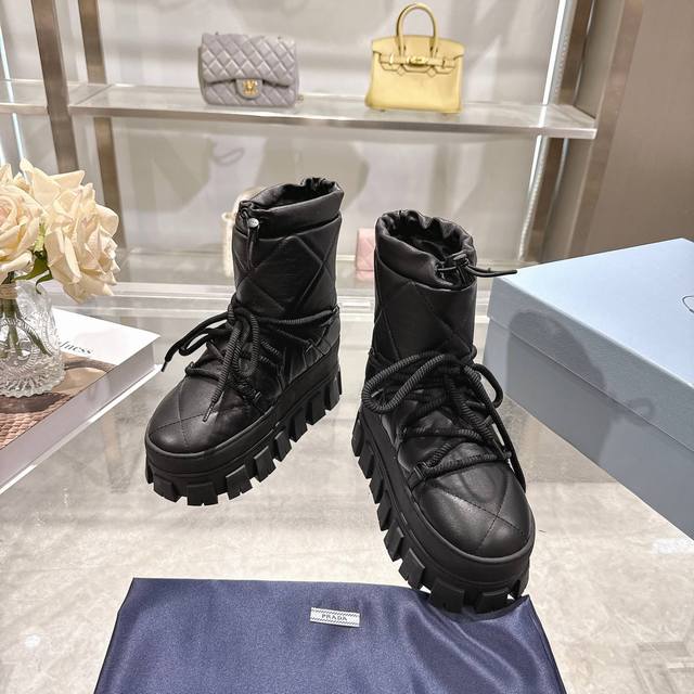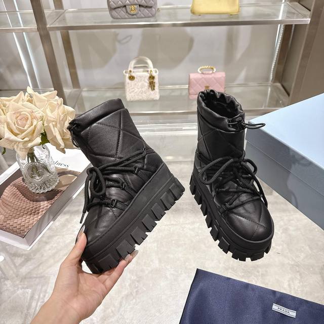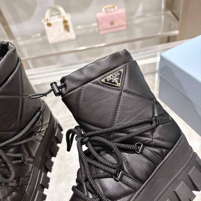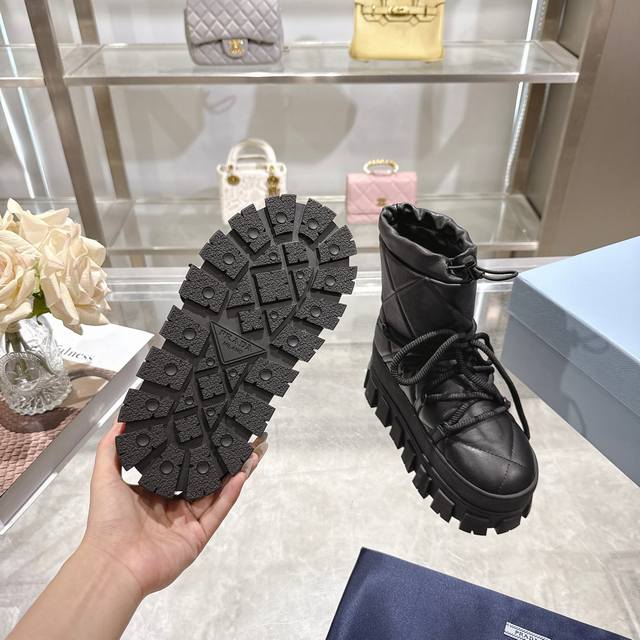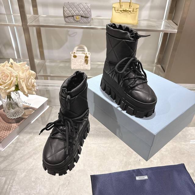 Factory Price (pp): DDD Latest Prada Snow Boots DDD Enameled Triangular Metal Logo DDD Boot Shaft: 14cm DDD Thick Sole, 50mm DDD Embossed 1:1 Original Outsole DDD Notched Edge DDD Colors: 4 DDD Sizes: 35-42 41.42 Custom Made DDD