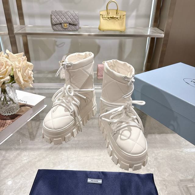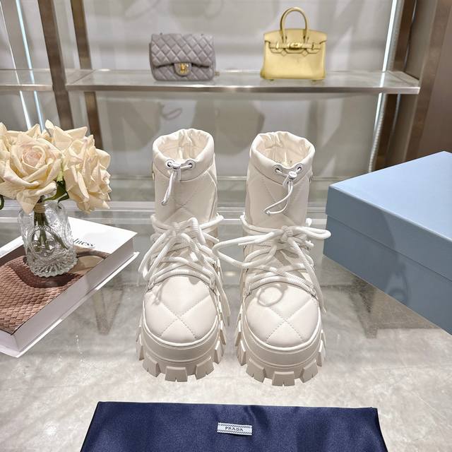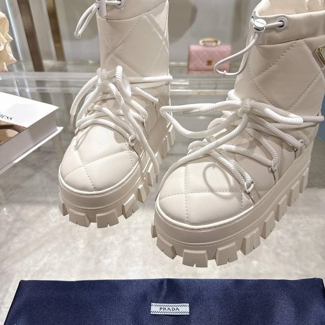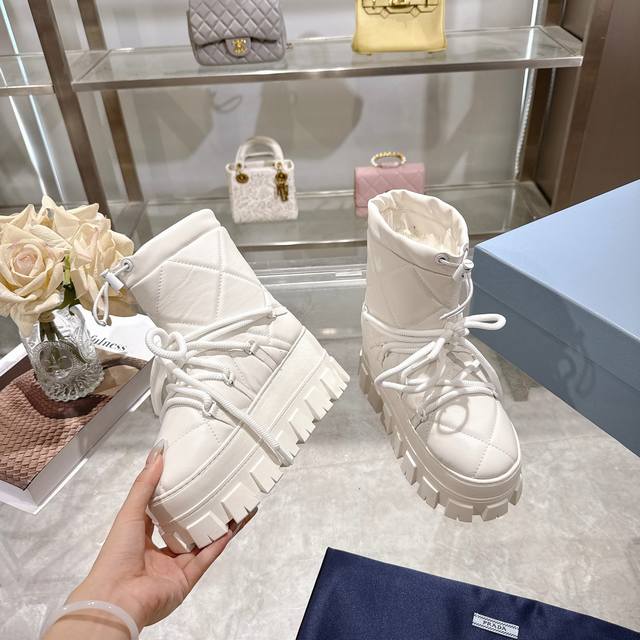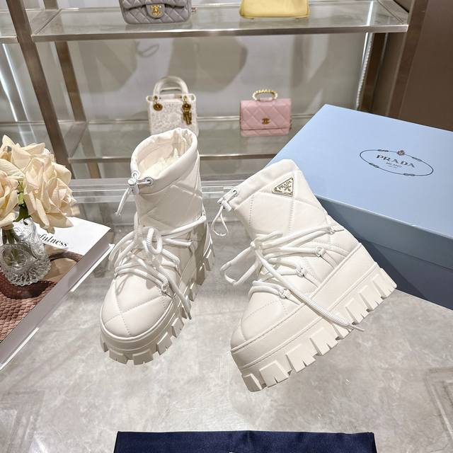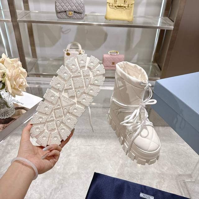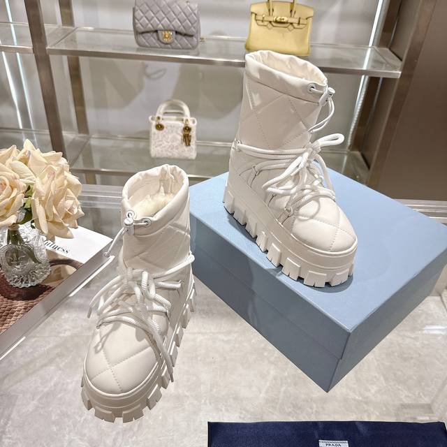 Factory Price (pp): DDD Latest Prada Snow Boots DDD Enameled Triangular Metal Logo DDD Boot Shaft: 14cm DDD Thick Sole, 50mm DDD Embossed 1:1 Original Outsole DDD Notched Edge DDD Colors: 4 DDD Sizes: 35-42 41.42 Custom Made DDD