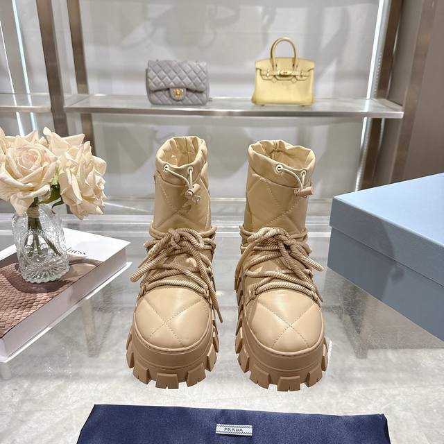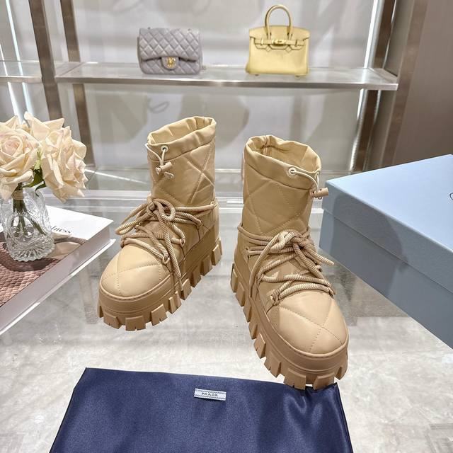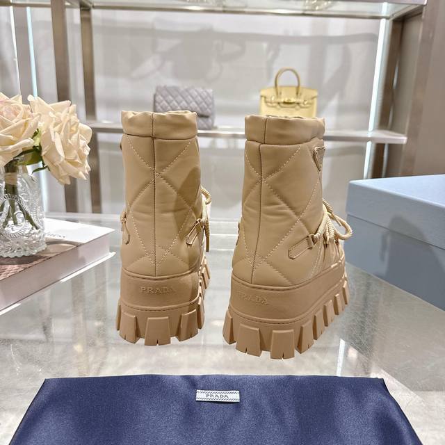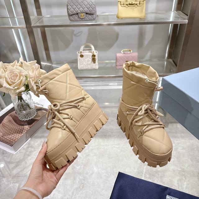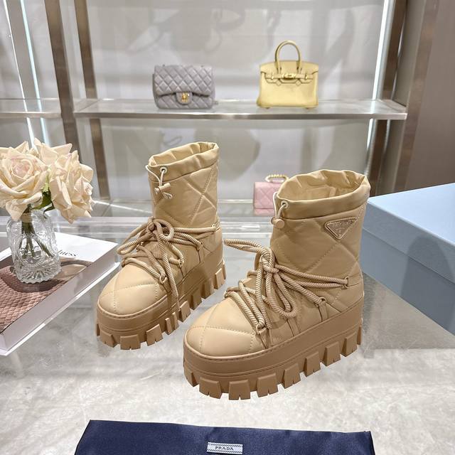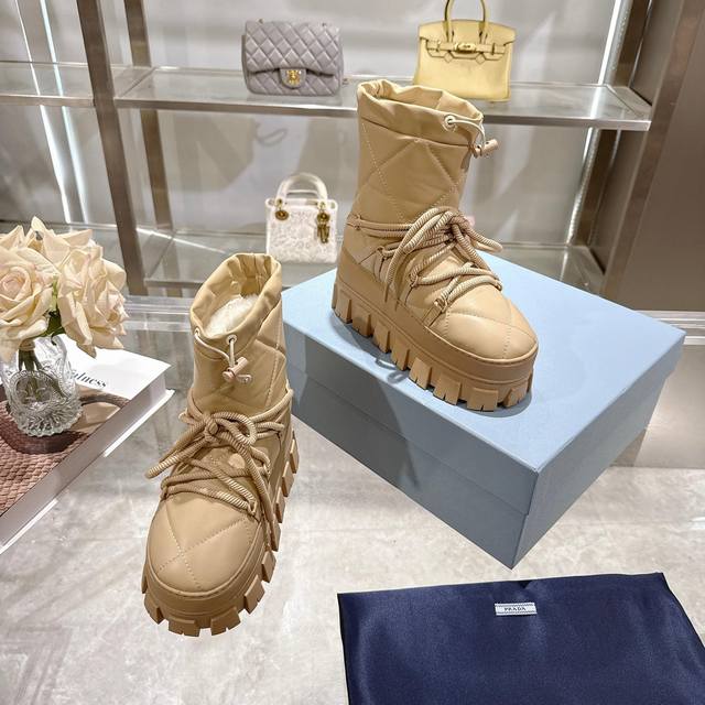 Factory Price (pp): DDD Latest Prada Snow Boots DDD Enameled Triangular Metal Logo DDD Boot Shaft: 14cm DDD Thick Sole, 50mm DDD Embossed 1:1 Original Outsole DDD Notched Edge DDD Colors: 4 DDD Sizes: 35-42 41.42 Custom Made DDD