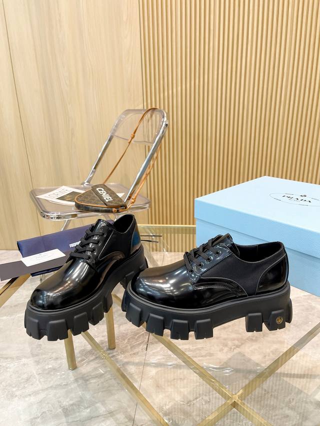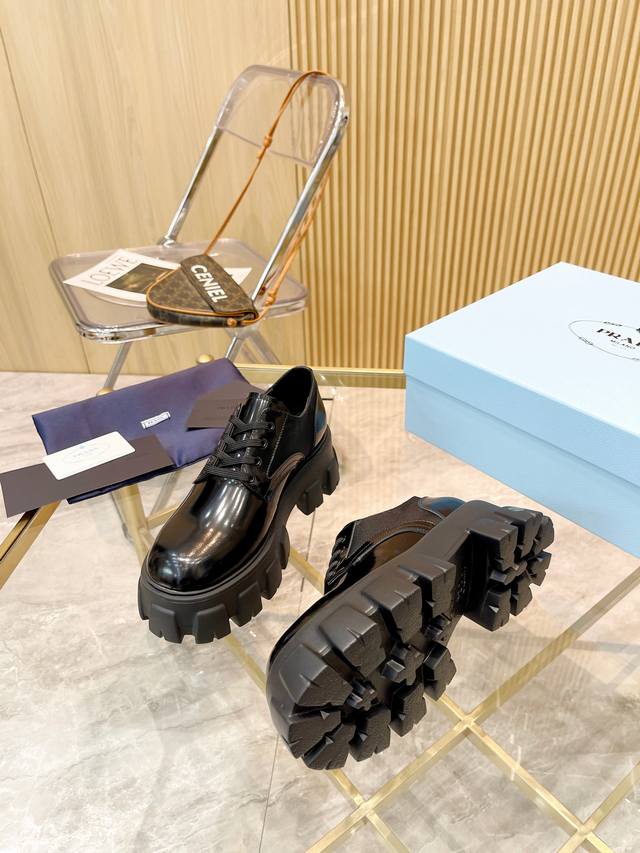 Factory Price: pp: Prada's new black open-edge calfskin leather + cowhide pads thick-soled casual leather shoes. Prada's platform shoes are very popular this year. They are both height-enhancing and casual. The refreshing performance is enough to show the control of every detail of the shoes.