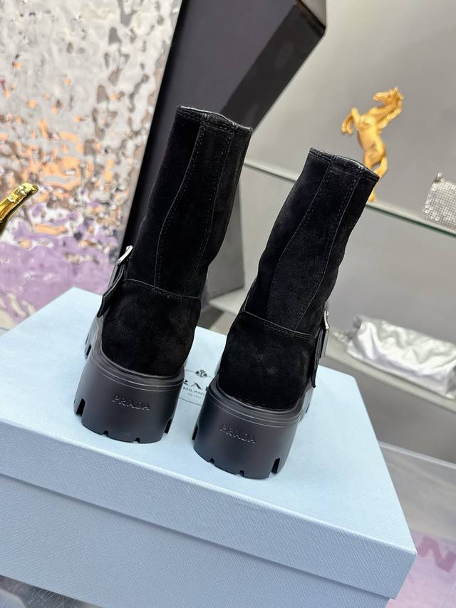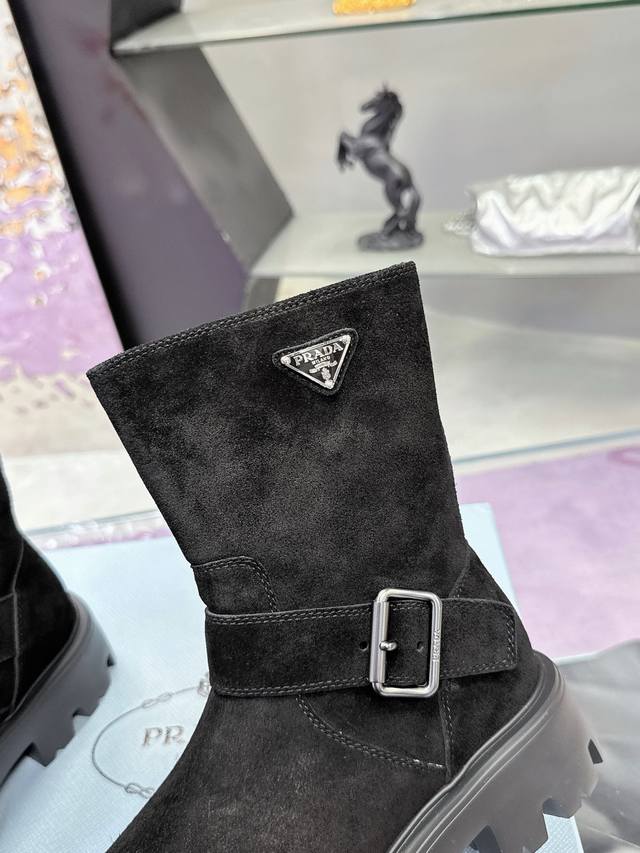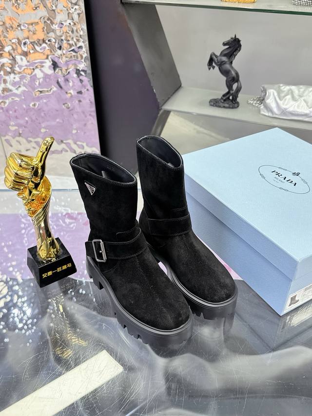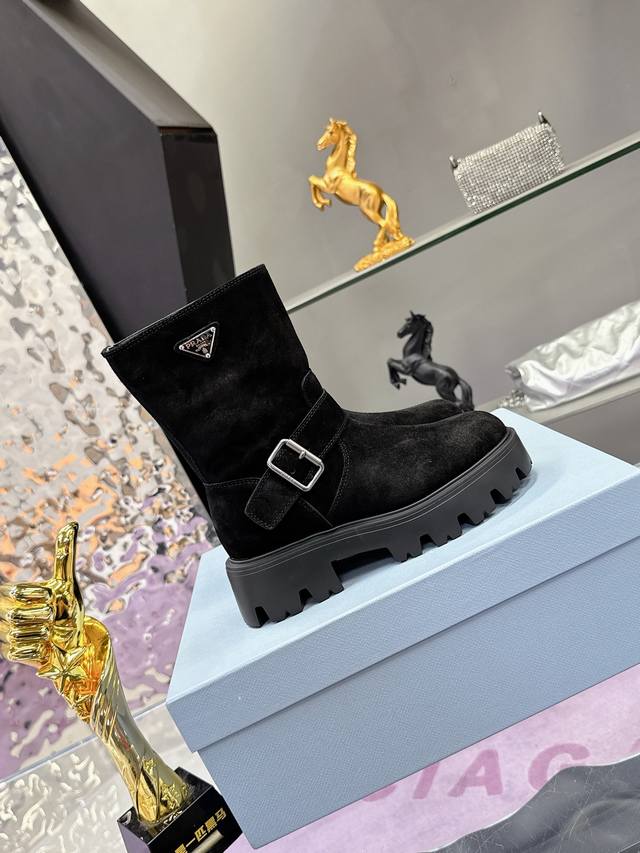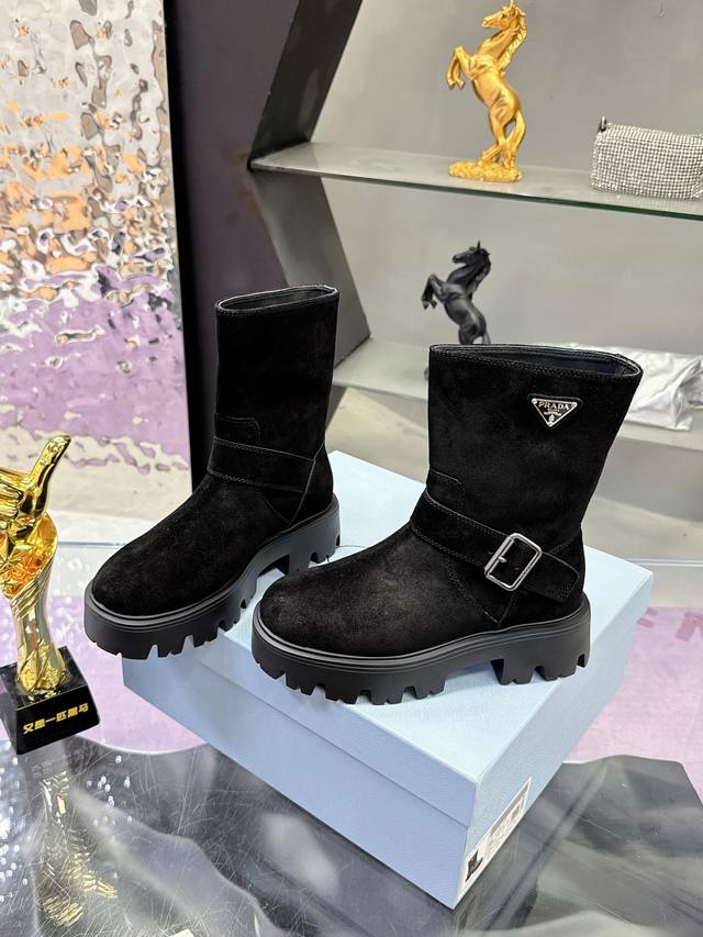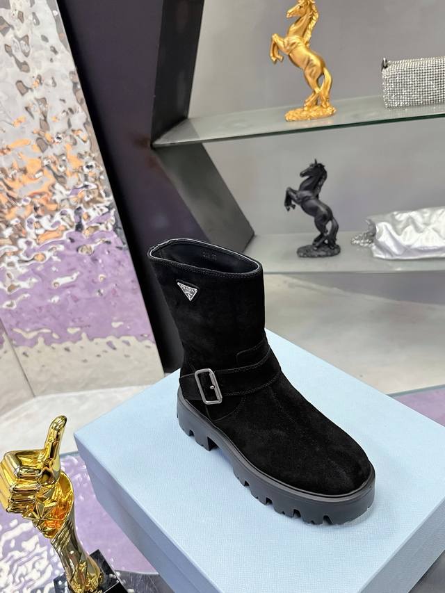 Factory Price: Prada Classic Triangle Logo Slip-on Women's Ankle Boots - A must-have for winter, this is definitely a hot item this year!! Super stylish! Prada boots are truly amazing! They look sophisticated and make your legs appear slimmer, perfectly capturing a chic and elegant look. The entire series uses various imported materials: imported high-gloss cowhide, cowhide, silk cowhide lining, rubber foam sole for lightweight comfort! Sizes: 35-40, 41. Custom orders are non-refundable and non-exchangeable.