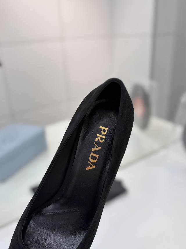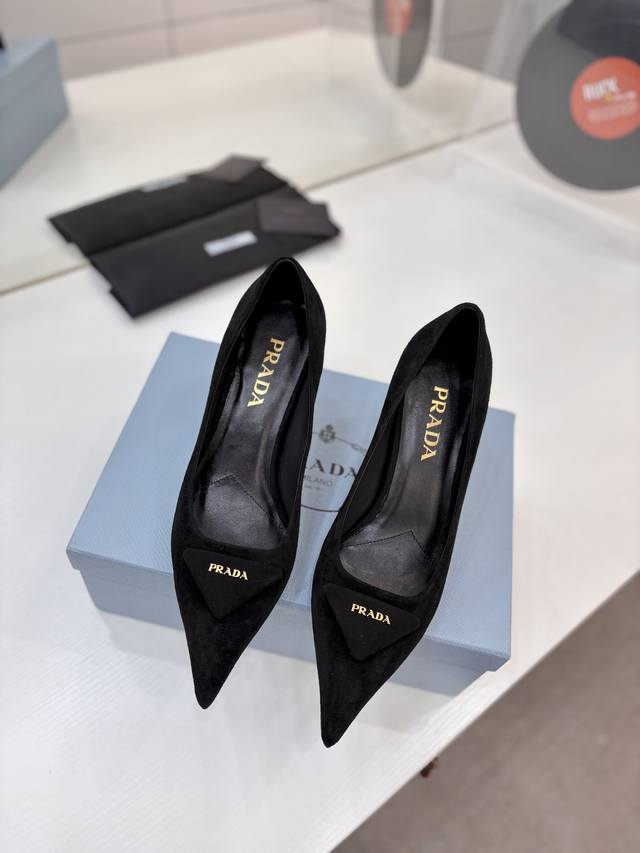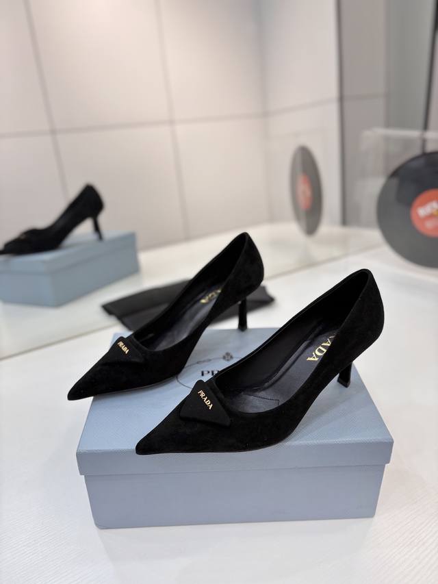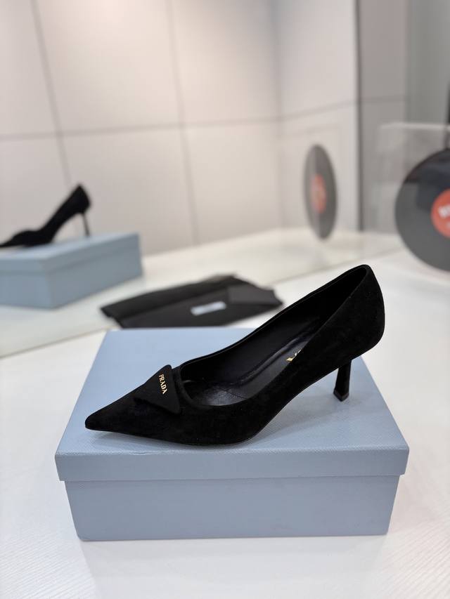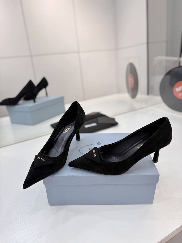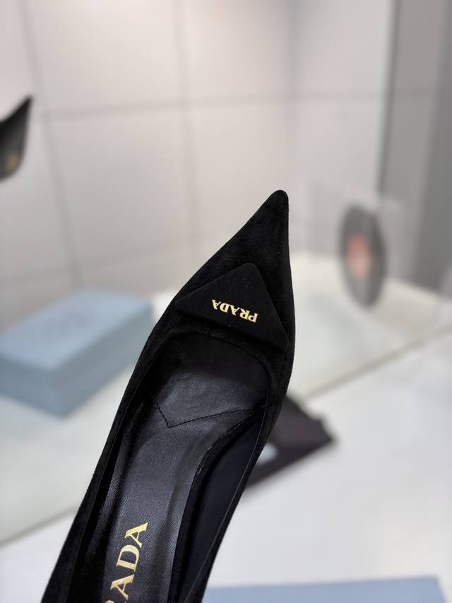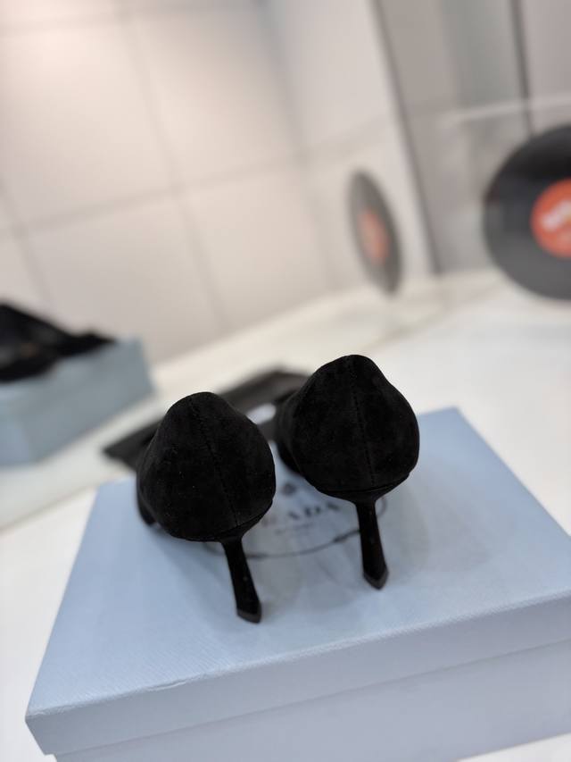 Factory price Prada suede sandals with gold logo, runway style pointed toe sandals with triangle buckle, high heels, early spring runway style! Upper: High-quality custom suede material; Lining: Imported water-dyed sheepskin; Outsole: Original Italian genuine leather; Heel height: 7.5cm; Sizes: 35-41 (41 custom-made).