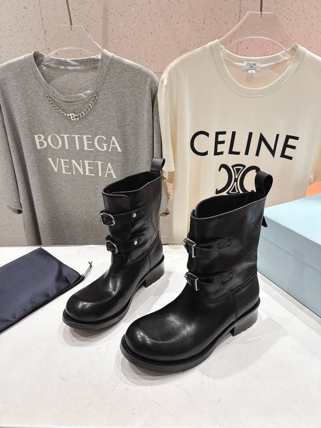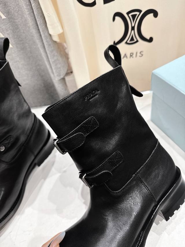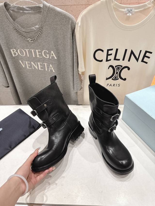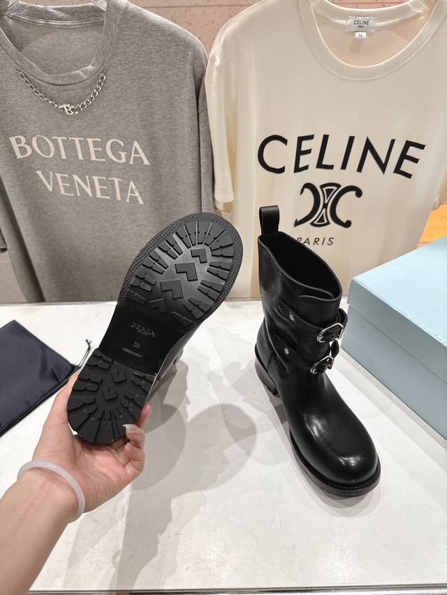 High-quality factory-made Prada F041 2025Ss latest thick-soled double buckle Martin boots, riding boots, short boots. A very stylish and timeless design. Original replica of a runway style riding boot, super classic and versatile, super durable and stylish, a slimming shoe, simple and elegant. Upper: Imported washed cowhide. Lining: Cowhide. Insole: Cowhide. Outsole: Original genuine leather combination outsole. Sizes: 35-40. Size 40 is custom-made and non-refundable.