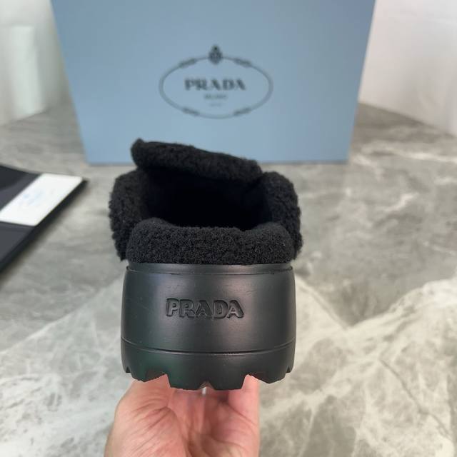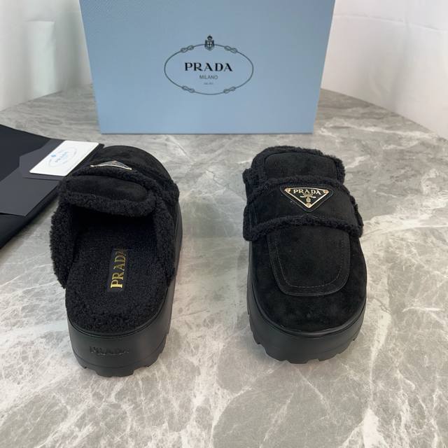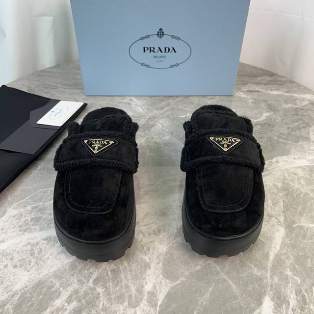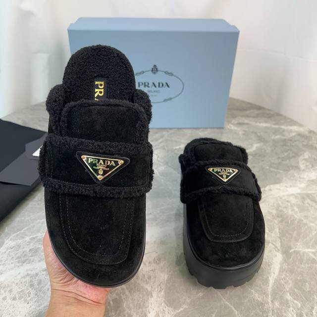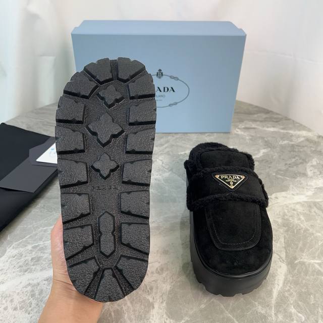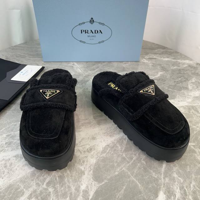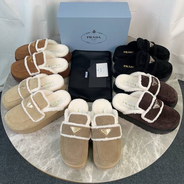 Latest P brand fleece slippers. Outer: Imported high-gloss cow suede. Lining: Imported lamb's wool. Mat: Lambswool. Sole: Ultra-light rubber foam sole, 6cm thick. Features the iconic triangle logo and original packaging. Size: 35-41. Custom sizes 40 and 41 are available.