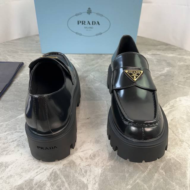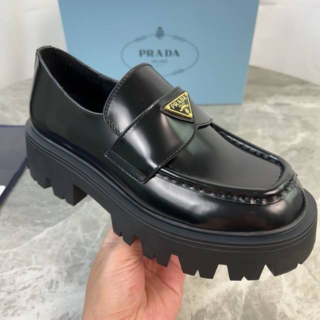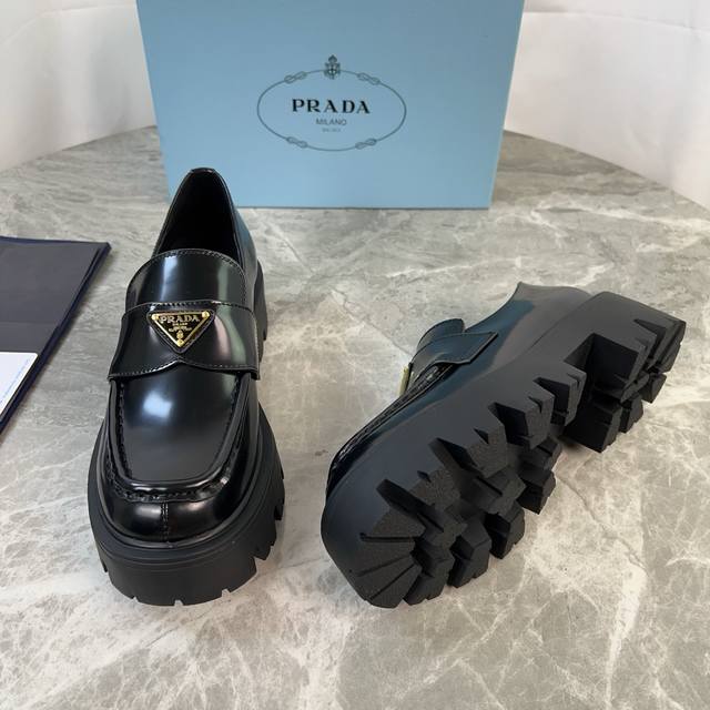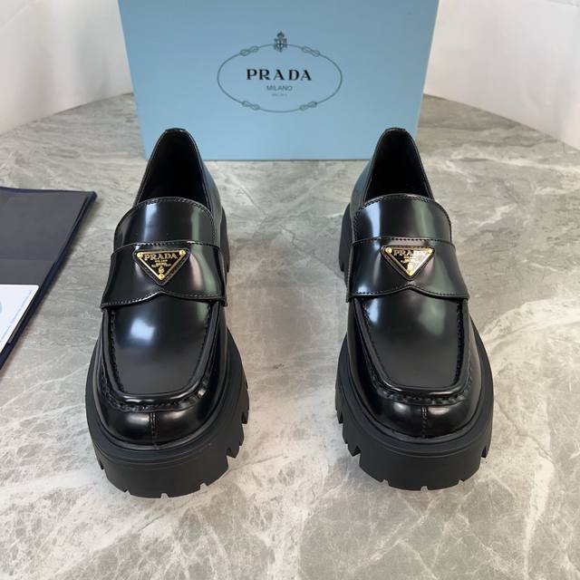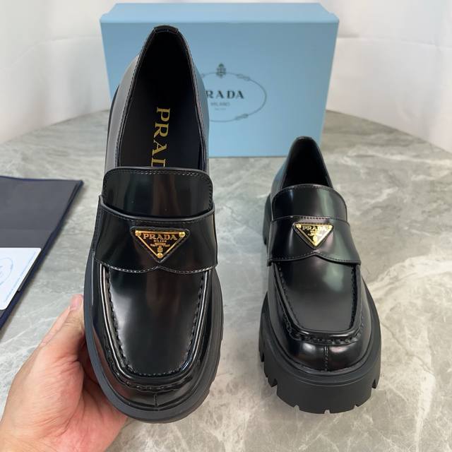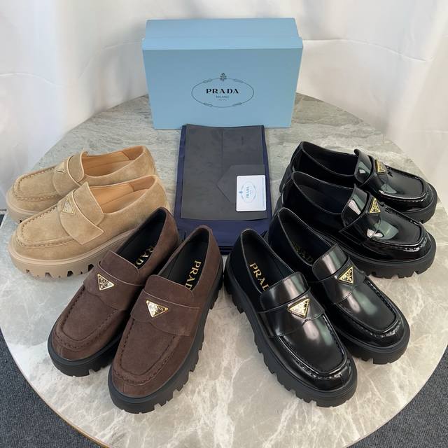 model. Upper: Imported split-edge beads, cow patent leather, high-gloss cow suede. Lining: Imported calfskin. Pad: Imported calfskin. Sole: Original craftsmanship, 6cm thick sole. Features the iconic triangle logo and original packaging. Size: 35-42 (41.42 custom sizes available).