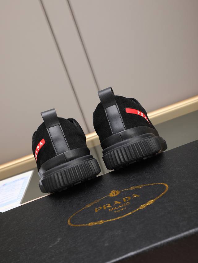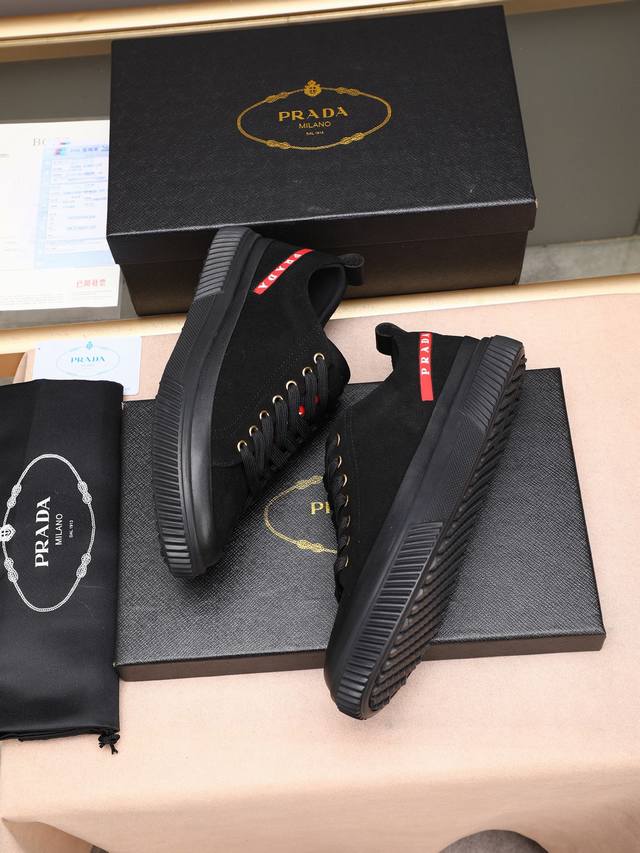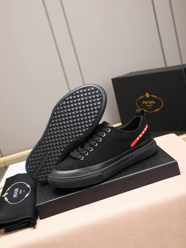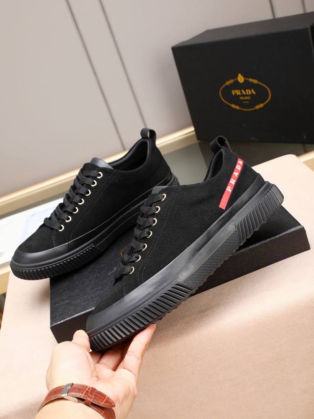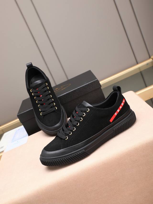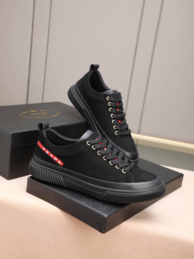p Prada's new men's casual shoes. These versatile and casual shoes are crafted from top-grain cowhide and feature a rubber outsole for exceptional comfort. Soft, clean lines create a sporty silhouette. The sole is lightweight yet stable, and the signature logo on the tongue adds a touch of class. Sizes: 38-44-45. Customizable in multiple colors!