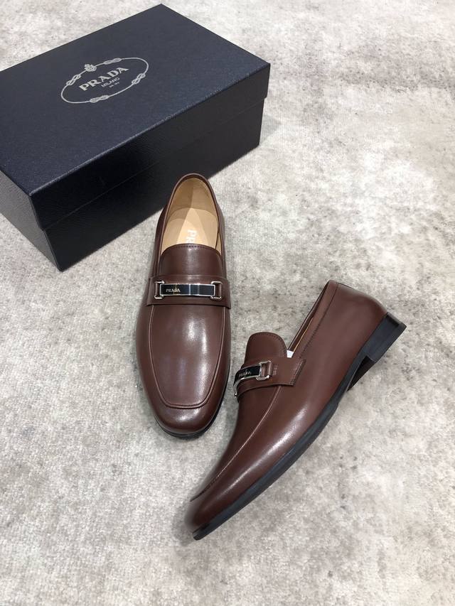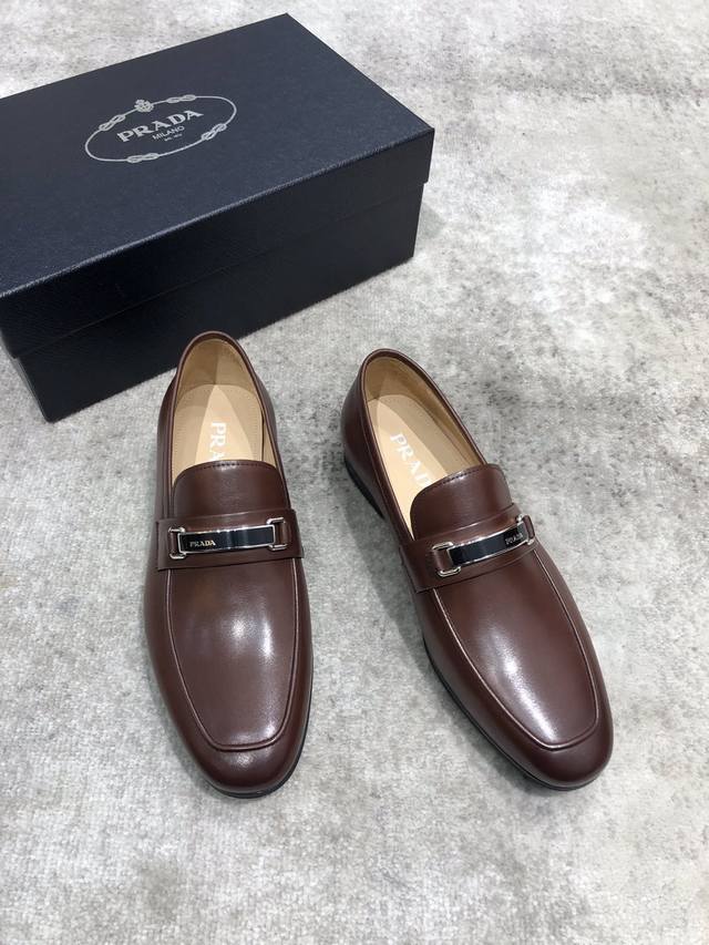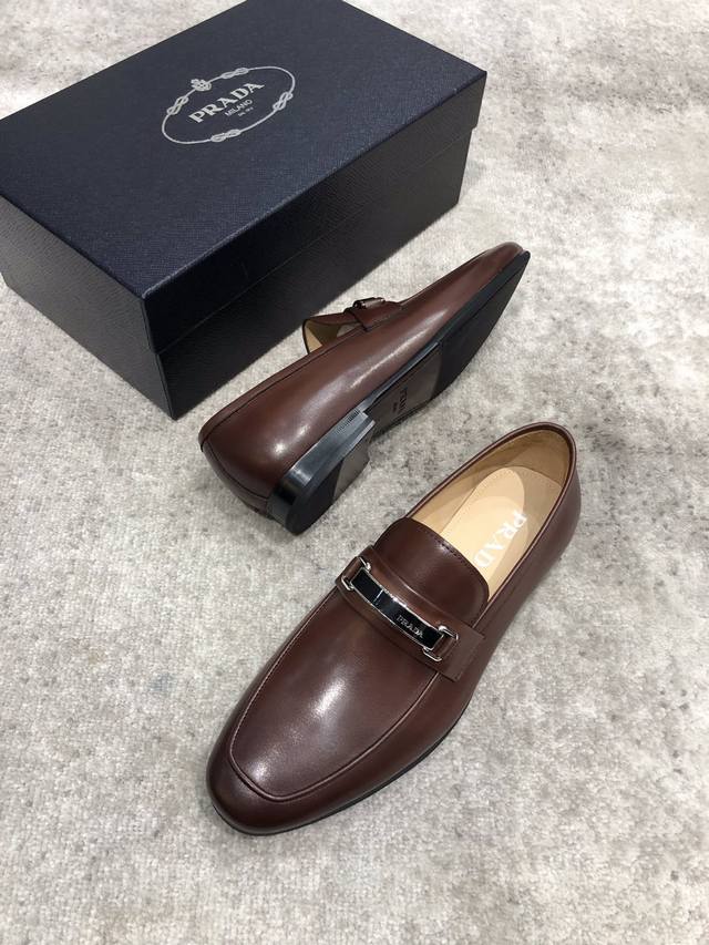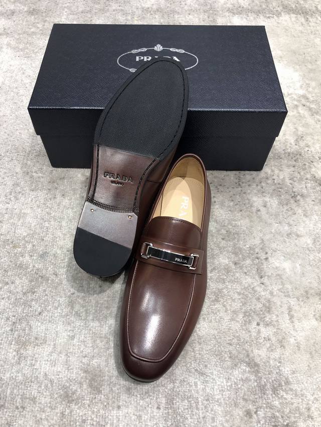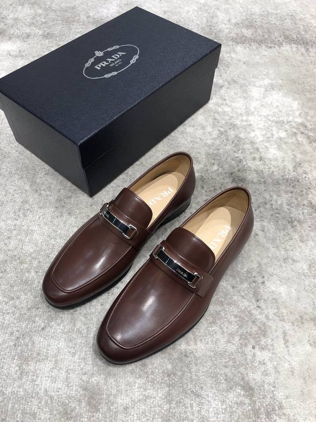 Prada high-end men's casual leather shoes, imported cowhide upper with open edge beading, hand-brushed color, water-dyed cowhide lining, genuine leather outsole, impeccable details, standard sizes 39-44, 38.45. Custom orders are non-refundable and non-exchangeable. In stock.