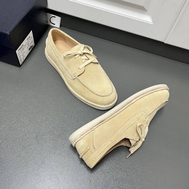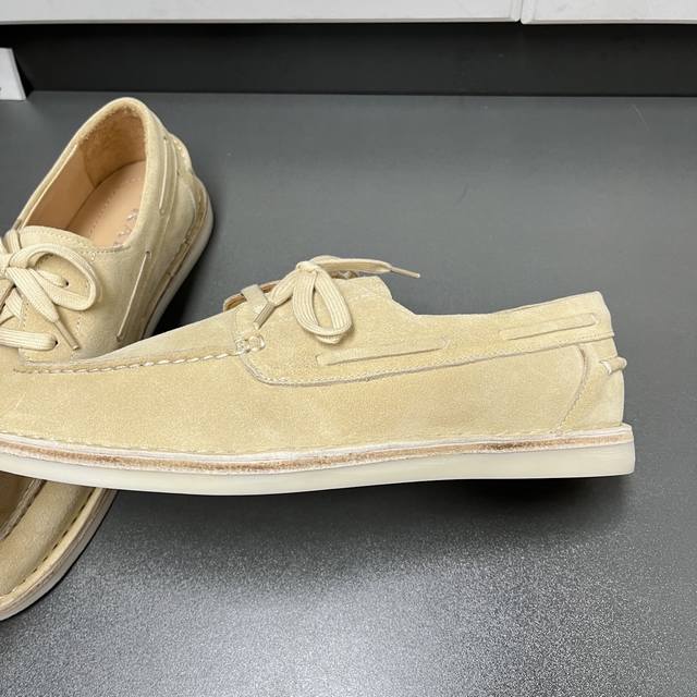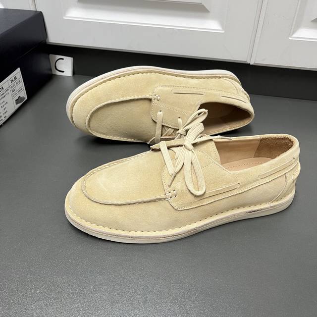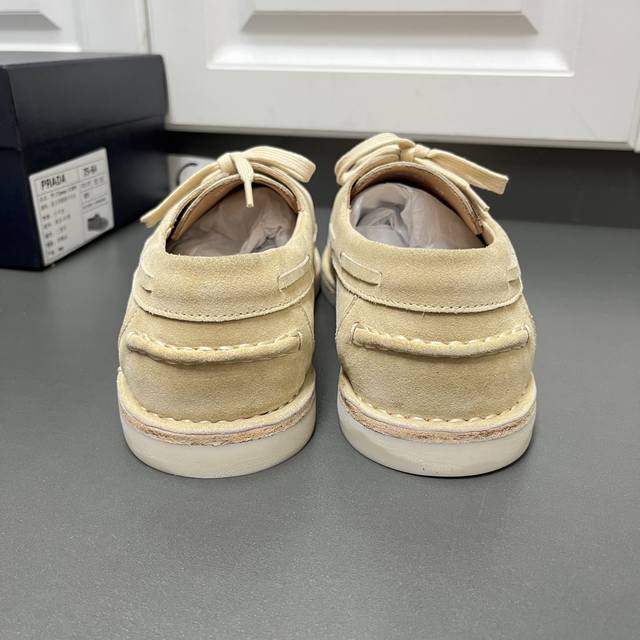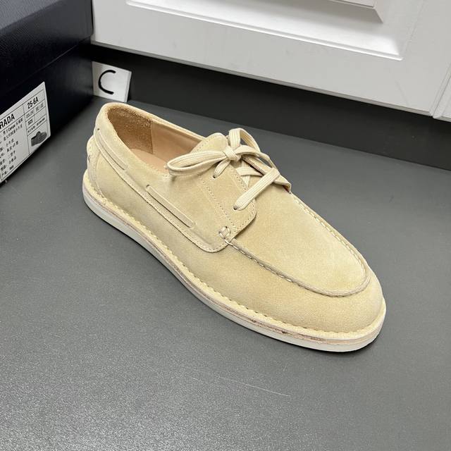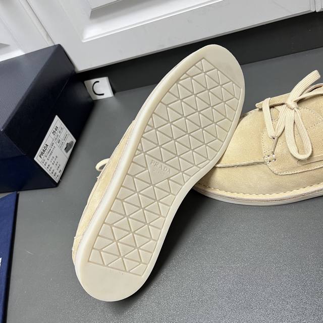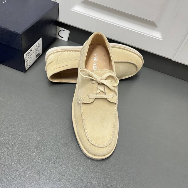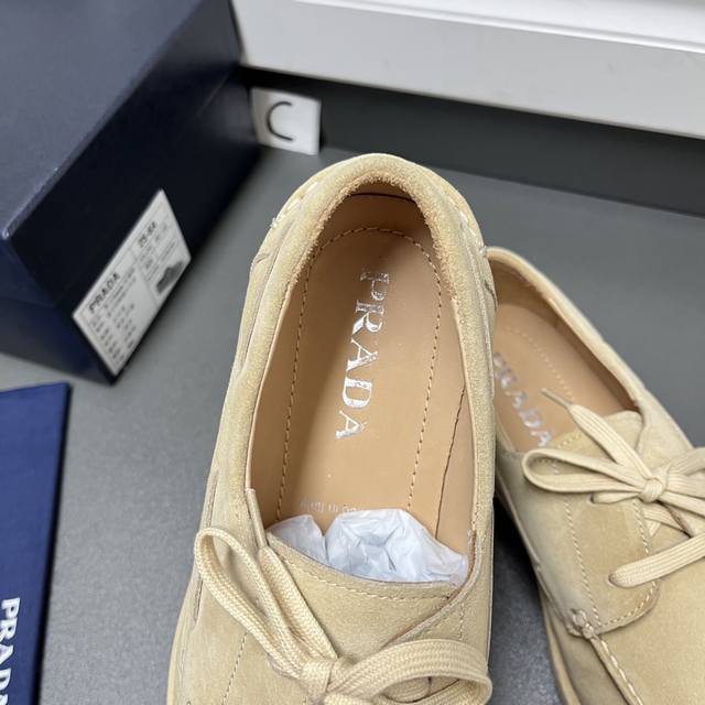 Prada Men's New Lace-up Leather Loafers. Crafted from flocked split cowhide leather, these loafers combine classic design with handcrafted details, blending sophistication with casual comfort. Featuring a lace-up design, lace-up detailing with visible stitching, a 1.5cm white rubber sole with leather welt, natural-dyed calfskin lining, and a silver-label calfskin insole, the style is simple and elegant. Sizes: 39, 40, 41, 42, 43, 44. Comes in khaki original box with dust bag.